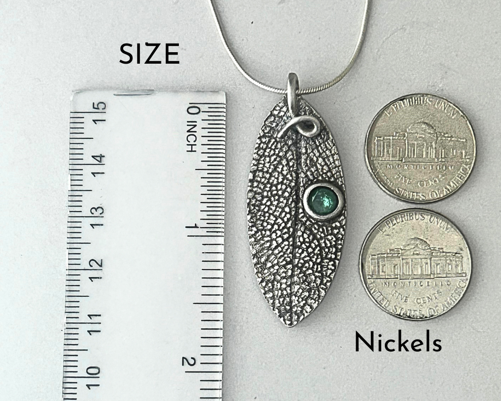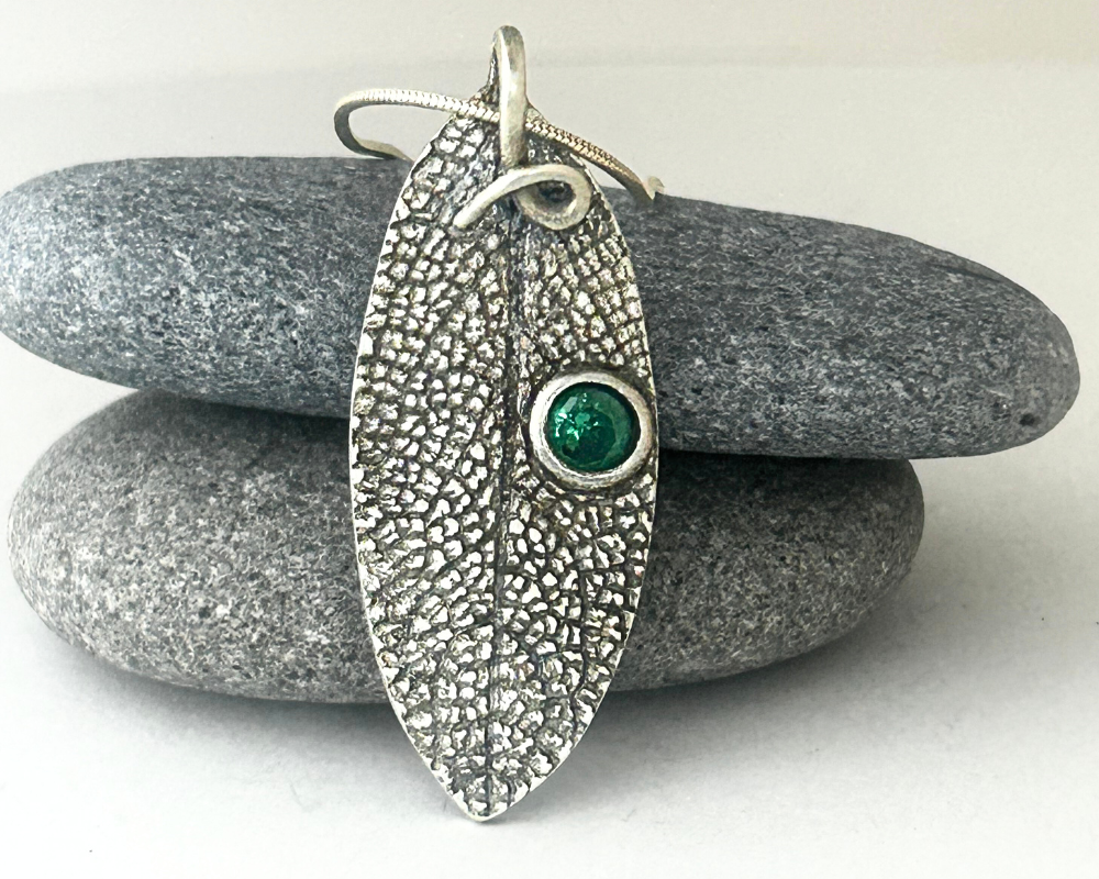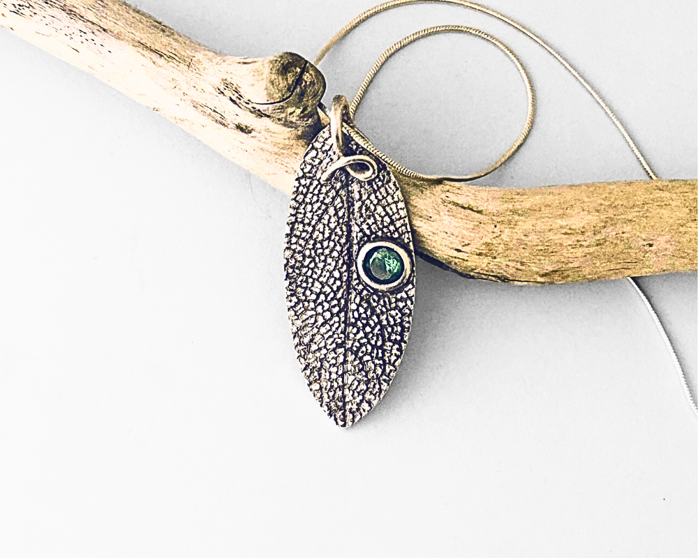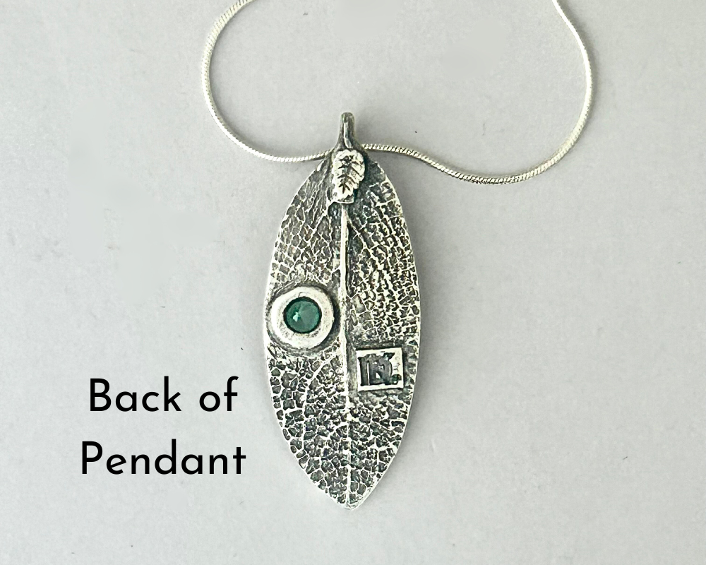 I handcrafted this artisan piece as a testament to the beauty of nature. Crafted from sterling silver metal clay, the pendant captures the intricate details of a real sage leaf, immortalized through a two-sided mold. The pendant not only embodies the essence of natural elegance but also showcases a harmonious blend of textures and materials. The addition of a vibrant green tourmaline crystal adds a touch of color and sophistication, enhancing the overall aesthetic and making it a standout accessory. This unique piece is perfect for those who appreciate the fusion of craftsmanship and nature, offering both visual appeal and a story of creativity and inspiration.