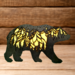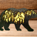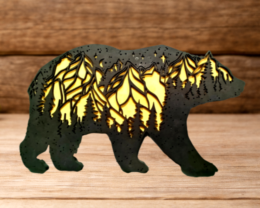 Introducing the 2 Layer Lasered Bear! This stunning piece of art is guaranteed to add a pop of color and brightness to any room. The intricate laser cut design features a bear silhouette with a radiant background, creating a beautiful visual effect that looks like light shining through. Perfect for nature lovers or anyone looking to add a touch of whimsy to their home decor. Hang it on your wall to bring a little bit of the outdoors inside. Don't wait, get your 2 Layer Lasered Bear today!
