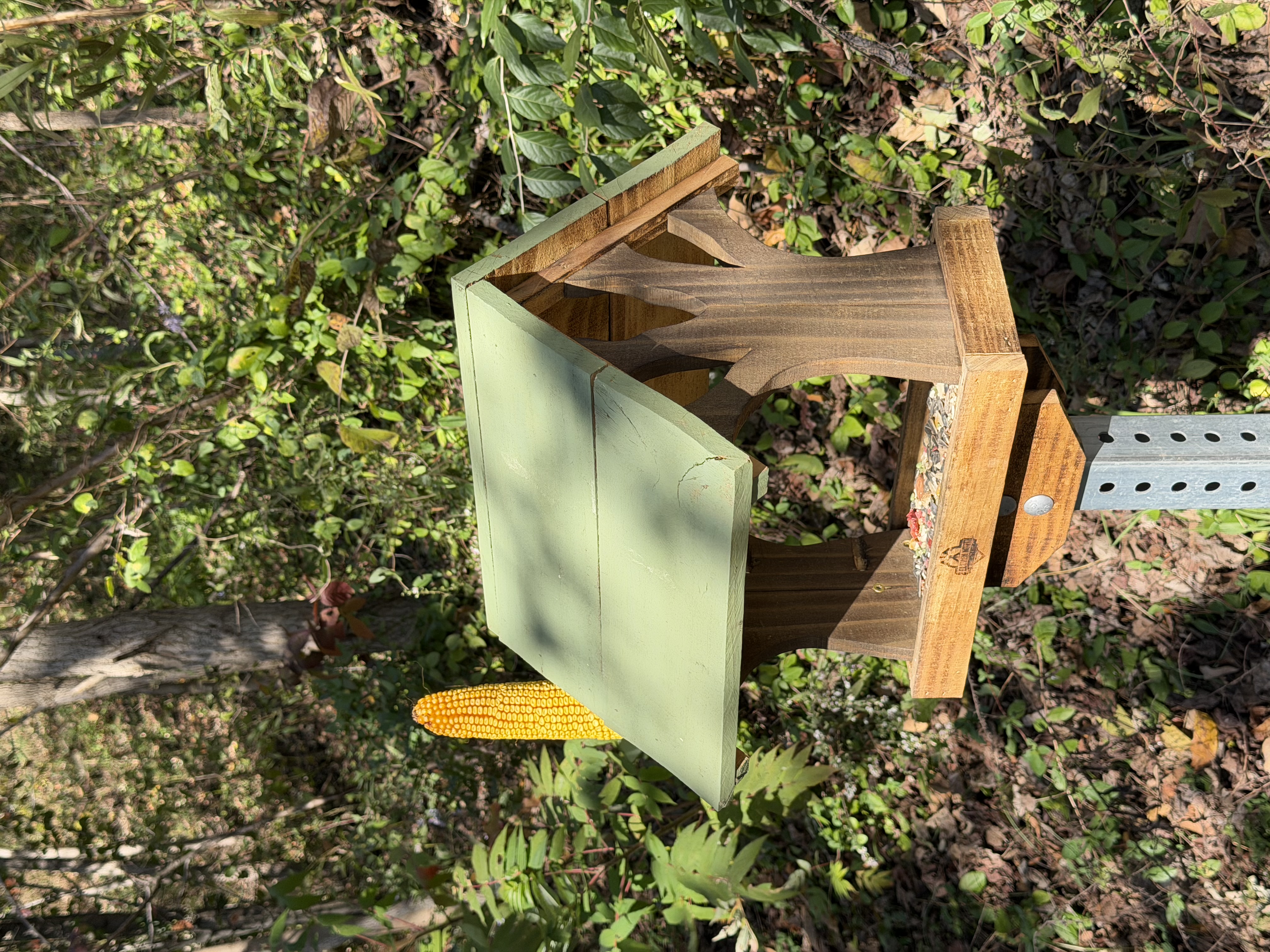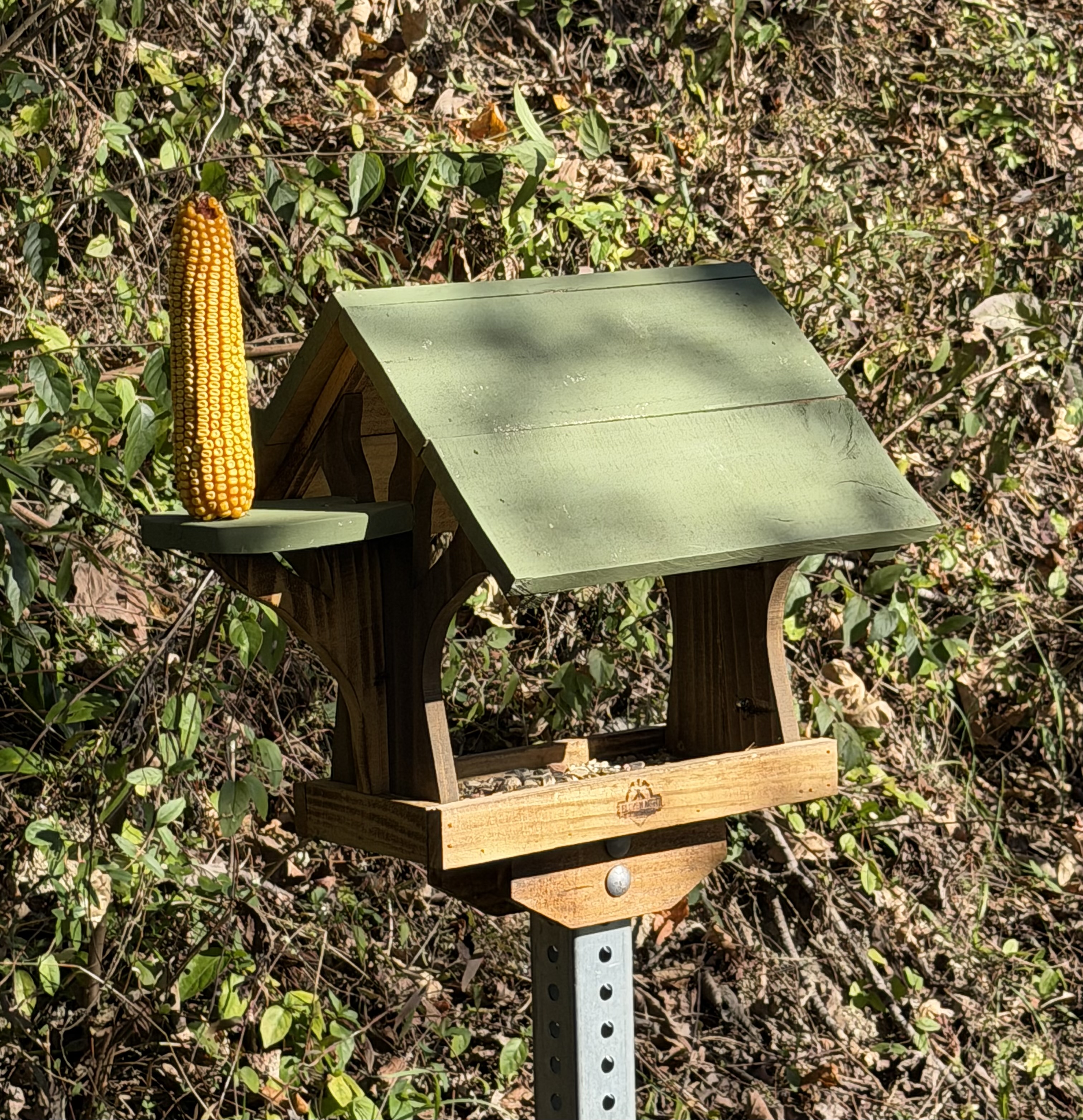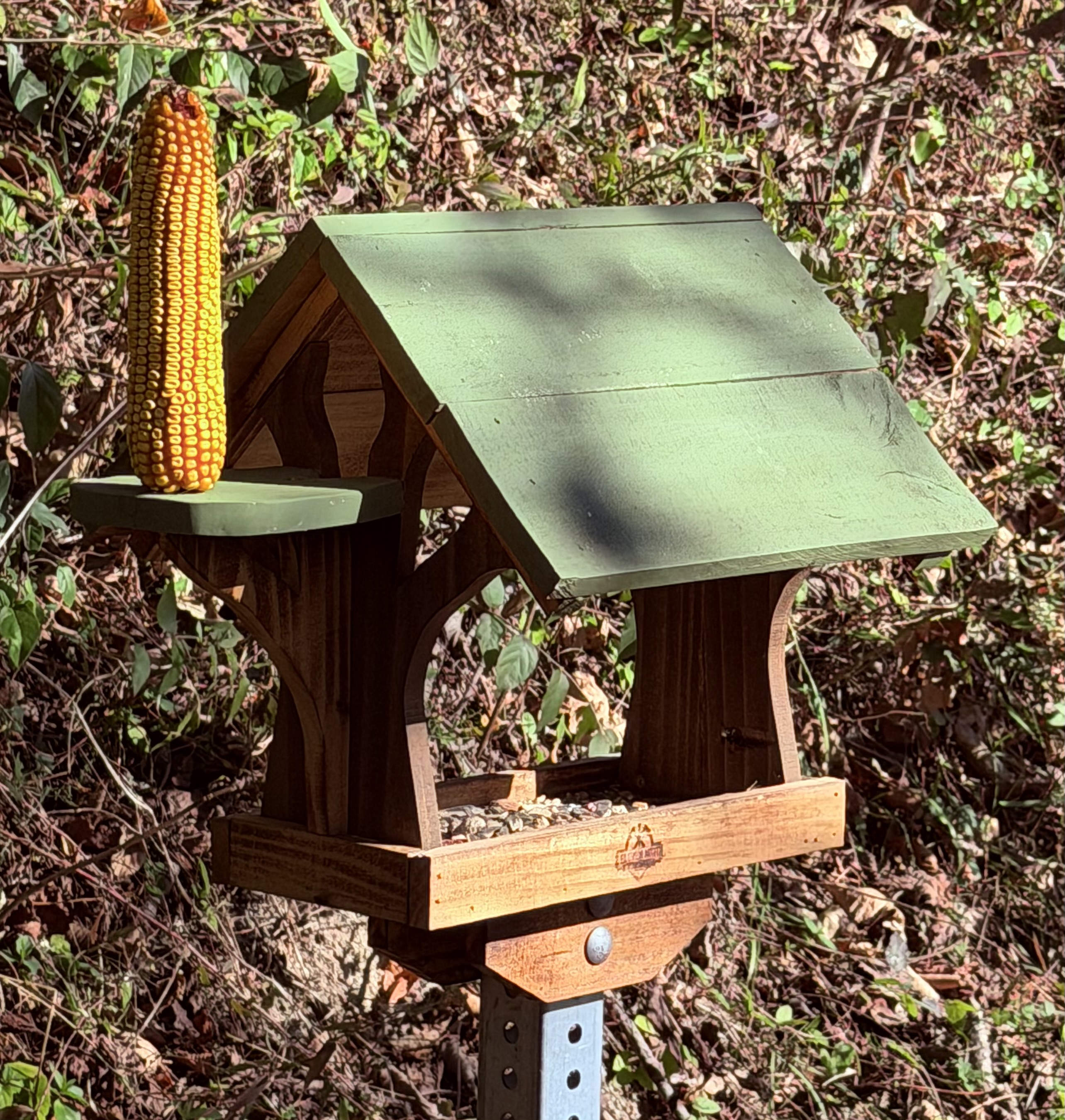 This all cedar handcrafted made in Pennsylvania birdfeeder has a separate branch just for the squirrels. Feed and corn not included.