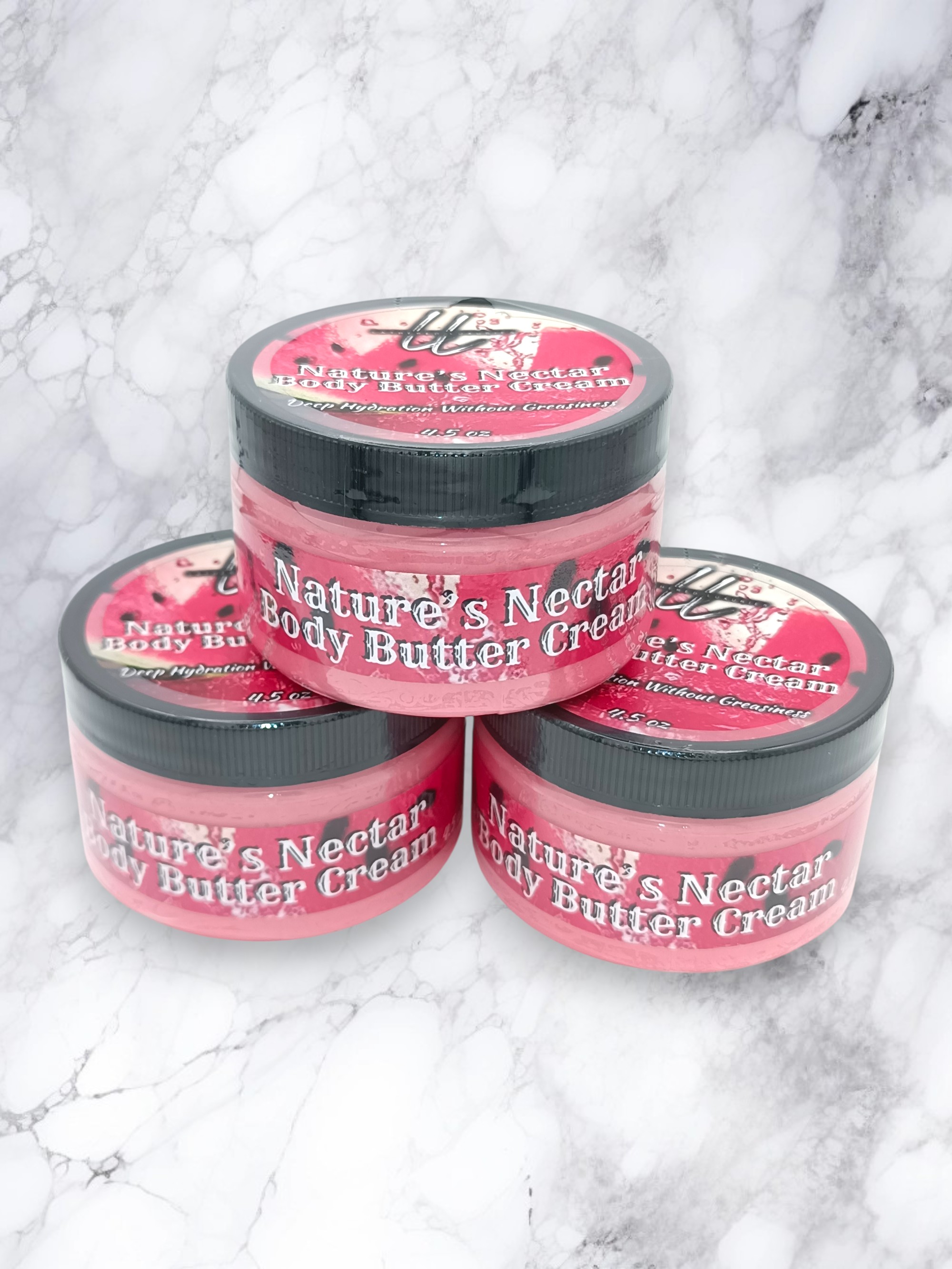 Every jar of Nature’s Nectar Watermelon Emulsified Body Butter is handcrafted in small batches to ensure exceptional quality and freshness. We blend nourishing plant oils with rich butters to create a silky, lotion‑like butter that melts effortlessly into the skin.