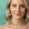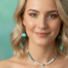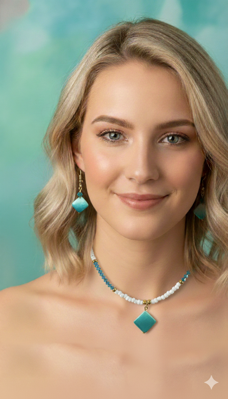 This colorful handmade piece features a captivating square teal-colored pendant, radiating a tranquil blue-green hue. The pendant suspends from a beautifully crafted necklaces, adorned with smooth, pristine white seed beads that transition into dazzling faceted blue-green bicone crystals. Interspersed along the design are elegant gold-tone accent beads, adding a touch of sophisticated gleam.