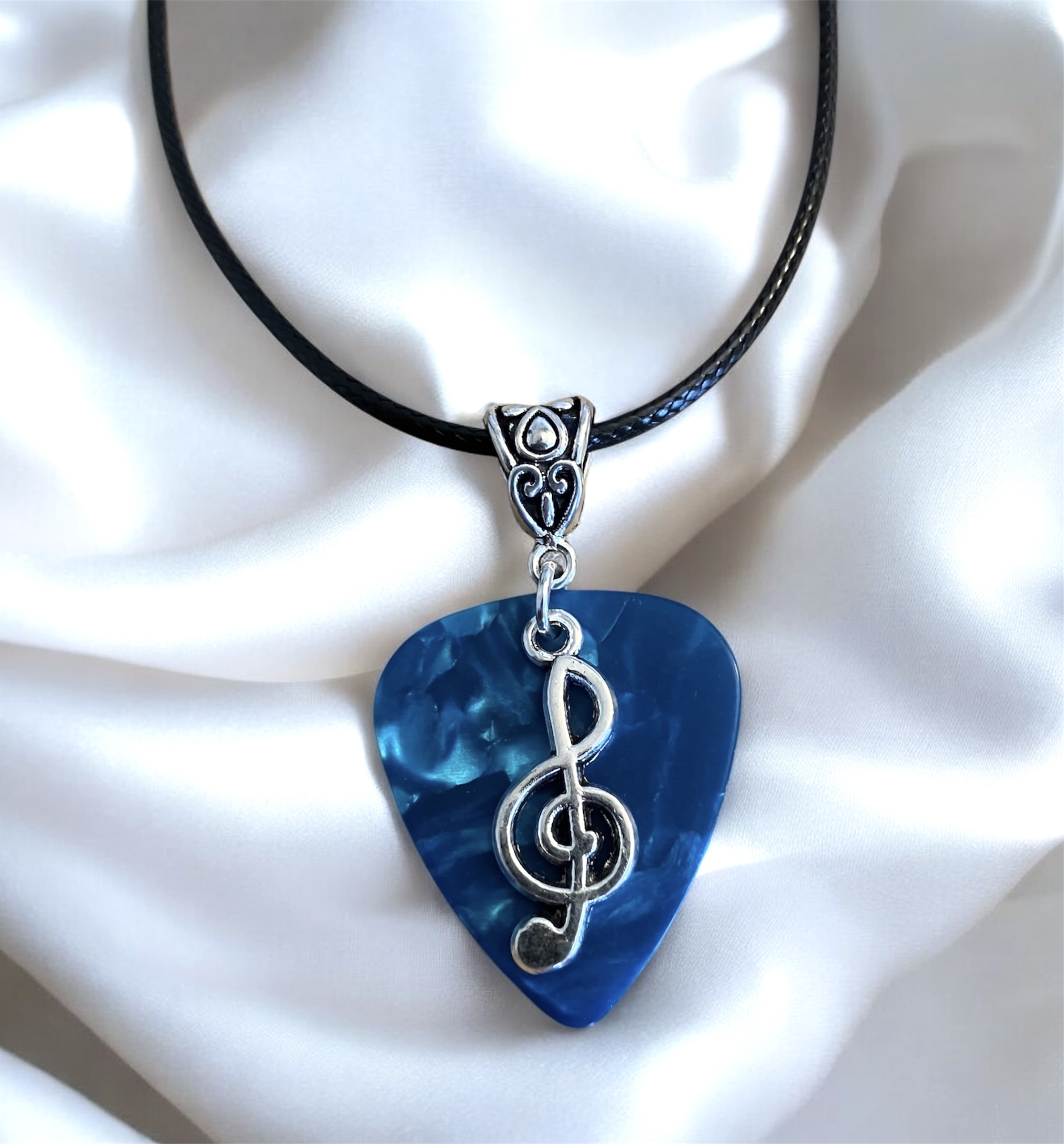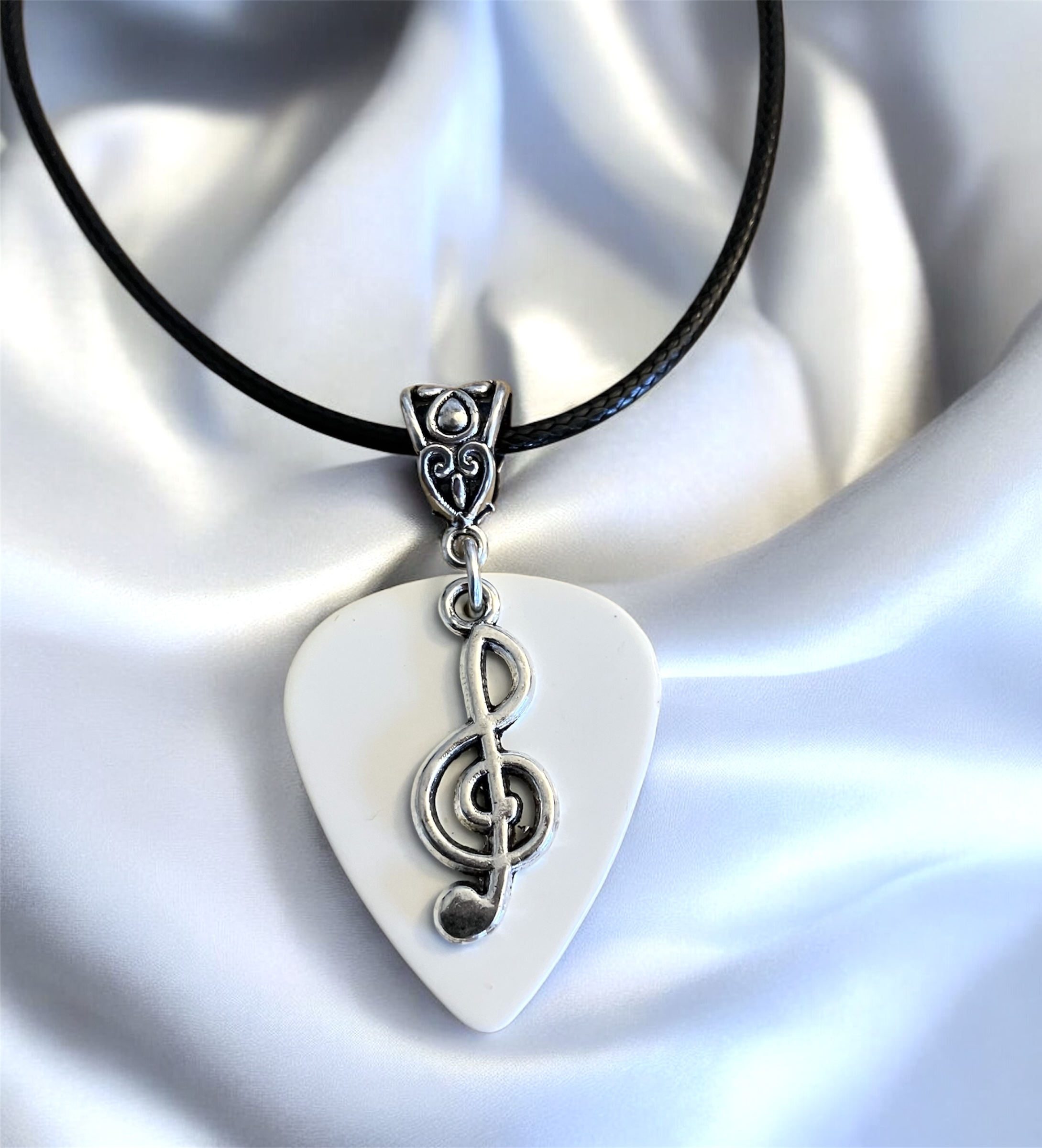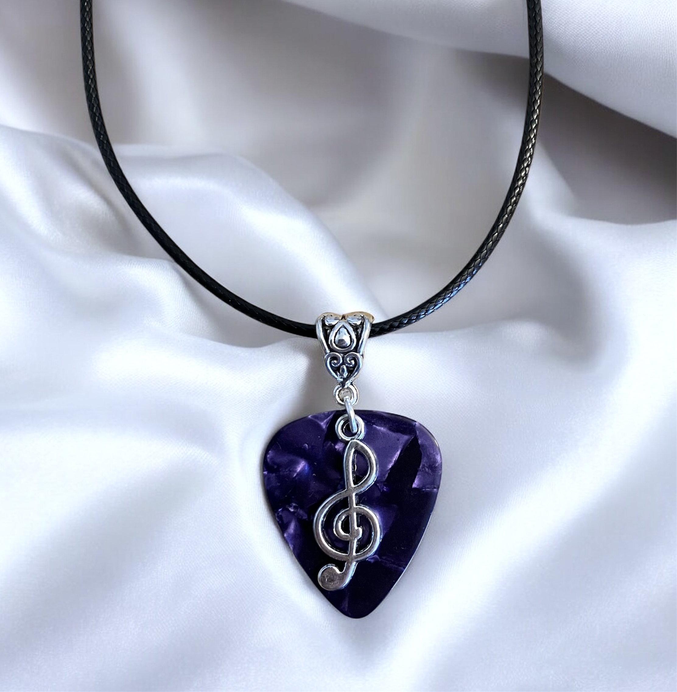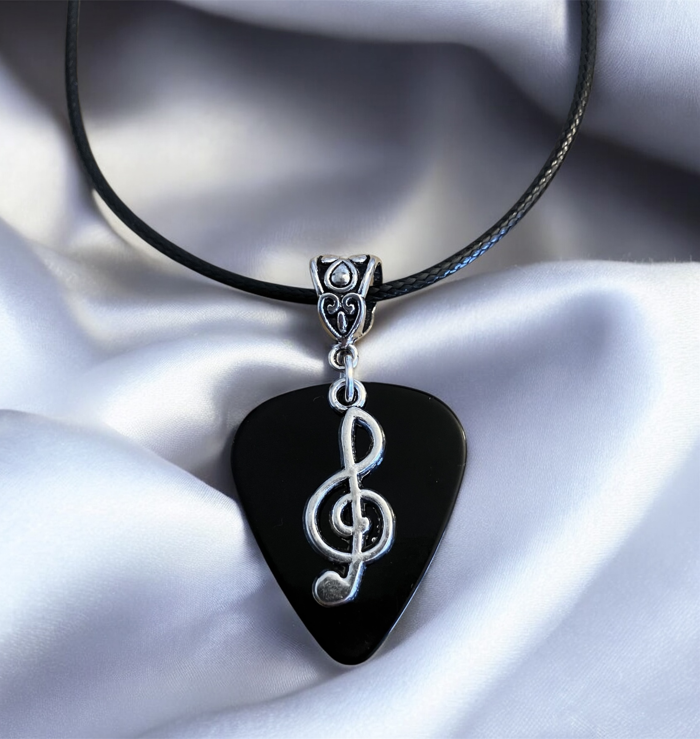 Each guitar pick is hand stamped. Silver Plated Cleft Note Charms are added along with a silver plated bail and finished with an adjustable black leather necklace.