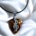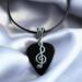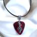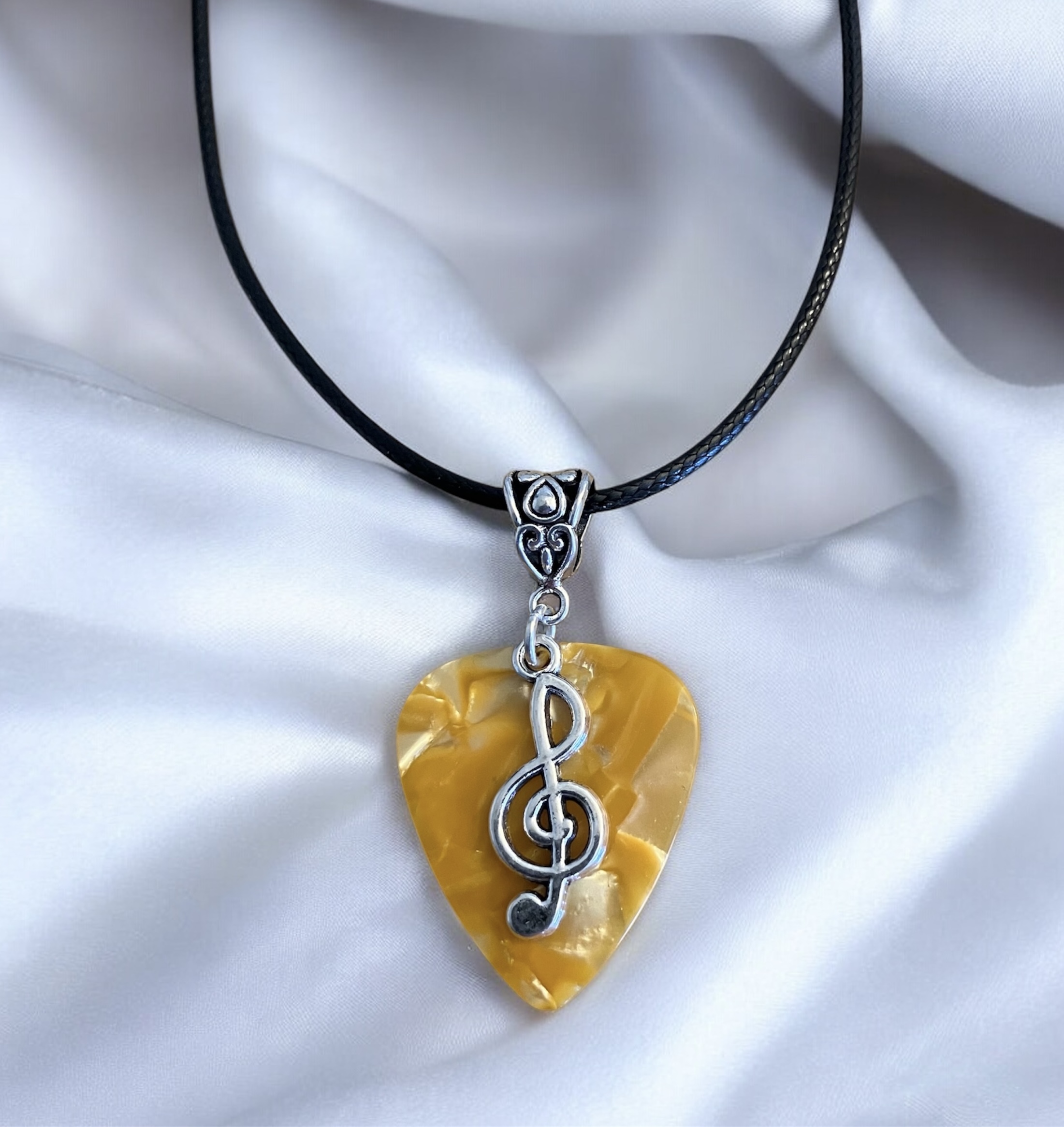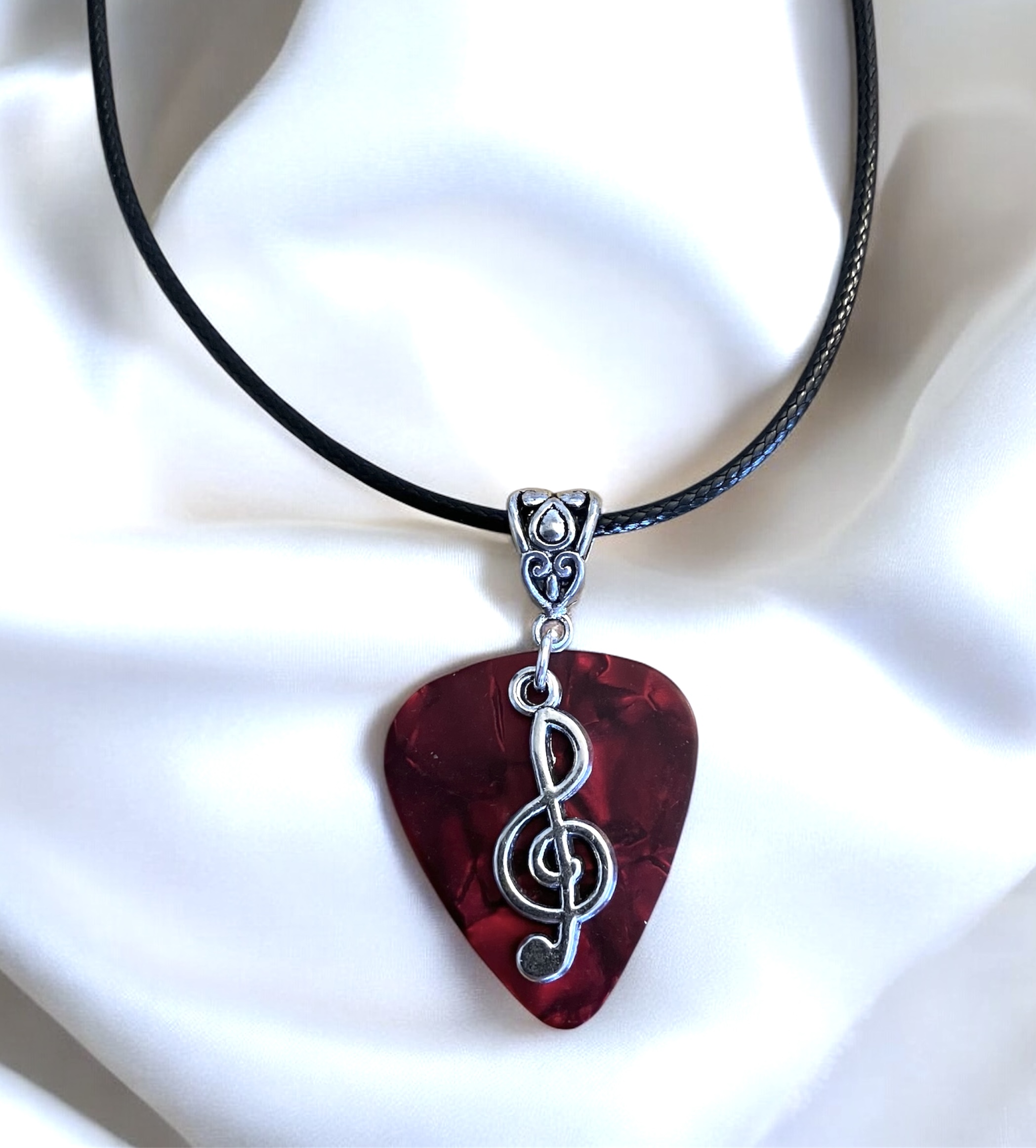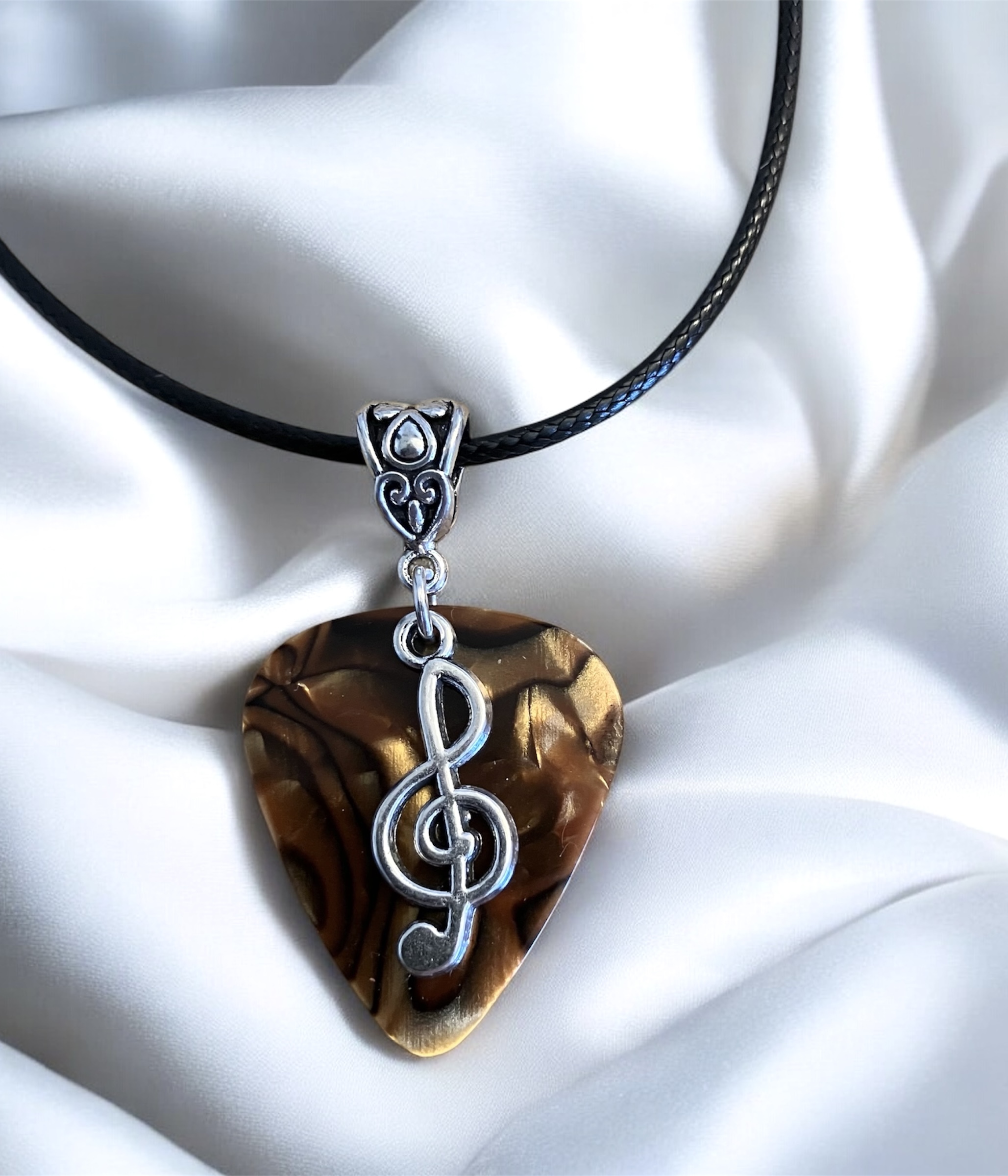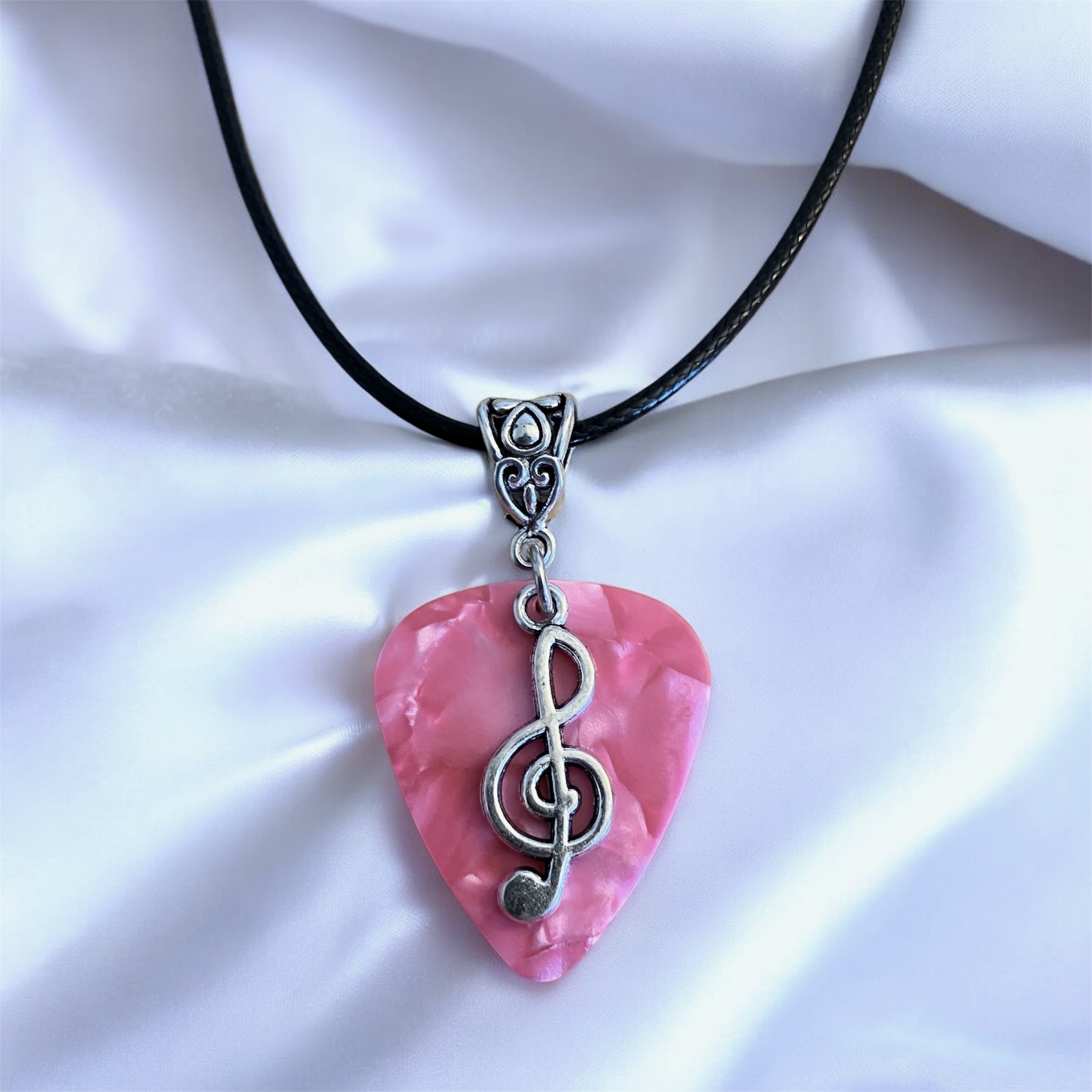 Each guitar pick is hand stamped. Silver Plated Cleft Note Charms are added along with a silver plated bail and finished with an adjustable black leather necklace.