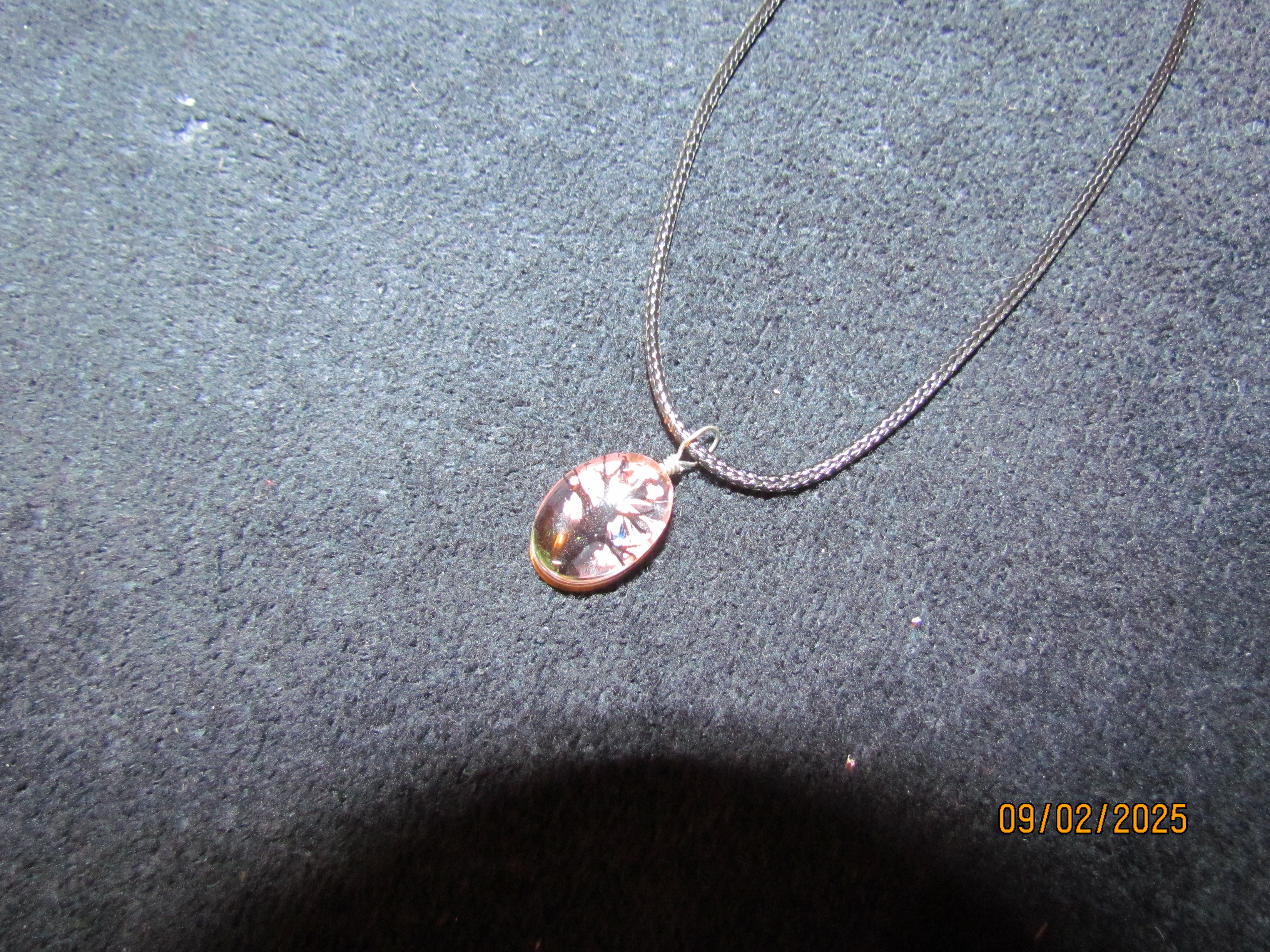 this necklace is 19 inches long. it is amber in color with a tree inside of it.