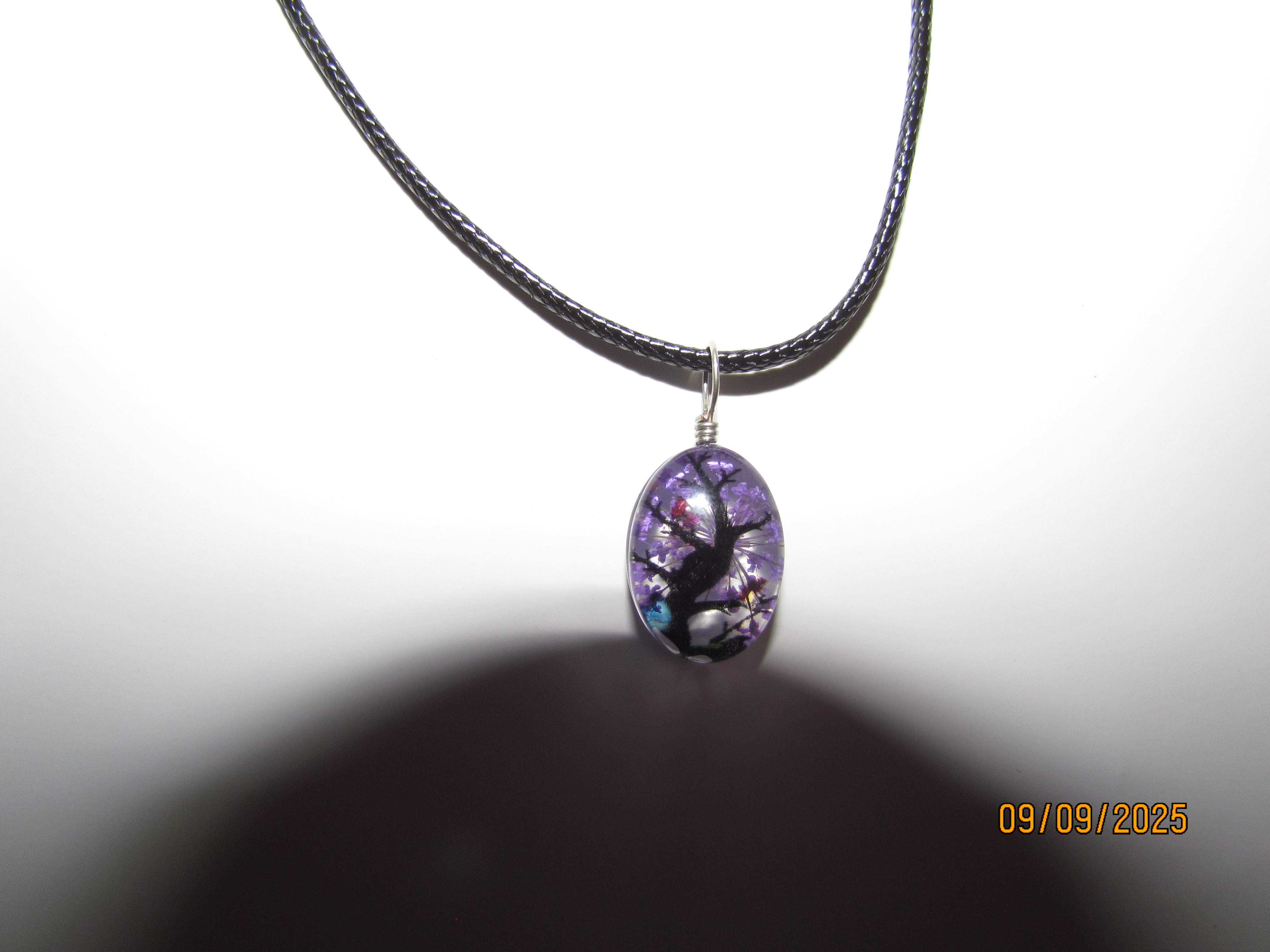 this necklace has a purple tree inside. it is 24 inches long.