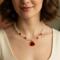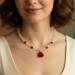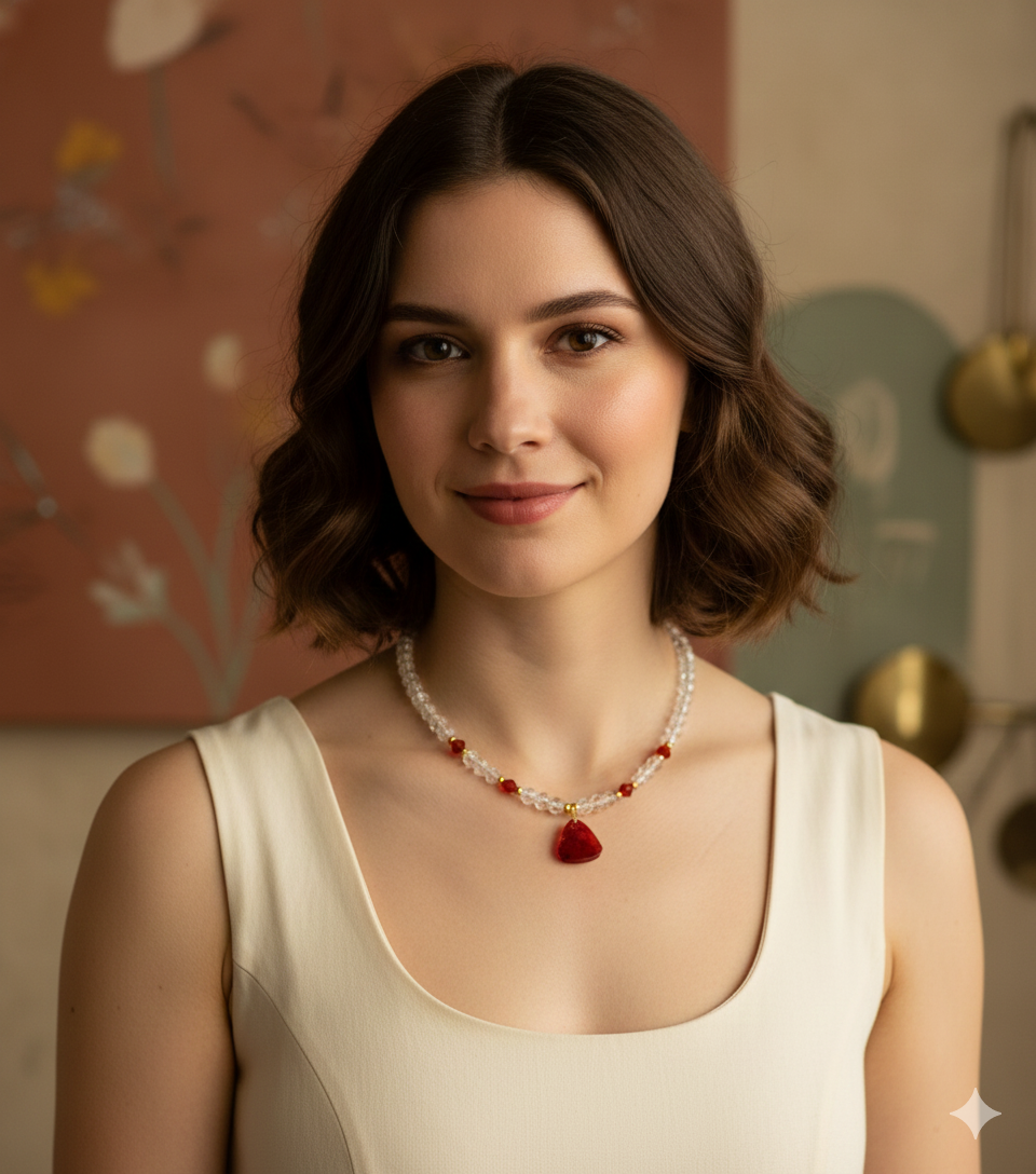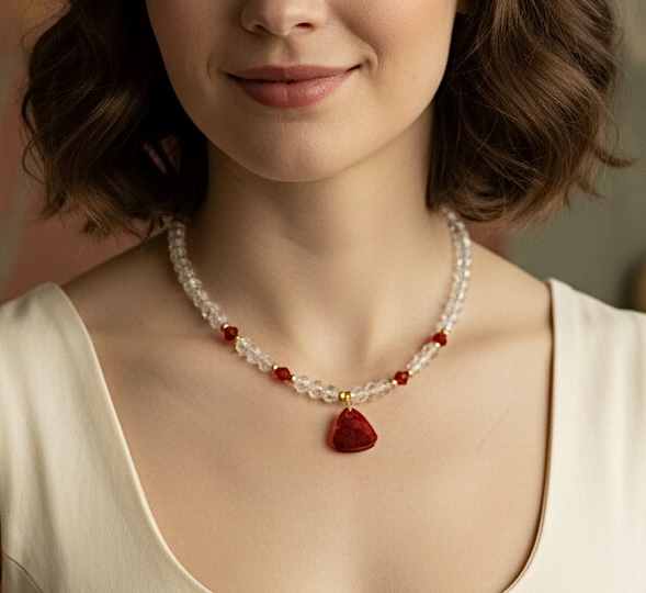 Elevate your style with this eye-catching necklace, a perfect blend of modern elegance and classic charm. Crafted with a luminous string of clear, round crackle beads, this necklace creates a captivating sparkle that catches the light beautifully. Interspersed are 4 vibrant red bicone beads, adding pops of rich color and sophisticated contrast. Delicate gold-tone spacer beads further enhance the design, leading down to a striking triangular-shaped resin pendant in a deep, lustrous red.