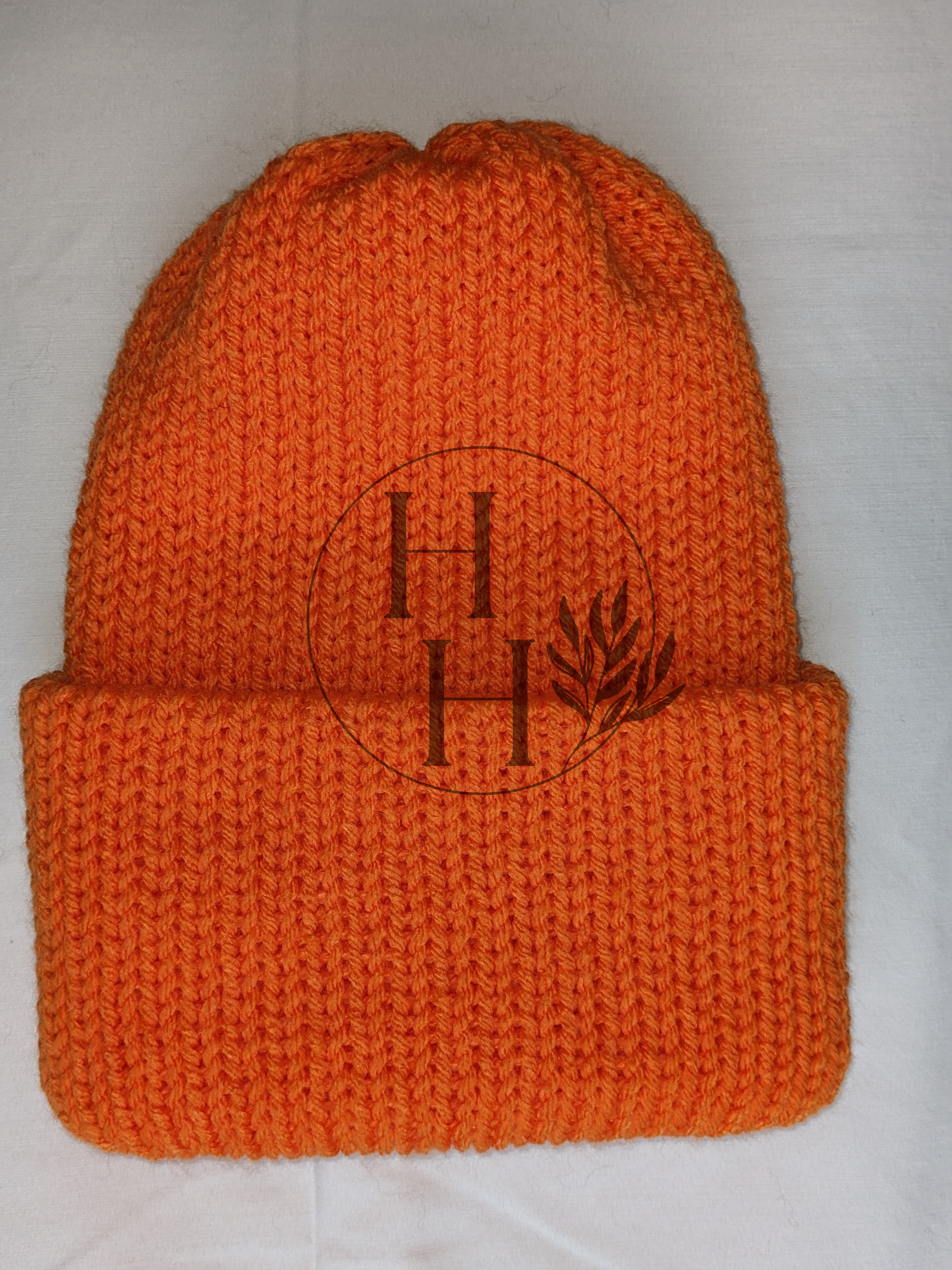 Simple knit beanie in a cuffed style using 100% acrylic yarn in bright neon colors. Fits heads up to 23" with 1-2" of stretch.