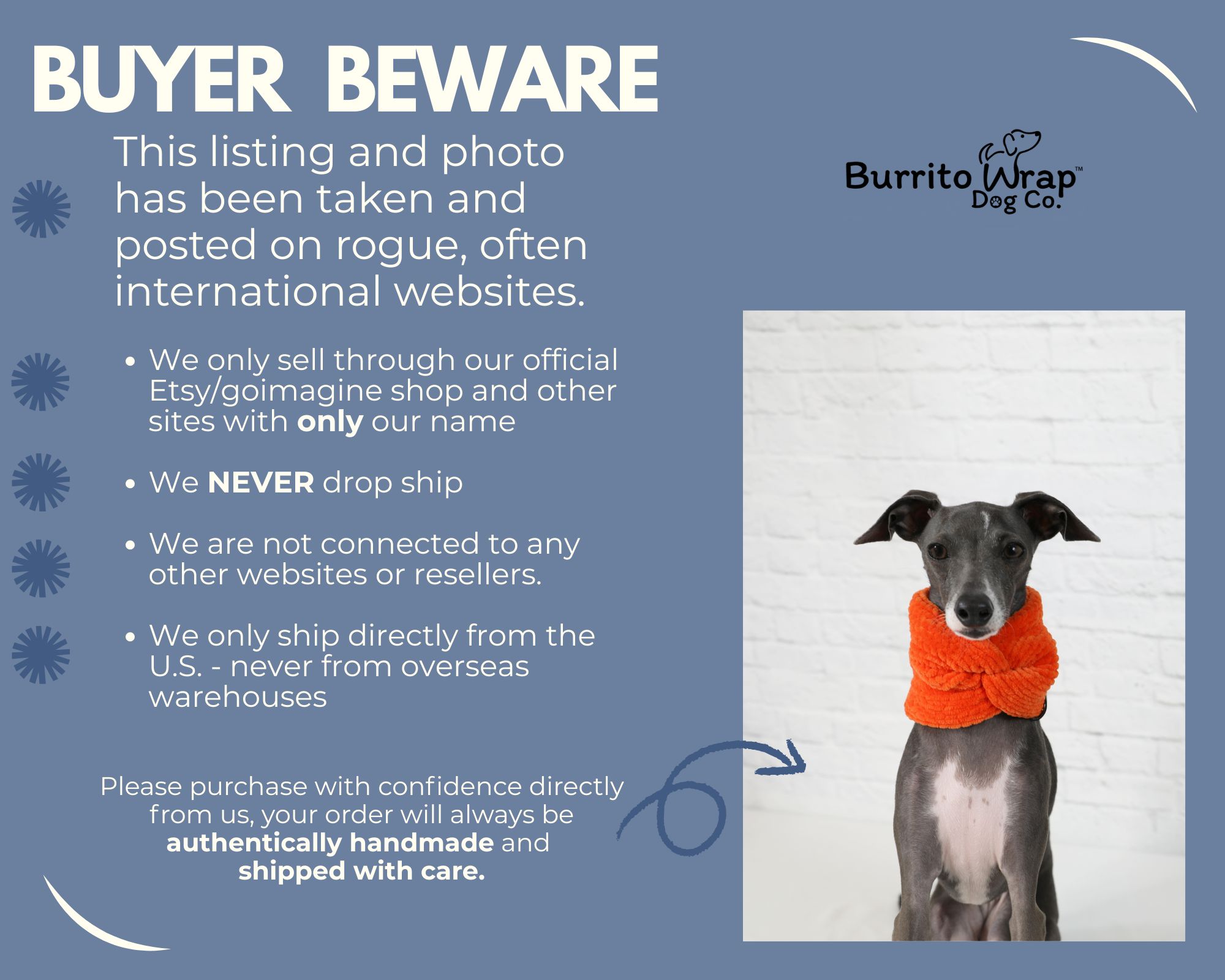 I want you to be thrilled with your Burrito Wrap Dog Co product and I stand behind the quality of every item that's made. If something does not meet your expectations, please contact me so I can make it right. (see below)