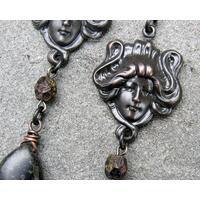 NEREIDS Handmade art nouveau earrings featuring black patina copper art nouveau maiden pendants. Dangling from these pendants are picasso czech glass beads, river shell beads in ocean hues, and 6mm pacific opal swarovski beads. Earrings are connected to hypoallergenic patina black fish hook earwires via aqua / ocean colored picasso glass beads.