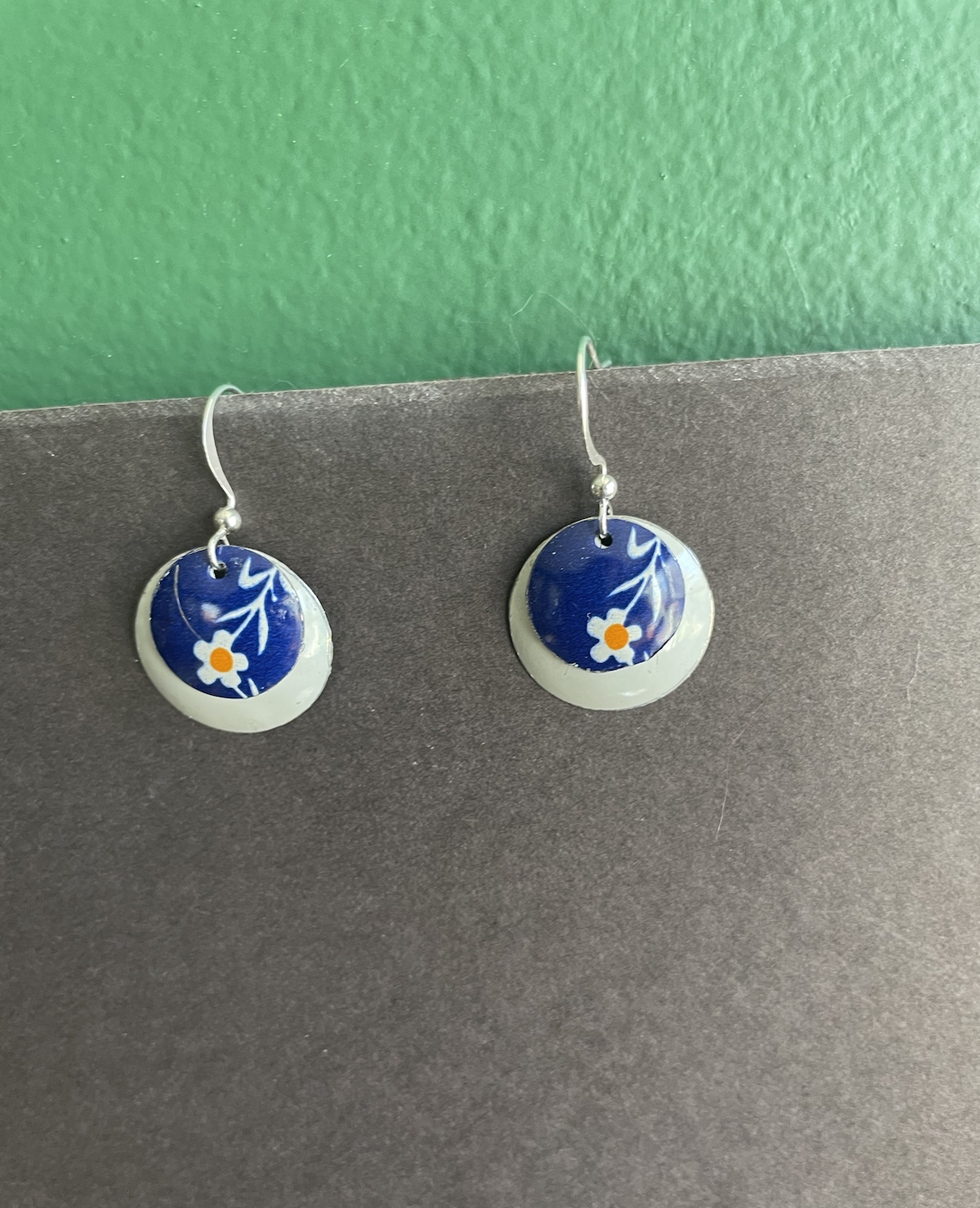 Tins are very light making them ideal for earrings as they don't weigh down your ears as the day goes on. Did you know the proper term for working with tin is "tinkering"? That made me really happy. I literally tinker in my art studio! I use old cookie tins, tea tins, and the like, break them down, and hand cut them into shapes and hand-hammer them into the 3-D shape I want them to be, finish and polish them, before putting them together like any other jewelry.