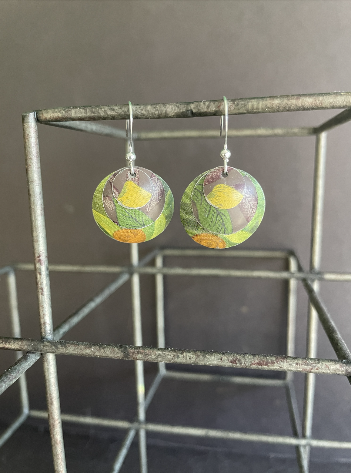 Tins are very light making them ideal for earrings as they don't weigh down your ears as the day goes on. Did you know the proper term for working with tin is "tinkering"? That made me really happy. I literally tinker in my art studio! I use old cookie tins, tea tins, and the like, break them down, and hand cut them into shapes and hand-hammer them into the 3-D shape I want them to be, finish and polish them, before putting them together like any other jewelry.