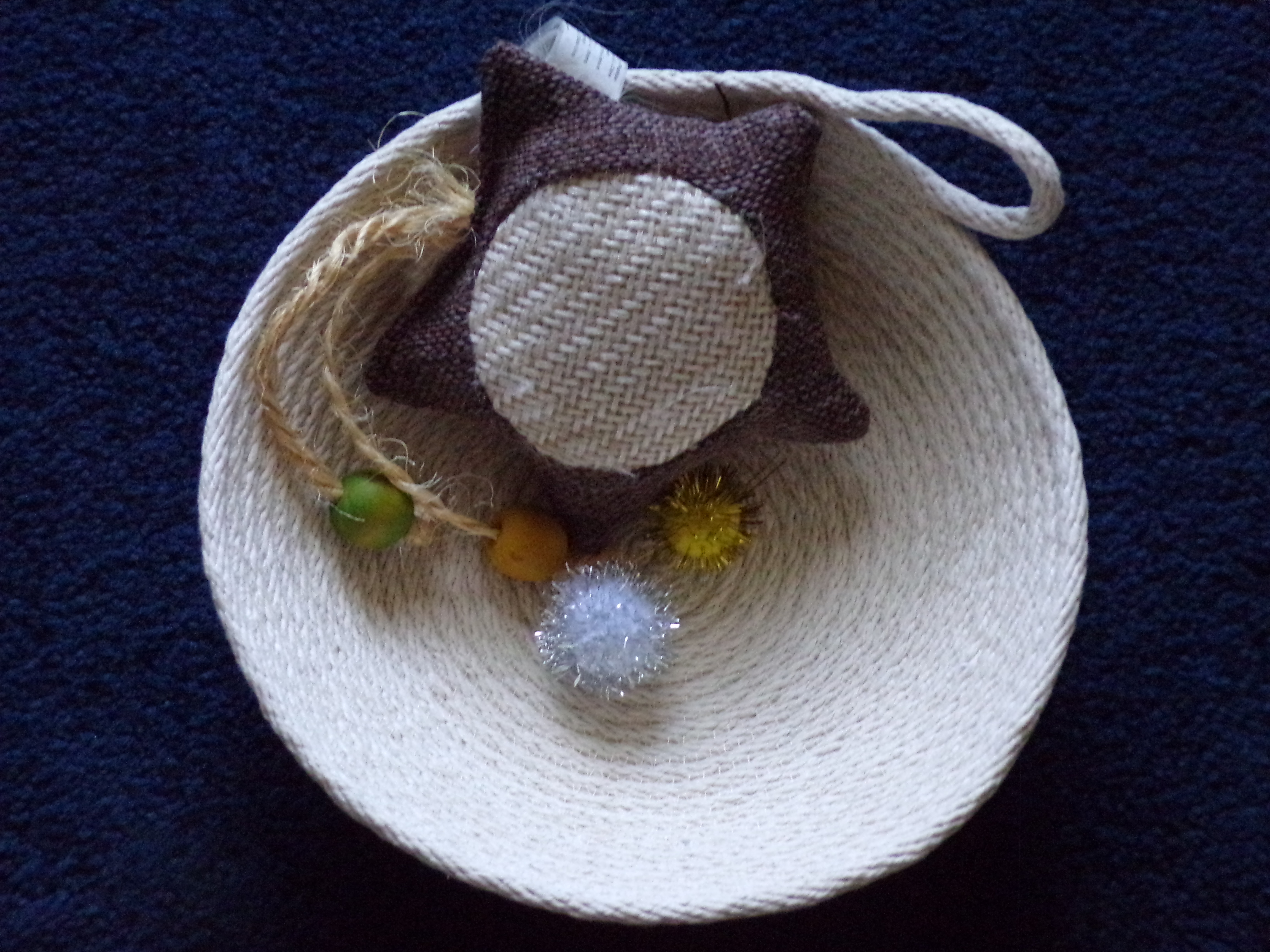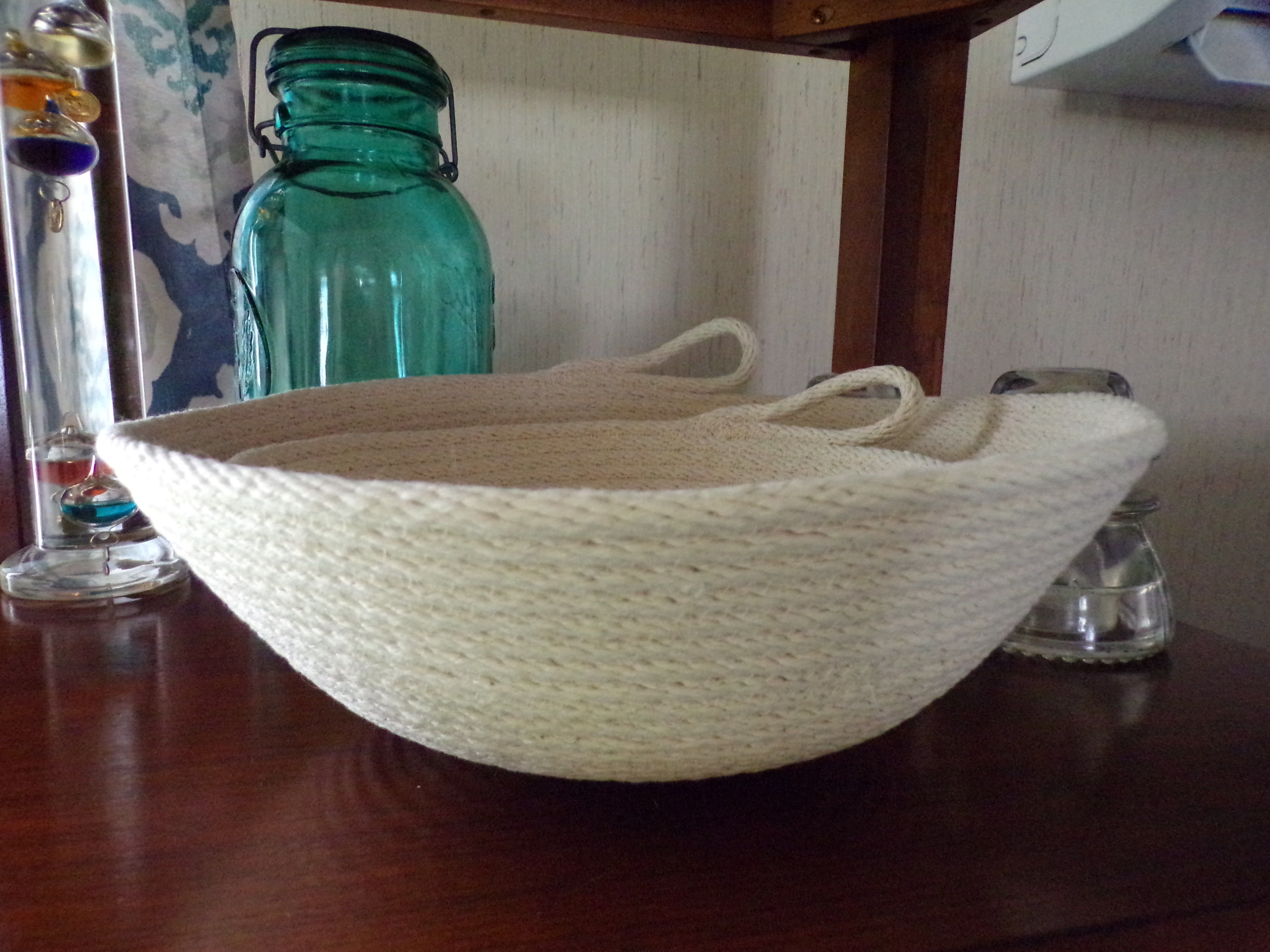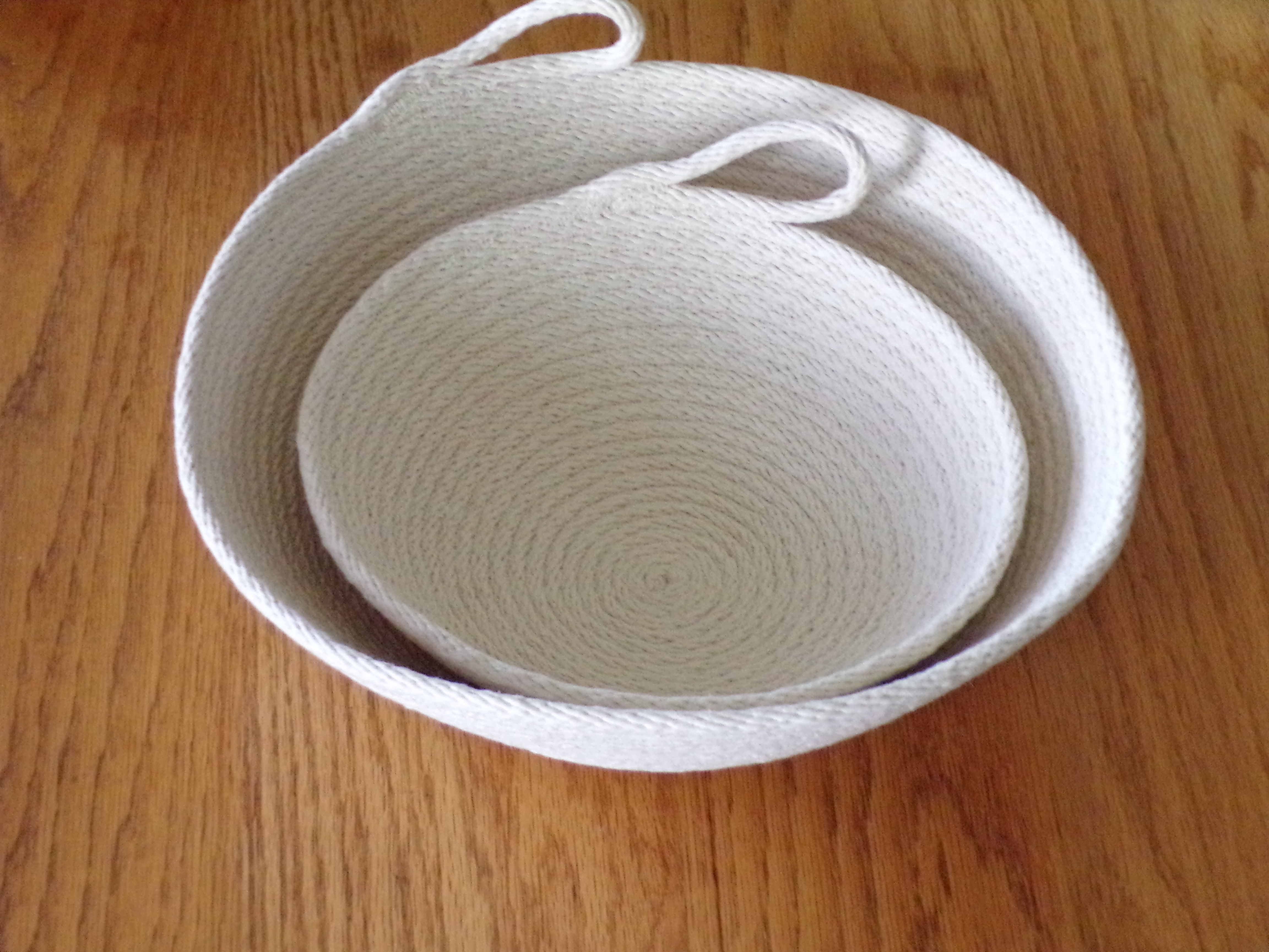 Rope bowls have many uses, such as holding cat toys, remote controls, napkins, or used for decorative purposes. This set of two nesting rope bowls is made from 1/4-inch cotton poly sash cord. Small bowl is 2 1/2 inches tall and 25 1/2 inches a round. Measurement taken at top outside of bowl. Large bowl is 3 1/2 inches tall and 34 1/2 inches a round. Measurement taken at top outside of bowl.