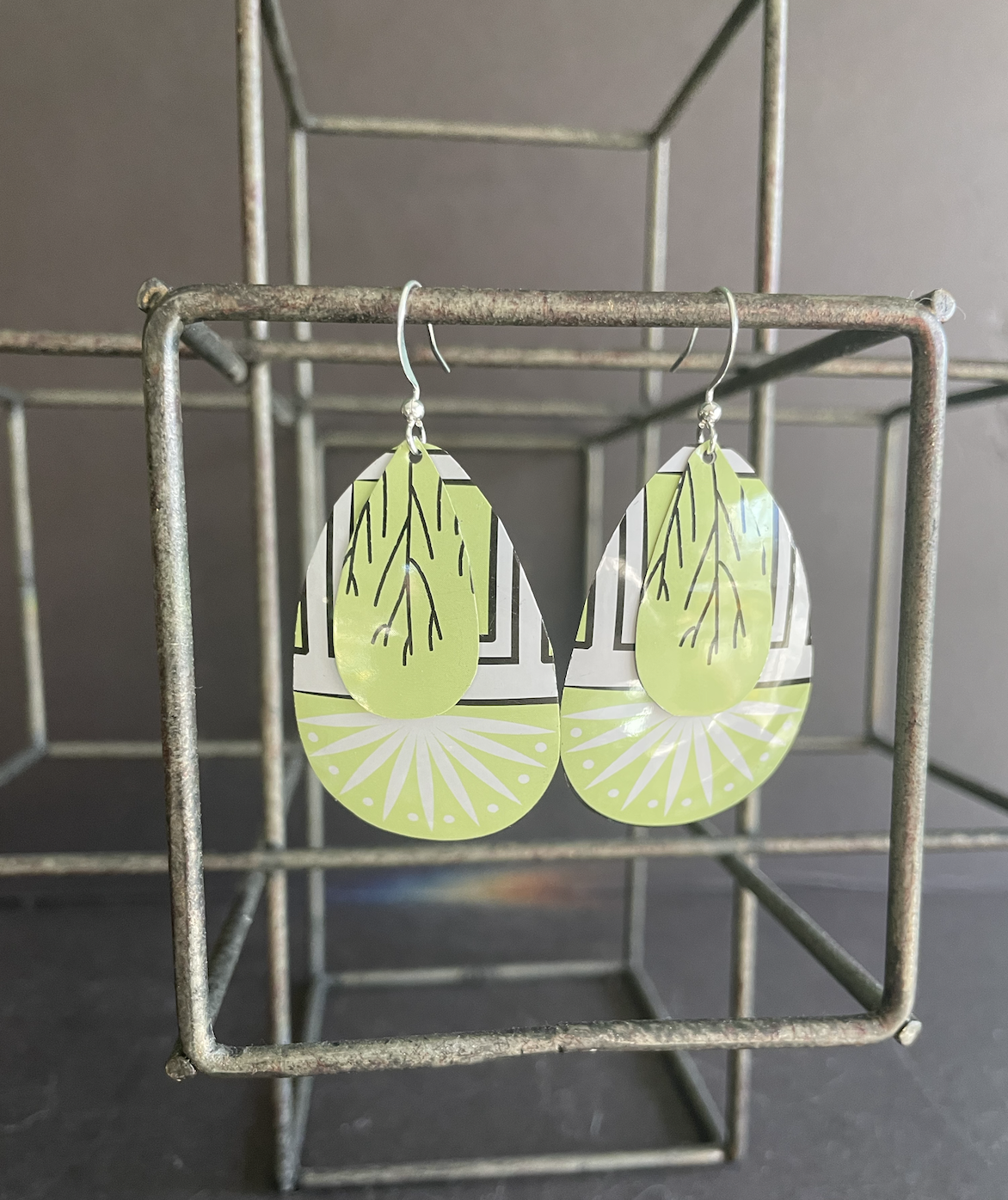 Tins are very light making them ideal for earrings as they don't weigh down your ears as the day goes on. Did you know the proper term for working with tin is "tinkering"? That made me really happy. I literally tinker in my art studio! I use old cookie tins, tea tins, and the like, break them down, and hand cut them into shapes and hand-hammer them into the 3-D shape I want them to be, finish and polish them, before putting them together like any other jewelry.