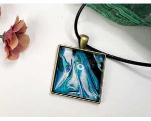 Original Handmade Fluid Art Square Pendant Necklace and Earri...