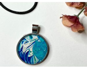 Original Handmade Fluid Art Pendant Necklace, Blues, White an...