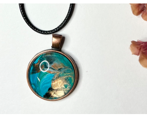 Original Handmade Fluid Art Pendant Necklace, Gold, Blues and...