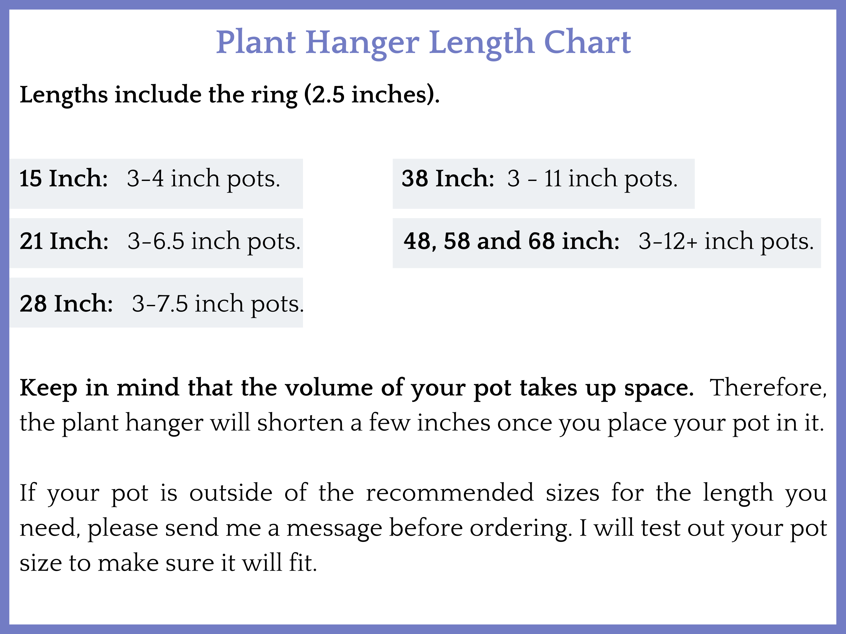 • The larger the pot the more it will shorten the hanger once your pot is inside. In general it will shorten by approximately half of your pots diameter. Feel free to send me a message if you are not sure about sizing!