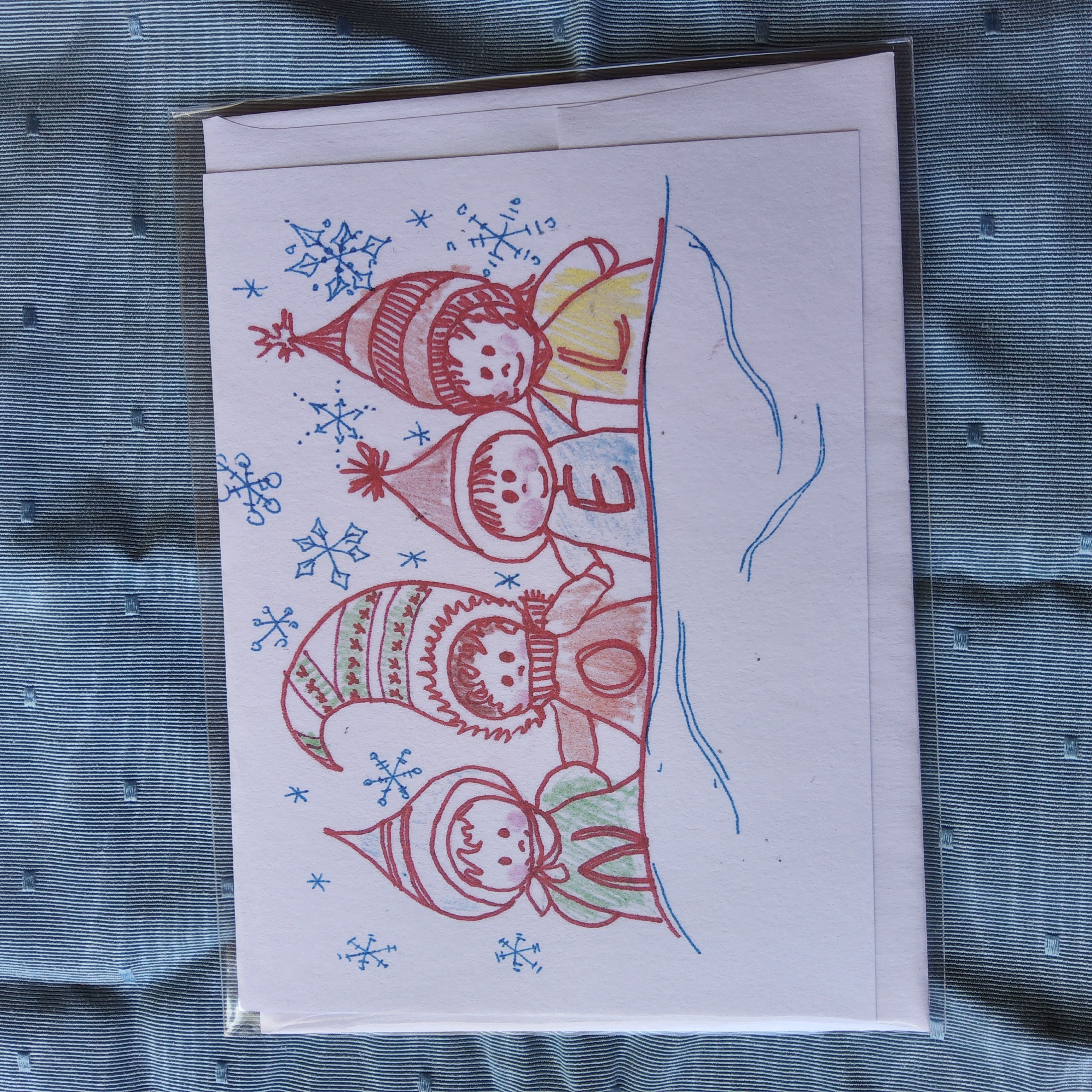 4 little children playing in the snow bringing you the classic Noel greeting during this Christmas holiday season.