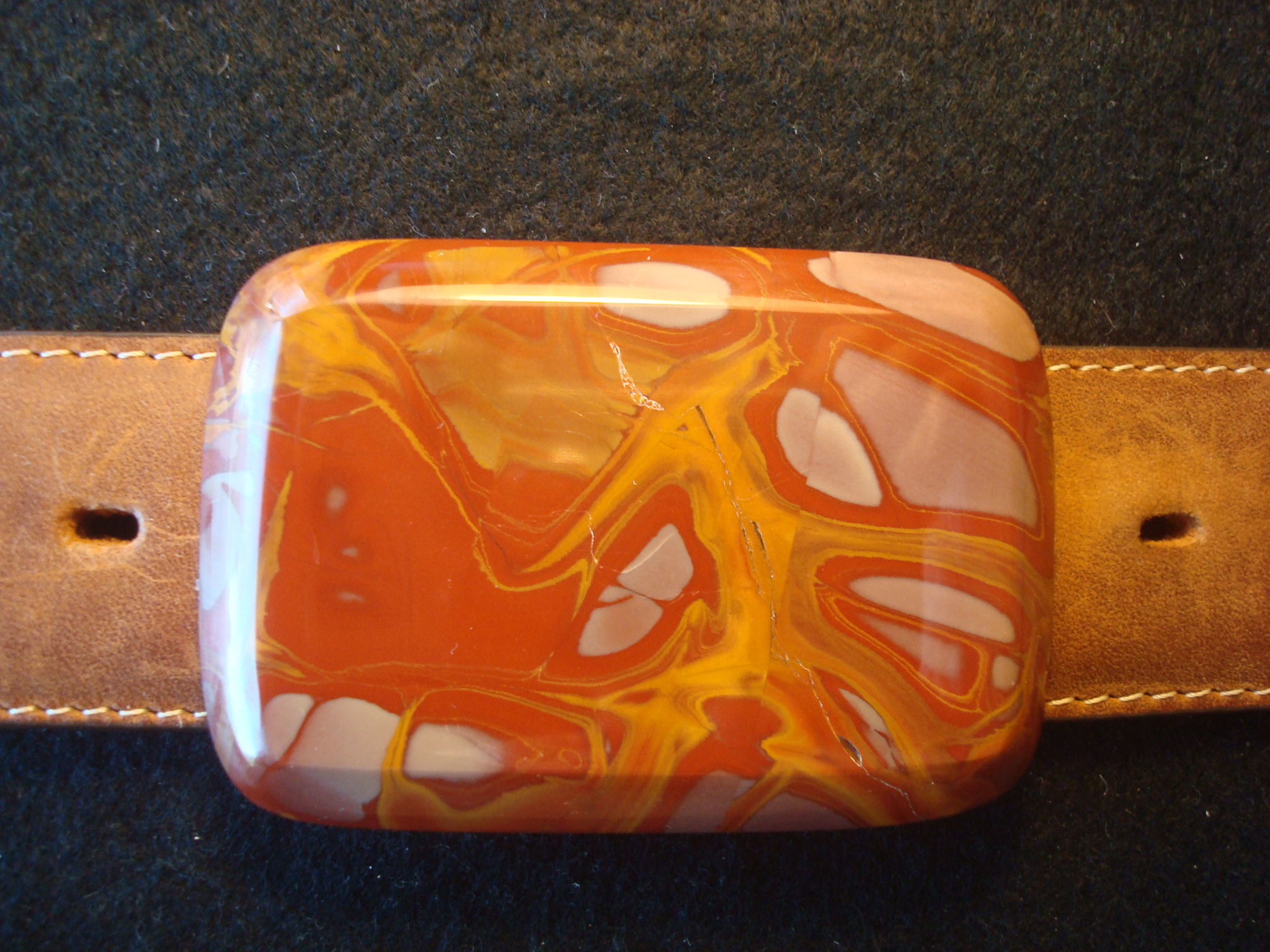 I have fashioned this piece from Noreena Jasper which is found in the Pilbara region of Western Australia. This buckle is formed in the bevel edge design and the stone is supported with my handmade German Silver backing . The backing is signed and dated along with the stones name. This buckle will accept a belt up to 1 1/2", it measures 2 1/16" by 3" and is approx. 1/4'" in thickness. Note that German Silver is not silver but an alloy comprised of nickle ,brass and zinc.The reasons that I choose to use it is because it's stronger, less expensive and it doesn't tarnish as does silver.
