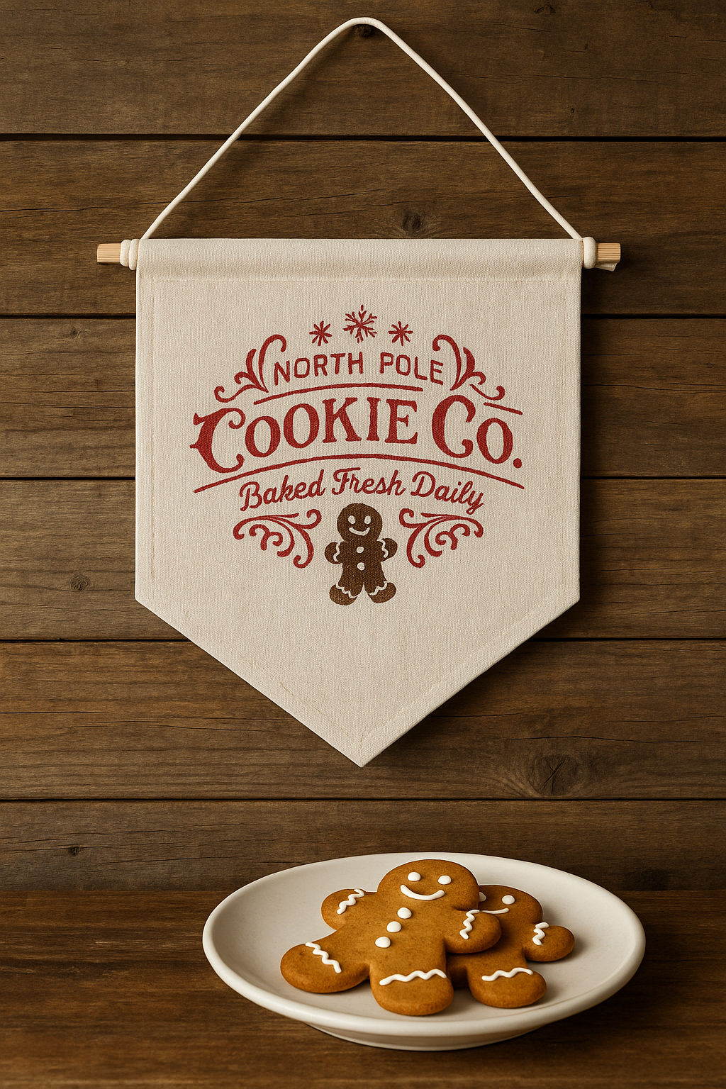 Measuring 13.5" high x 9.5" wide, this embroidered festive piece is perfect for adding a cheerful touch to any space. It’s easily hung from a sturdy wooden dowel and cord, making it suitable for both indoor and outdoor display