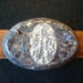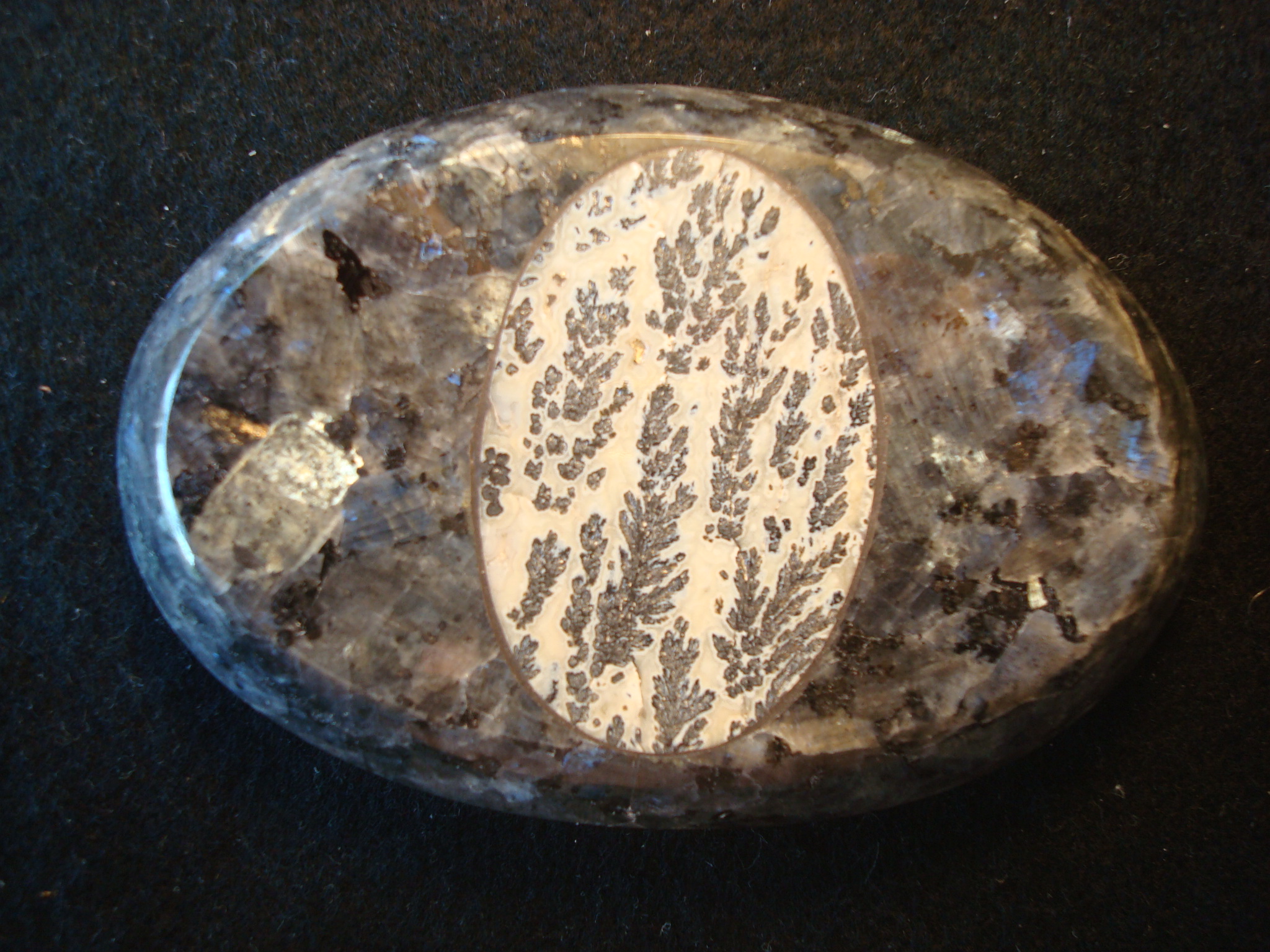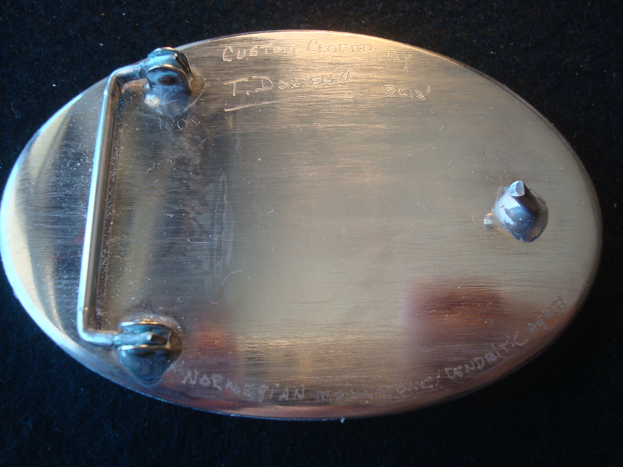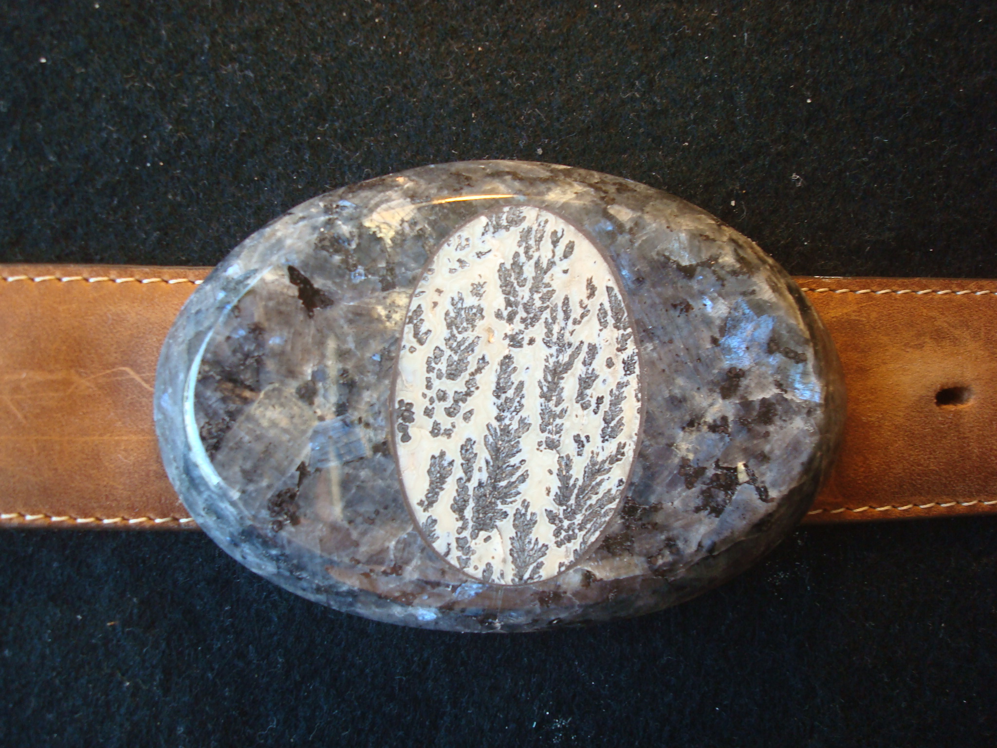 This buckle is with Norwegian Moonstone and Dendritic Agate. I have formed this buckle in a beveled edge oval shape. This buckle measures 2 1/2" by 3 3/4" in length and is 3/8" in thickness. I have supported the stone with my handmade German Silver backing and the buckle will accept a belt up to 1 1/2" in width. Note that German Silver is not silver but an alloy comprised of nickle,brass and zinc. The reasons I use it is that it's stronger,less expensive and it doesn't tarnish as does silver.