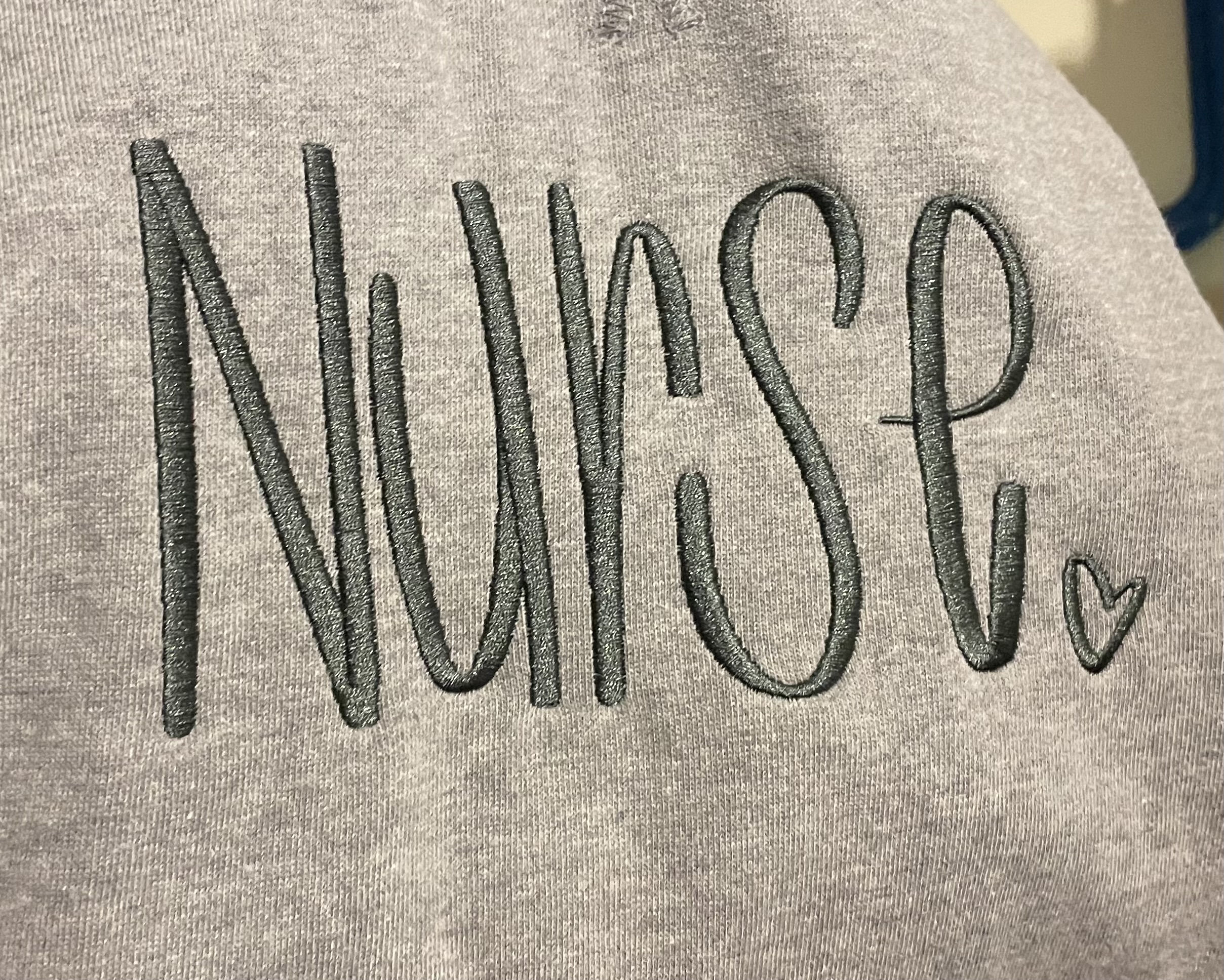 The embroidered design consist of Hand lettered font that reads NURSE with a heart to the right.