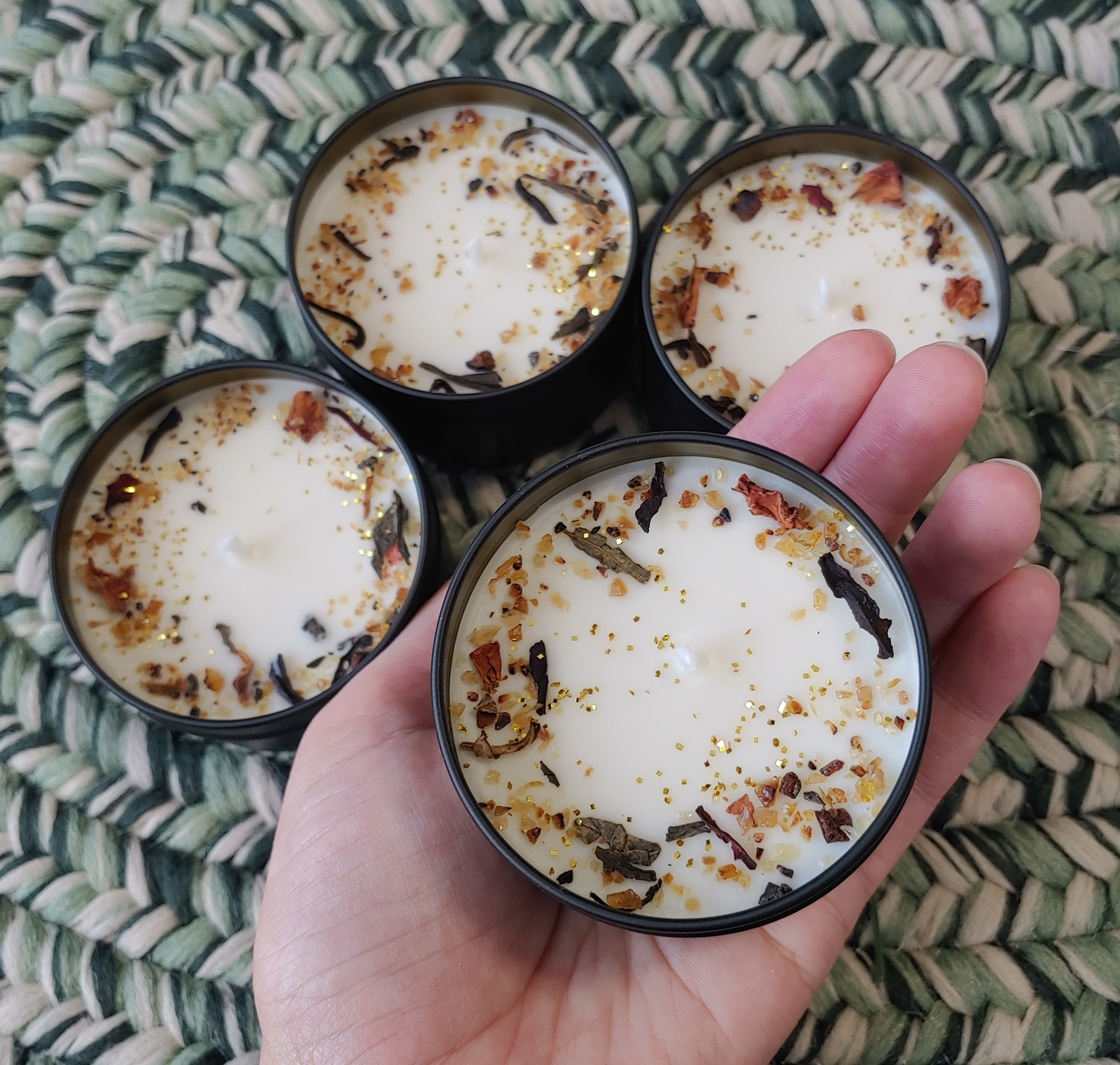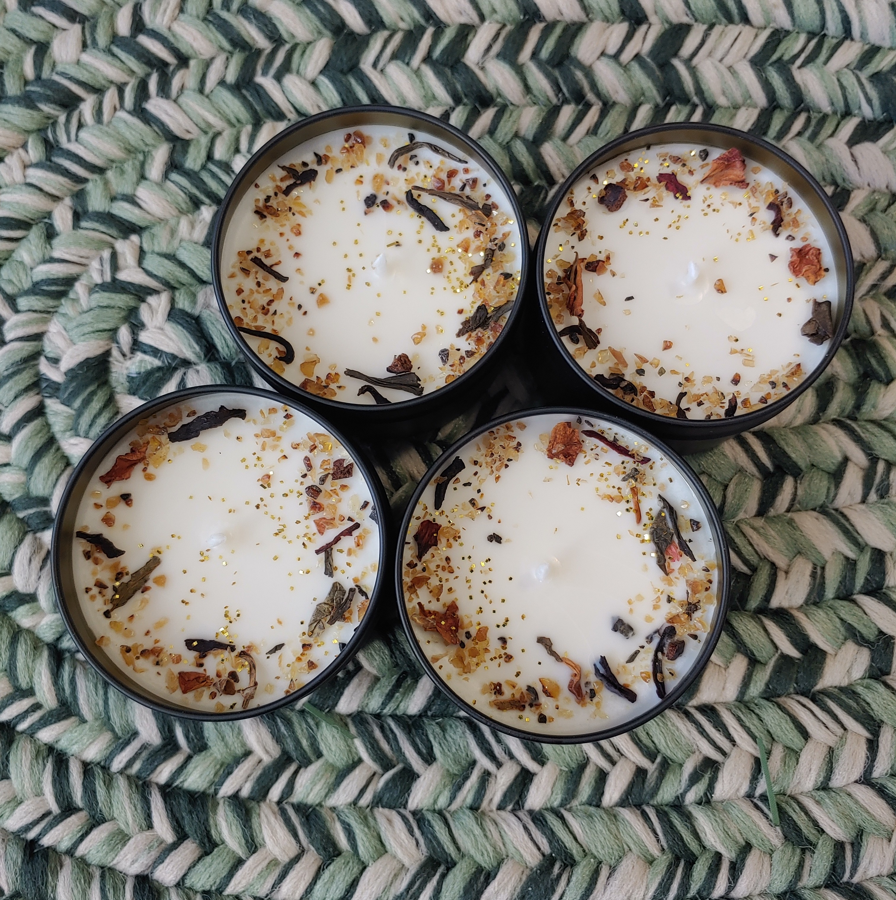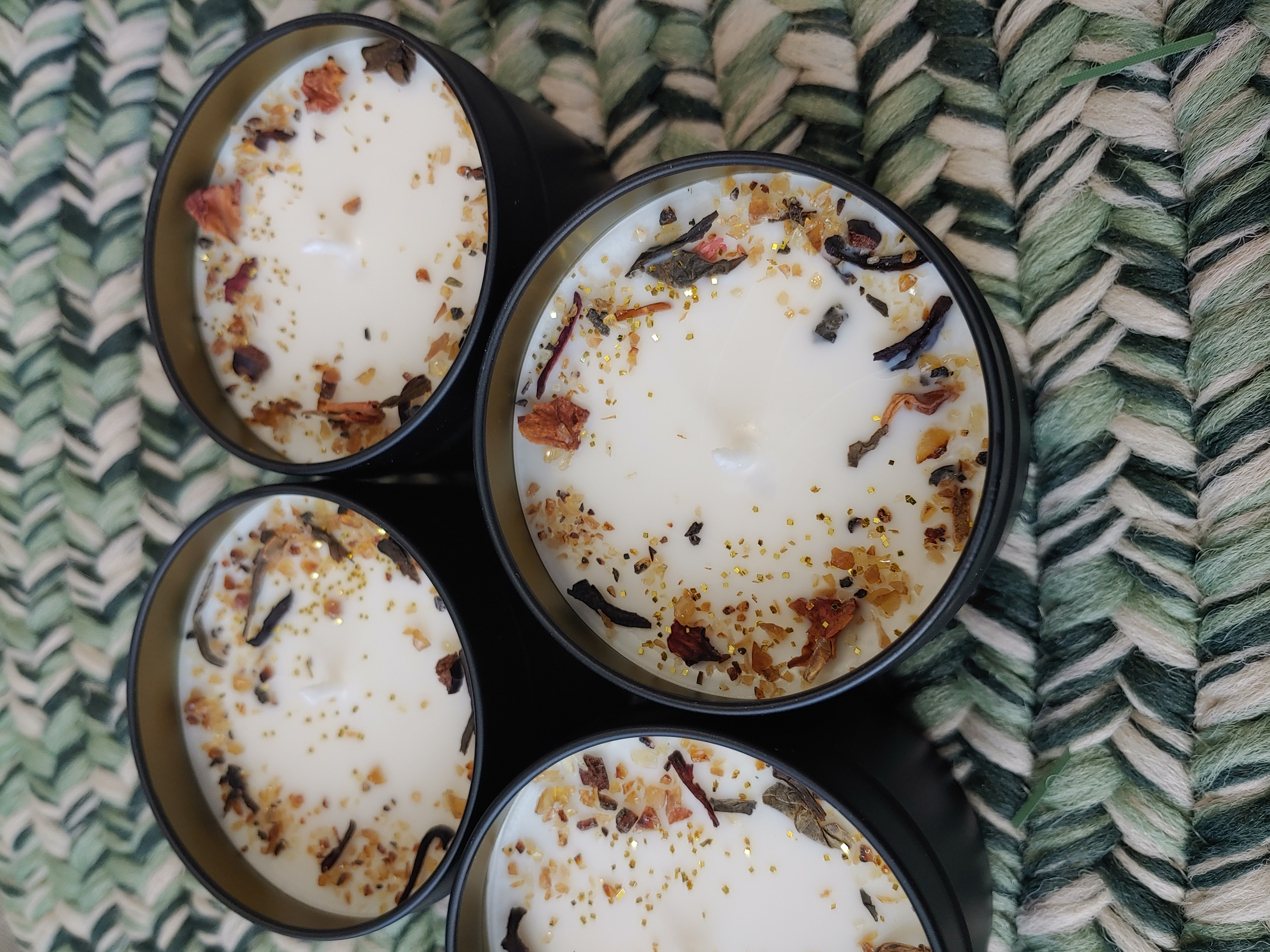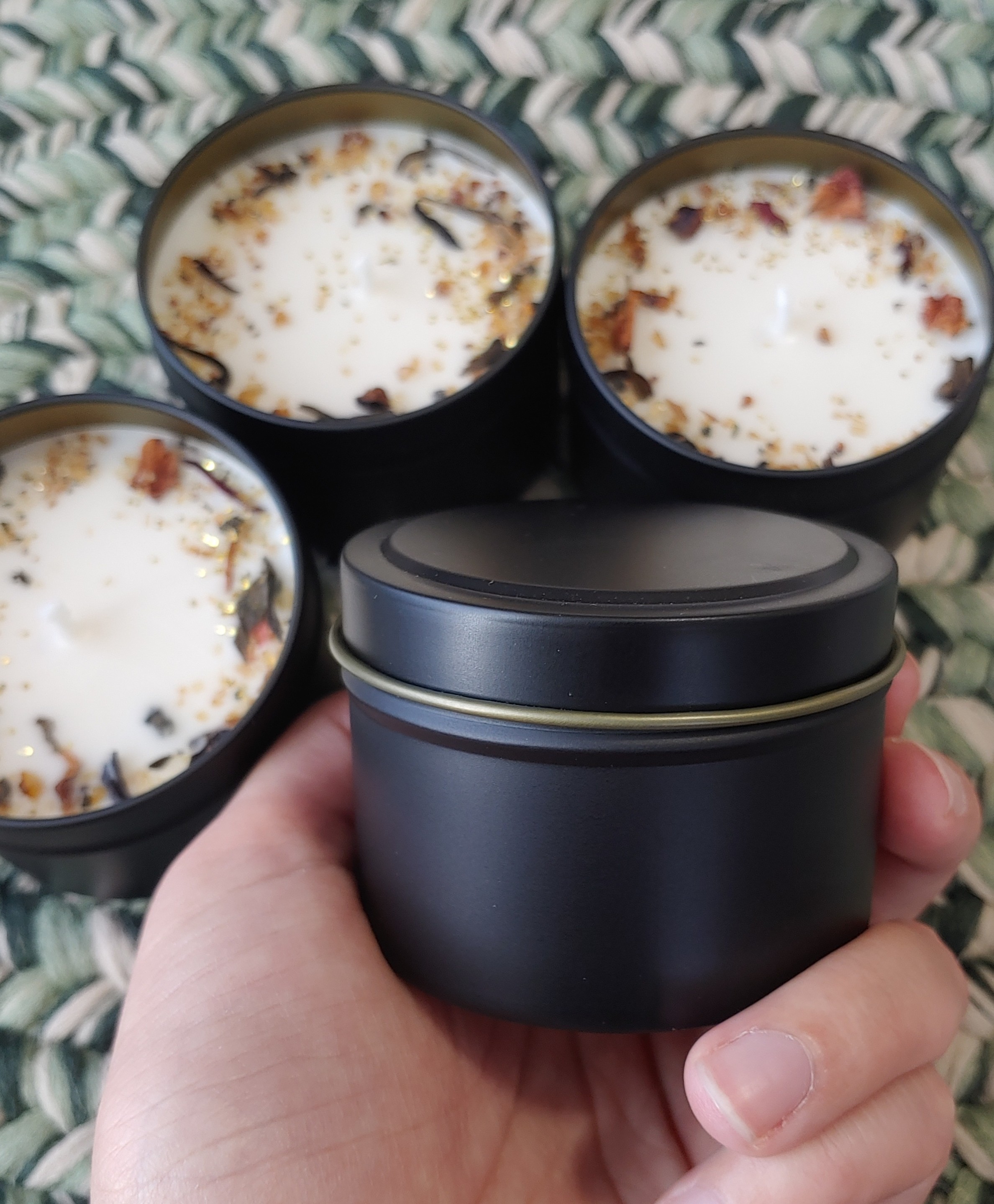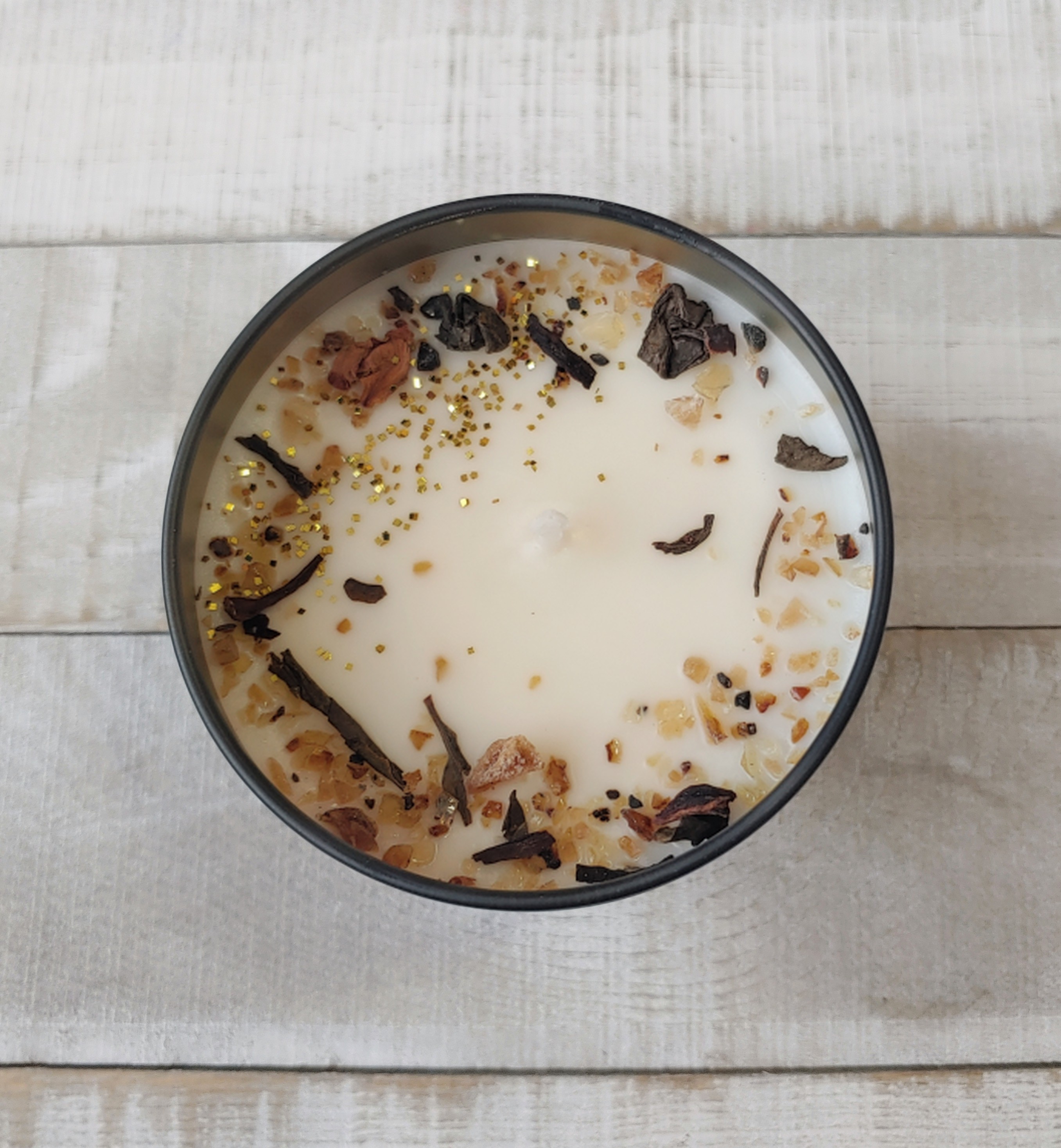 All the candles in my shop are handmade in small batches by me! I love creating unique scents and decorating them with crystals, flowers, glitter and wax molds. I use the highest quality ingredients possible in all of my candles, including natural soy and coconut wax. This makes for a cleaner, longer burn time. However, the scent throw is not as strong as store-bought candles that include paraffin which is good for people with allergies and auto-immune issues, or who simply do not like strong, artificial scents!