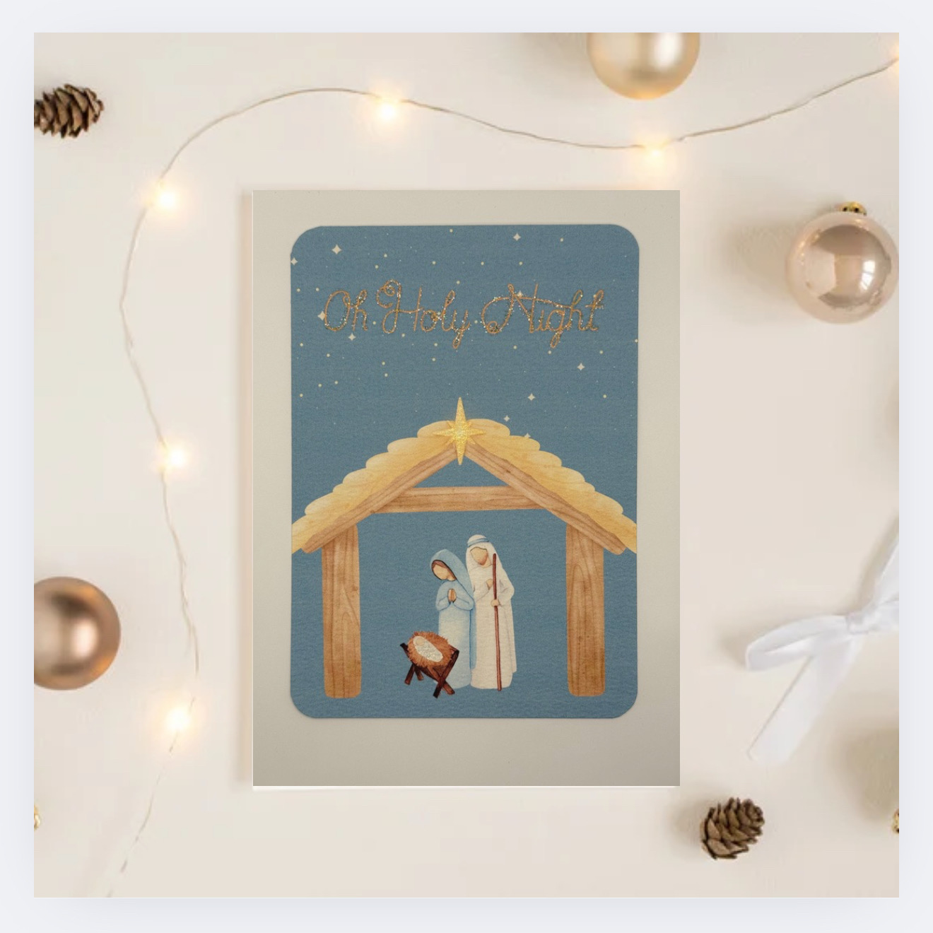 Reason for the season. O Holy Night design features baby Jesus in the manger with Mary and Joseph.