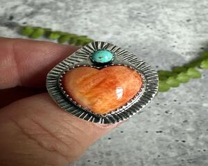 Orange Spiny Oyster Shell and Kingman Turquoise Heart Ring - ...