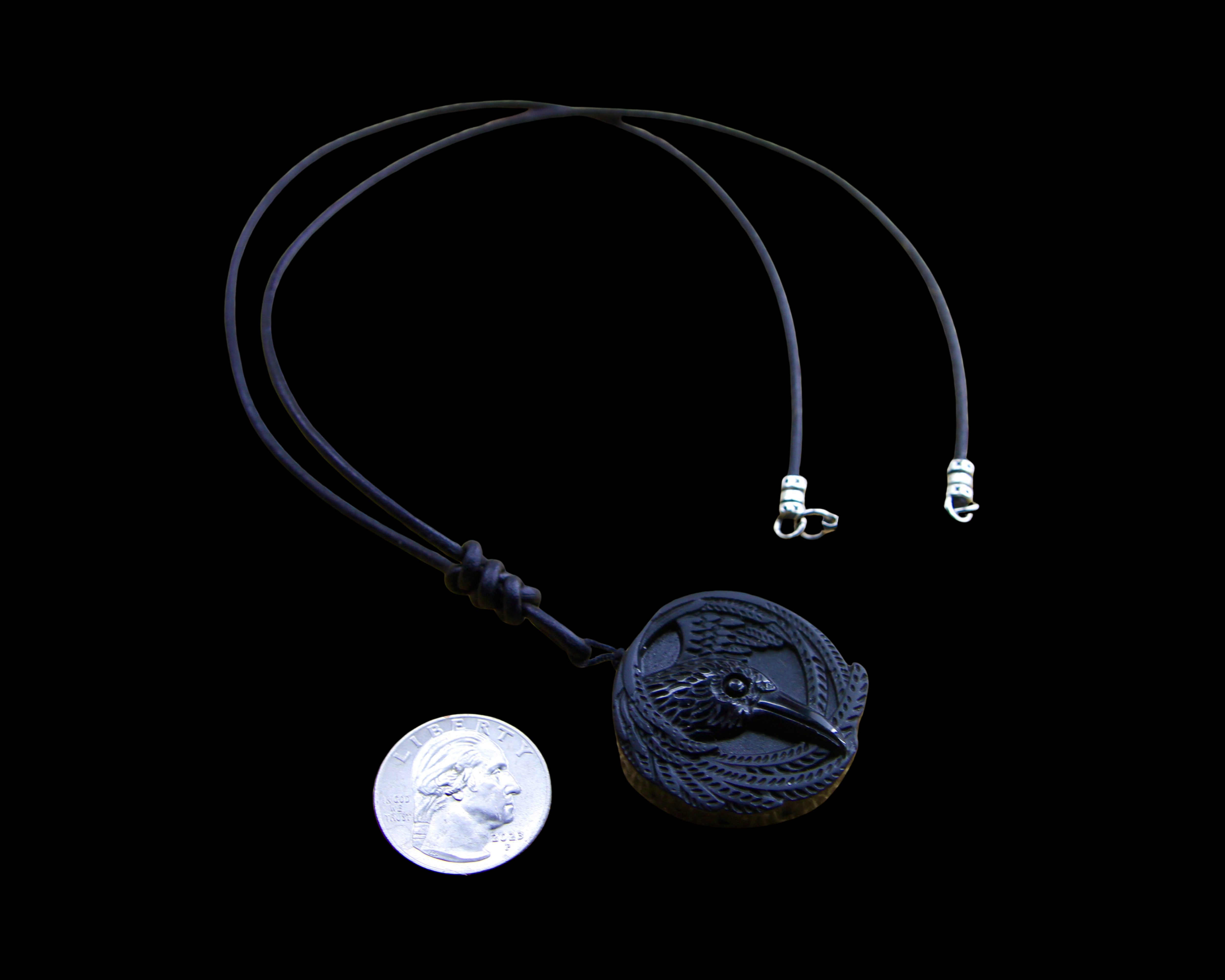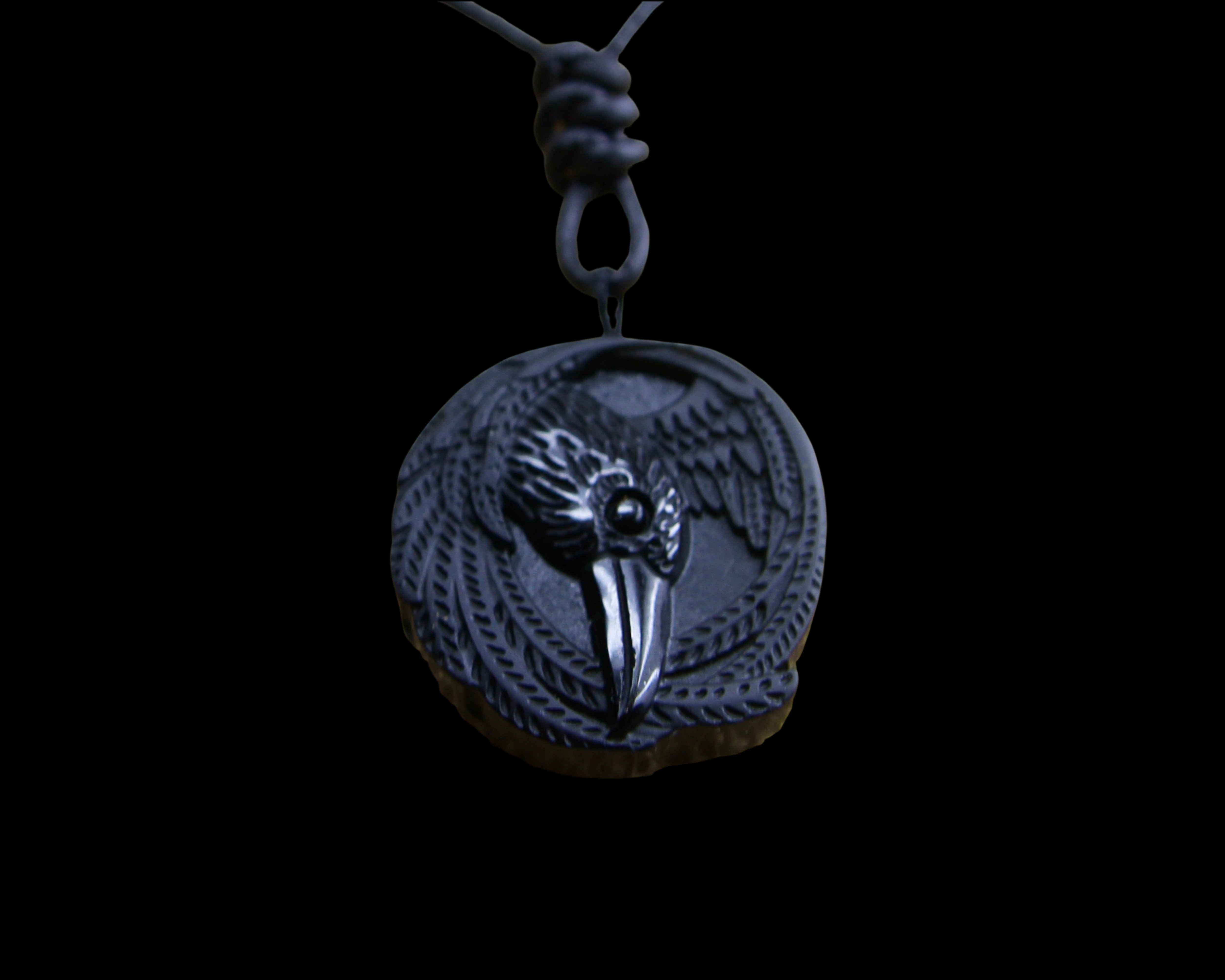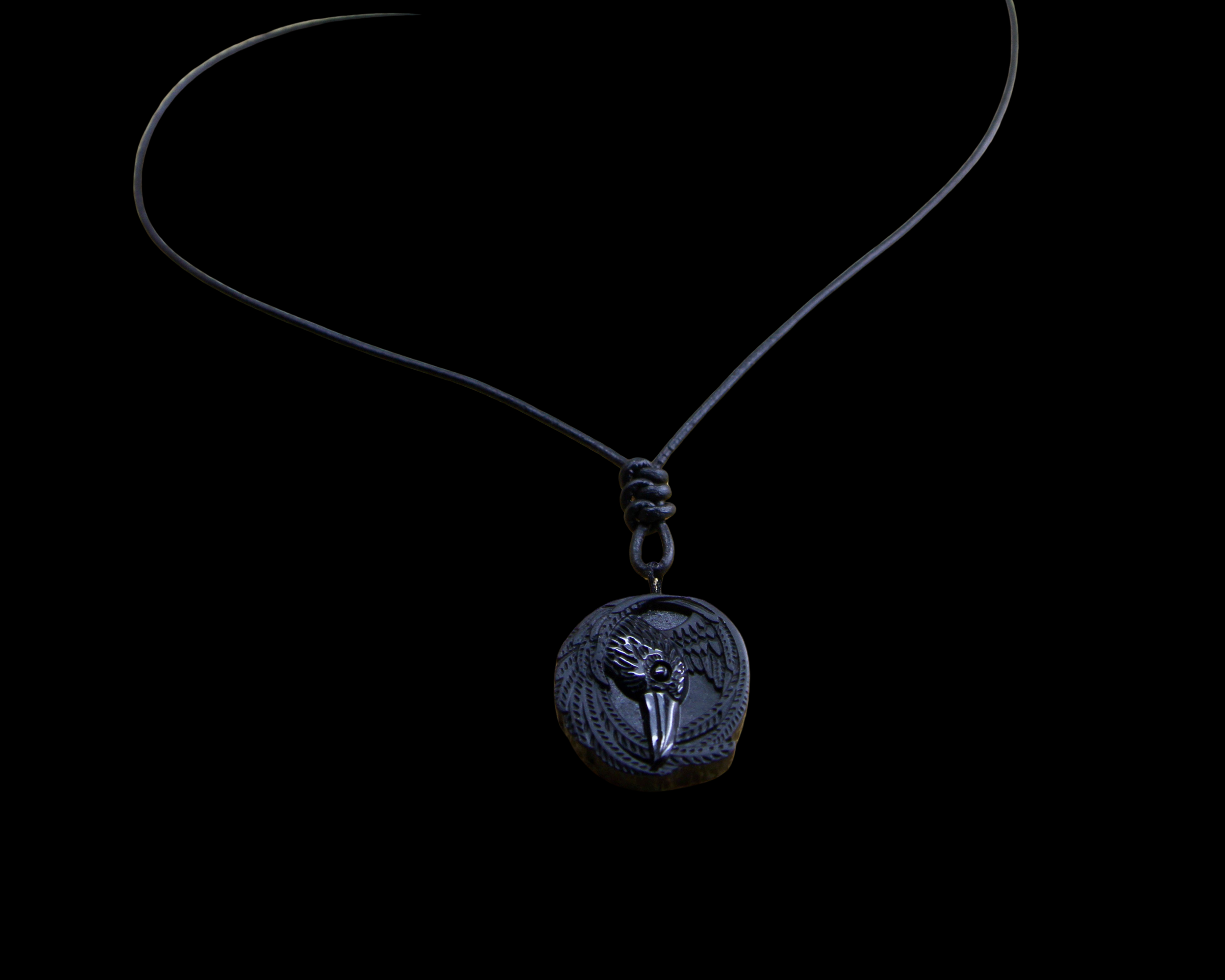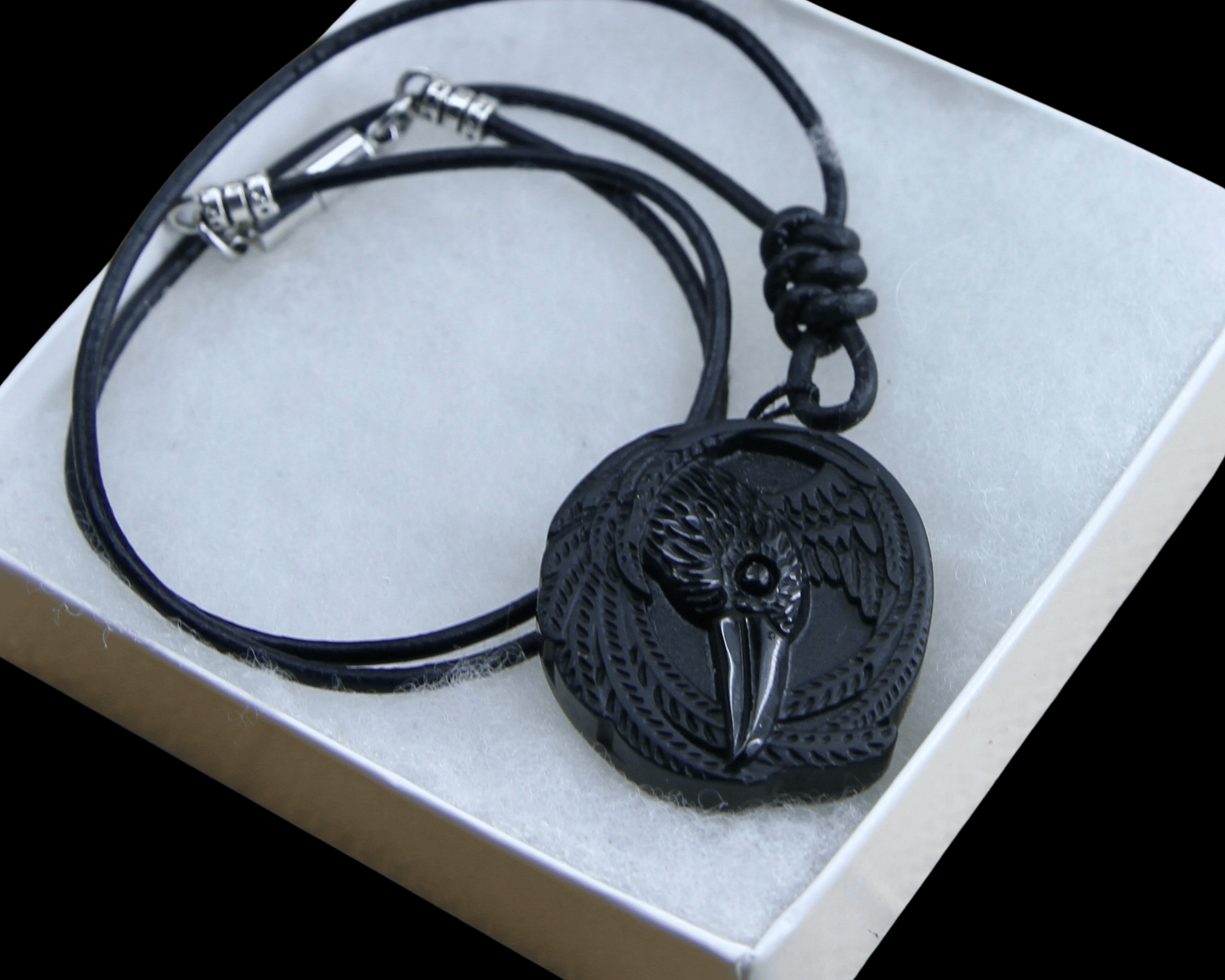 This is an Obsidian Viking Raven Pendant on Genuine Hand Knotted Soft Black Leather Cord necklace with a surgical stainless steel lobster claw clasp.