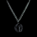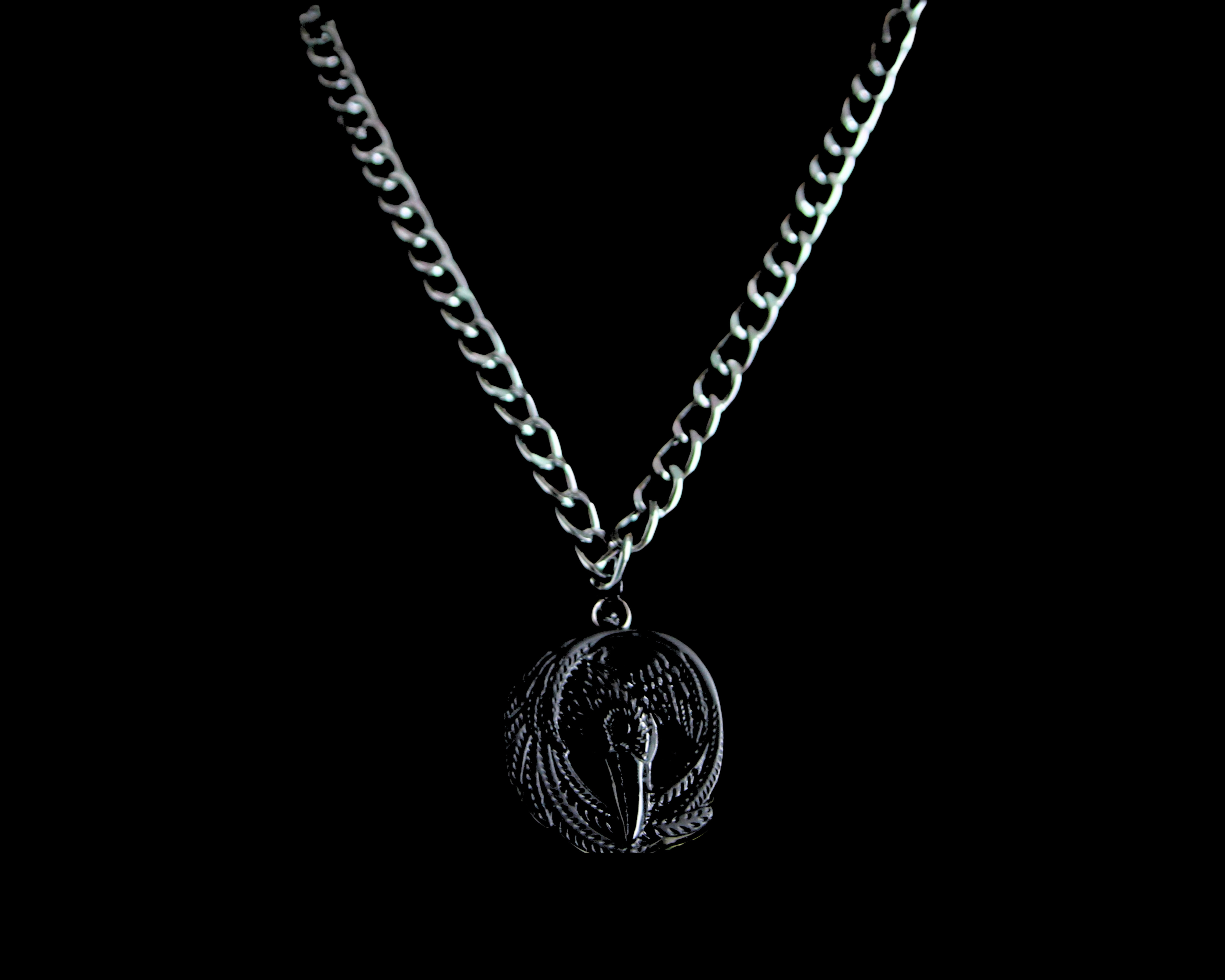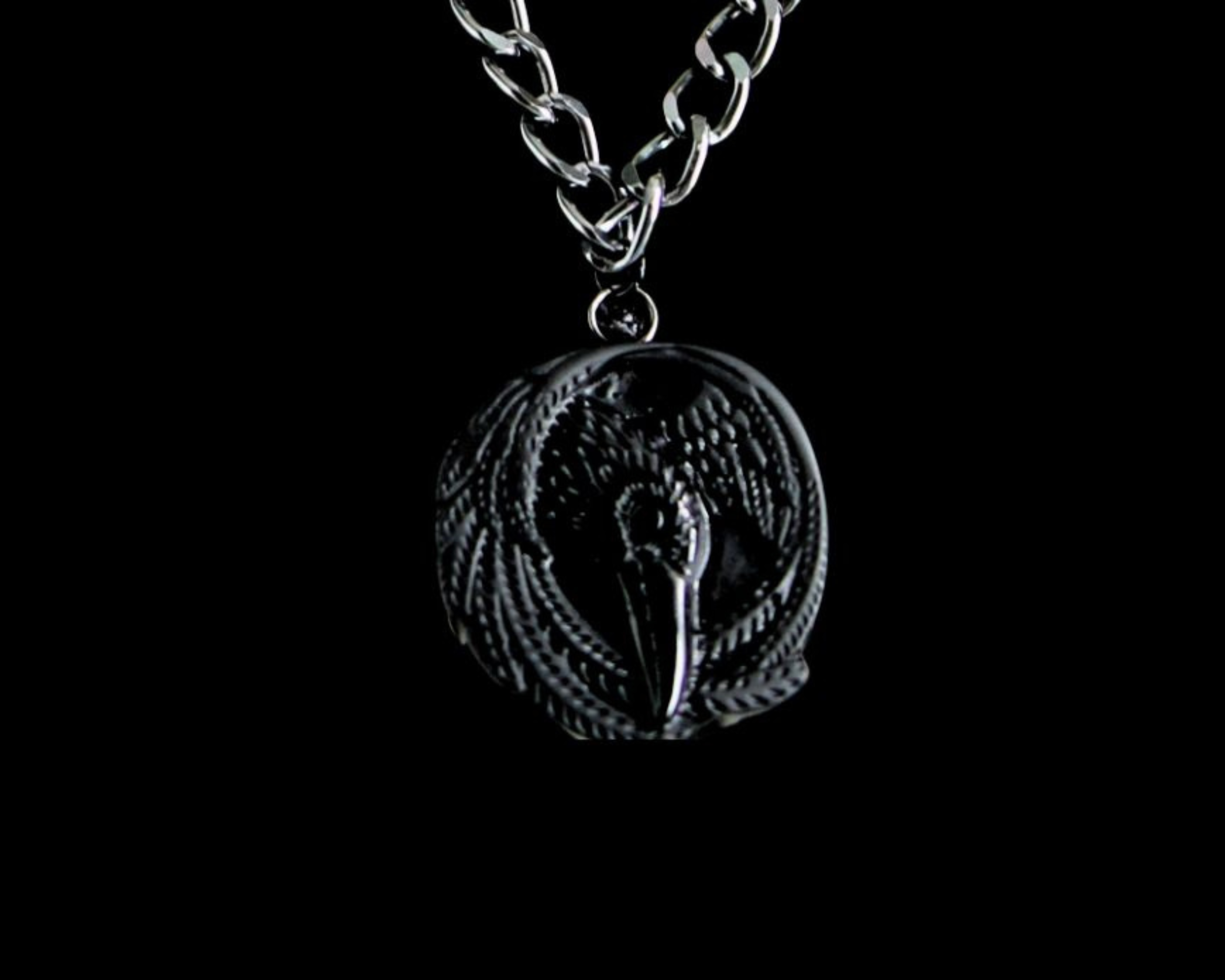 This is an Obsidian Viking Raven Pendant on a Lightweight Aluminum Gun Metal Black Curb Chain & Black Surgical Stainless Steel Lobster Claw Clasp.