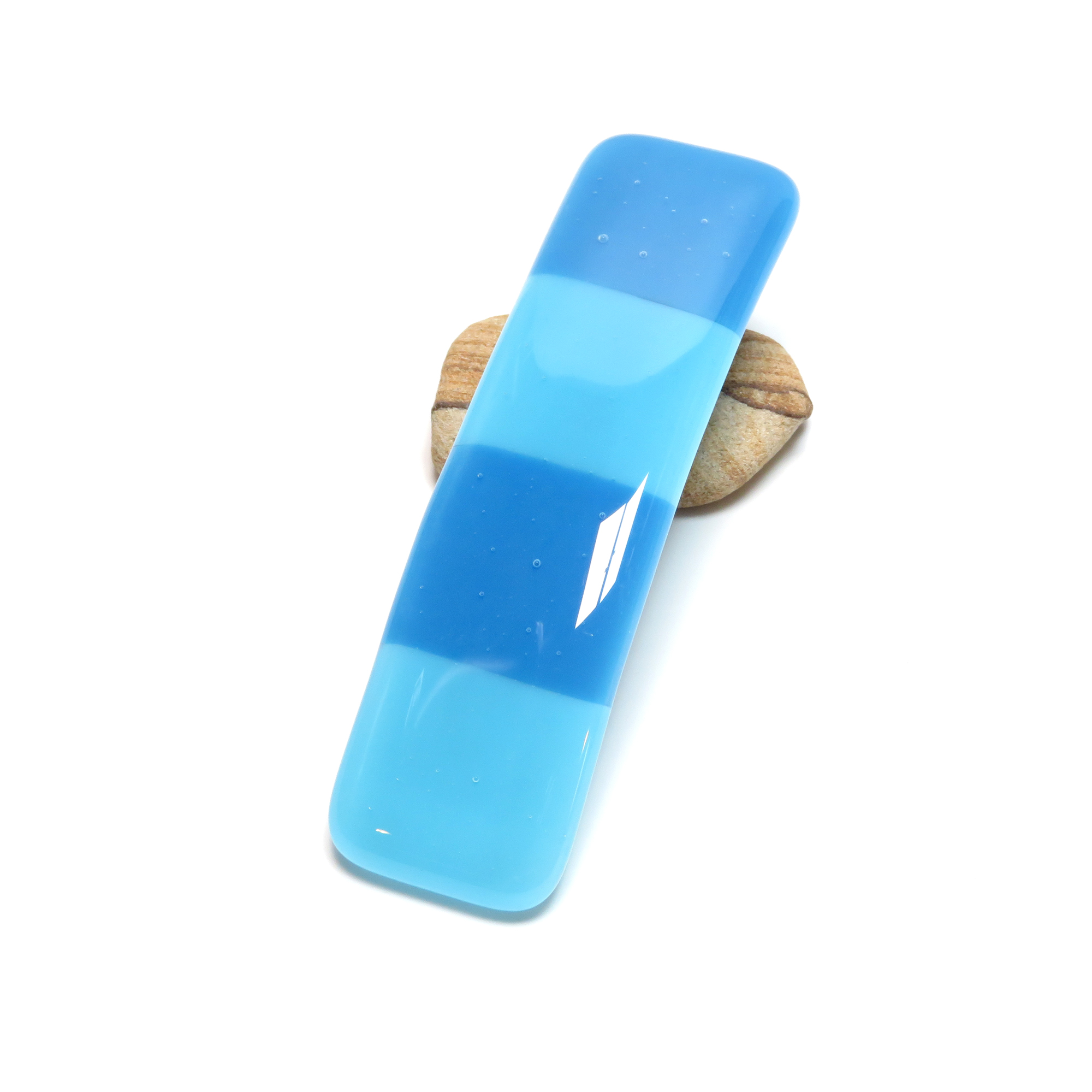 This 4x1-inch fused glass barrette by Partners in Glass features soft gradients of aqua and sky blue — a refreshing, modern take on beach-inspired elegance. Each barrette is kiln-fired for over eight hours to achieve a luminous, glassy finish and lasting strength.