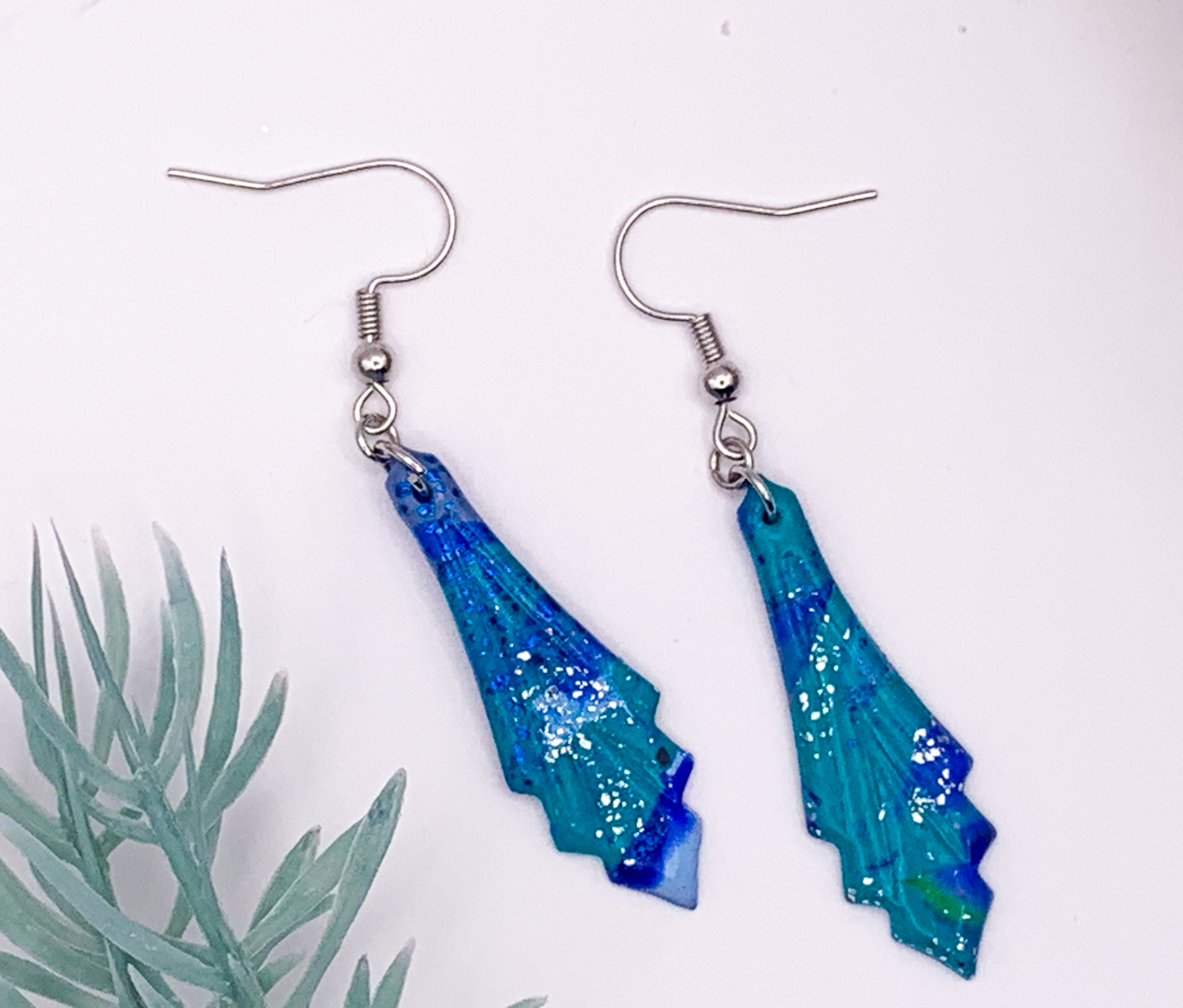 Unique and eye-catching! These fan-shaped earrings feature layered shades of blue with glitter accents for a bold, ocean-inspired design.