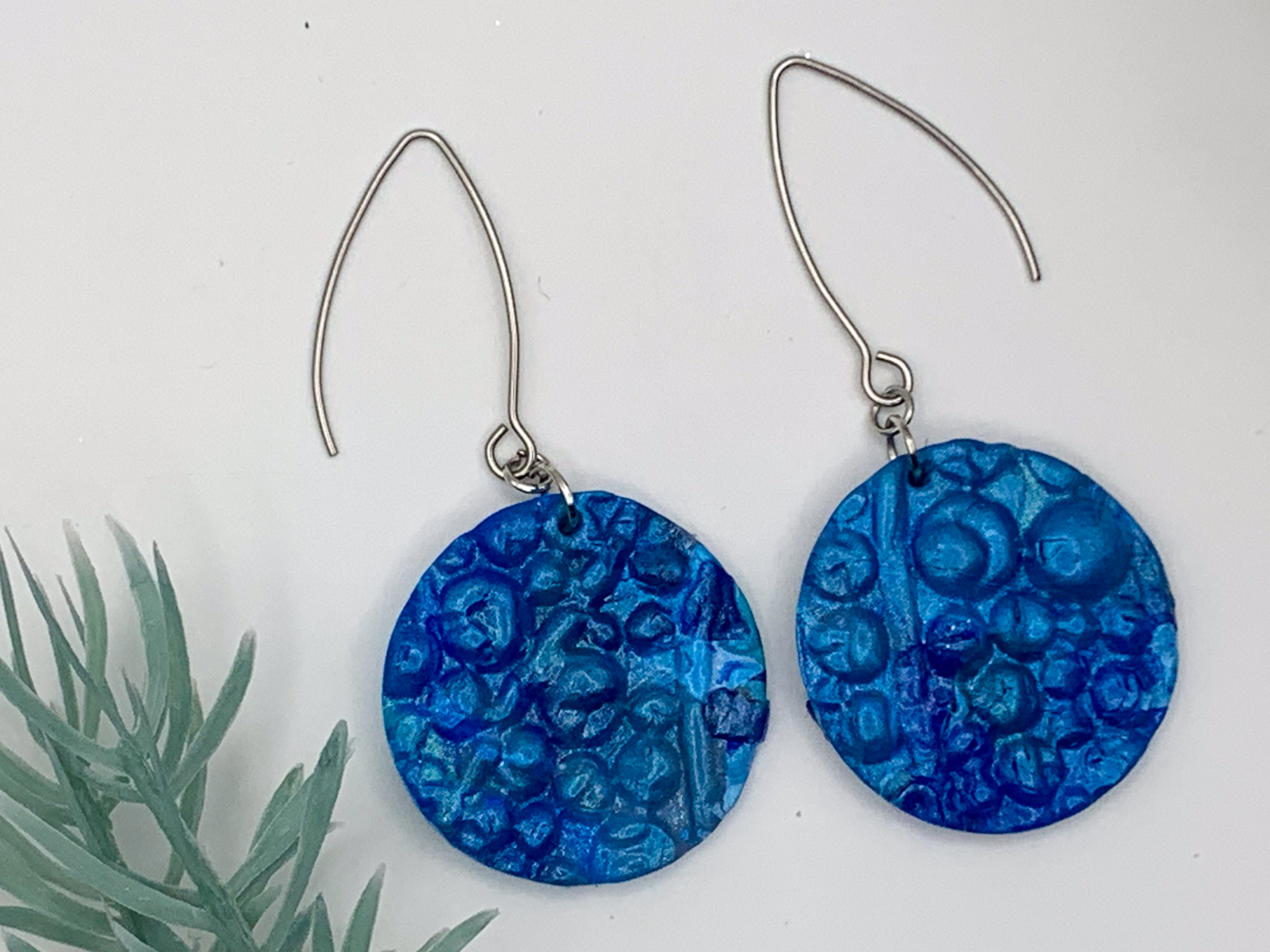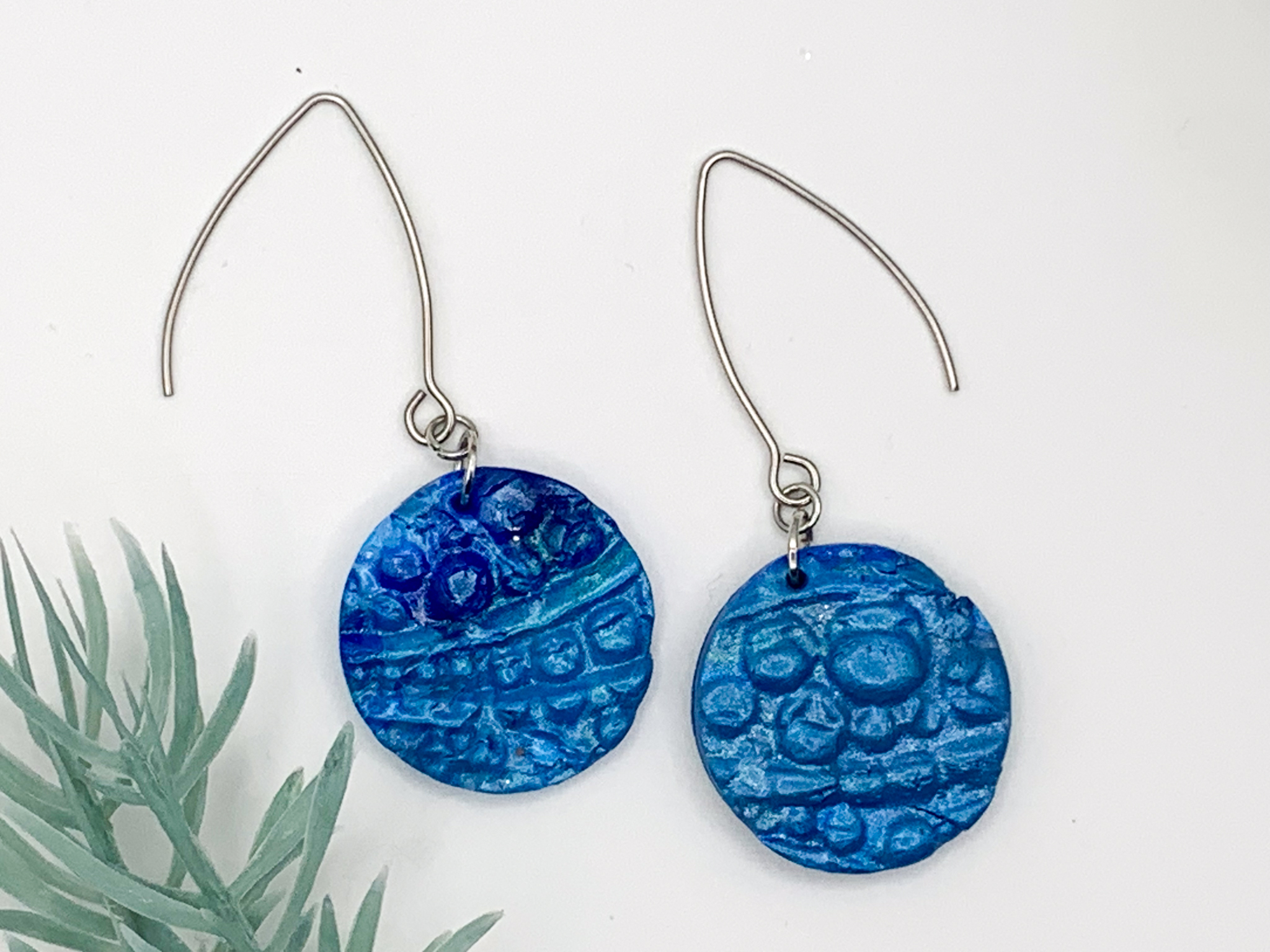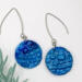 Dive into color! These vibrant blue clay earrings feature a textured surface reminiscent of ocean waves, paired with sleek long hooks for a contemporary finish.