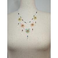 Designed to captivate with its vibrant hues and intricate detailing, this stunning piece features a large, iridescent abalone shell pendant that shimmers with shades of blue, green, and purple, evoking the beauty of the ocean. The pendant is elegantly adorned with an array of meticulously hand-beaded clusters, adding texture and a touch of sparkle to the design.