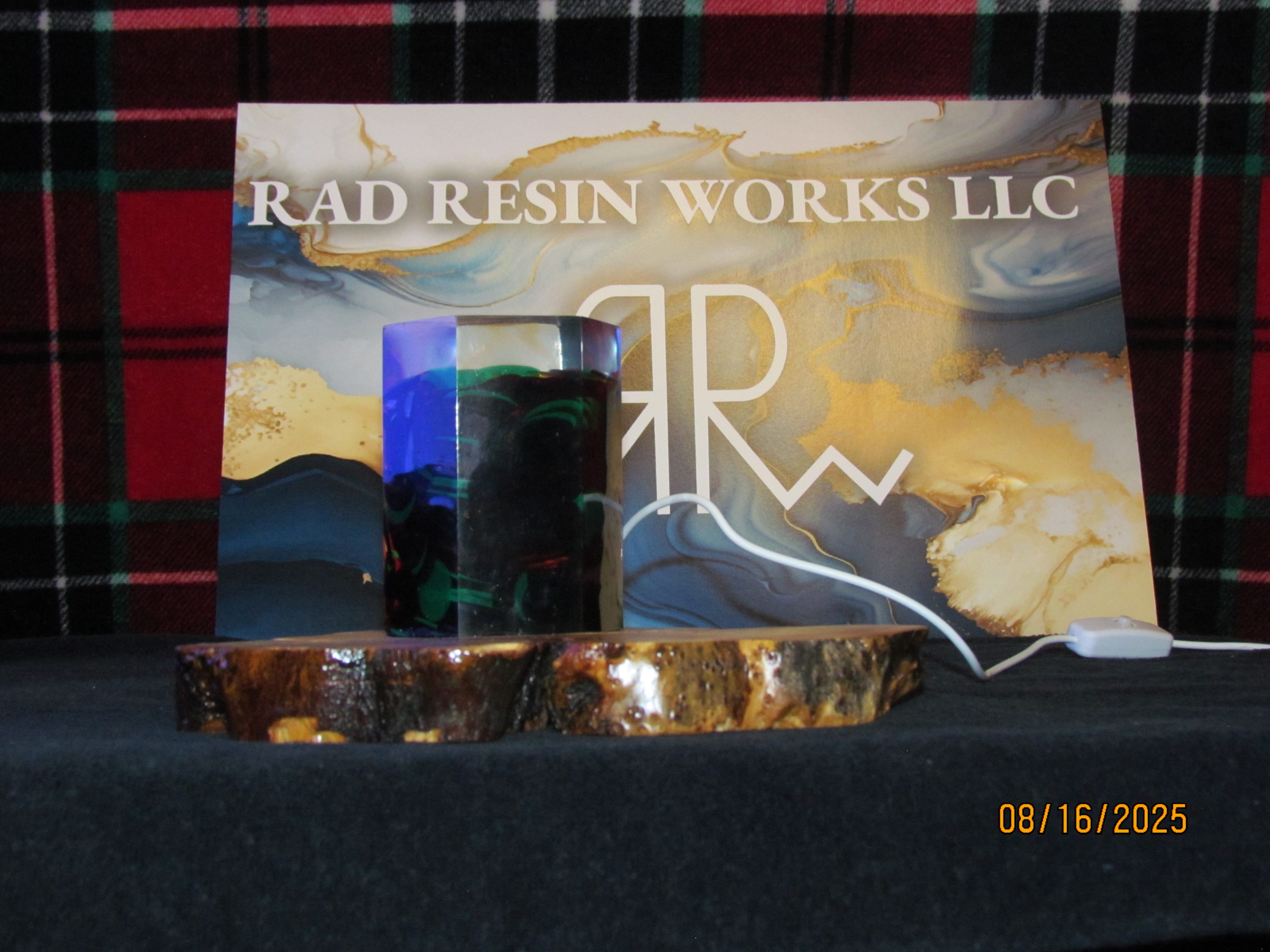 this piece is clear with colored glass beads inside of the octagon. it has a olive wood base. there is a white USB light mounted inside the base.