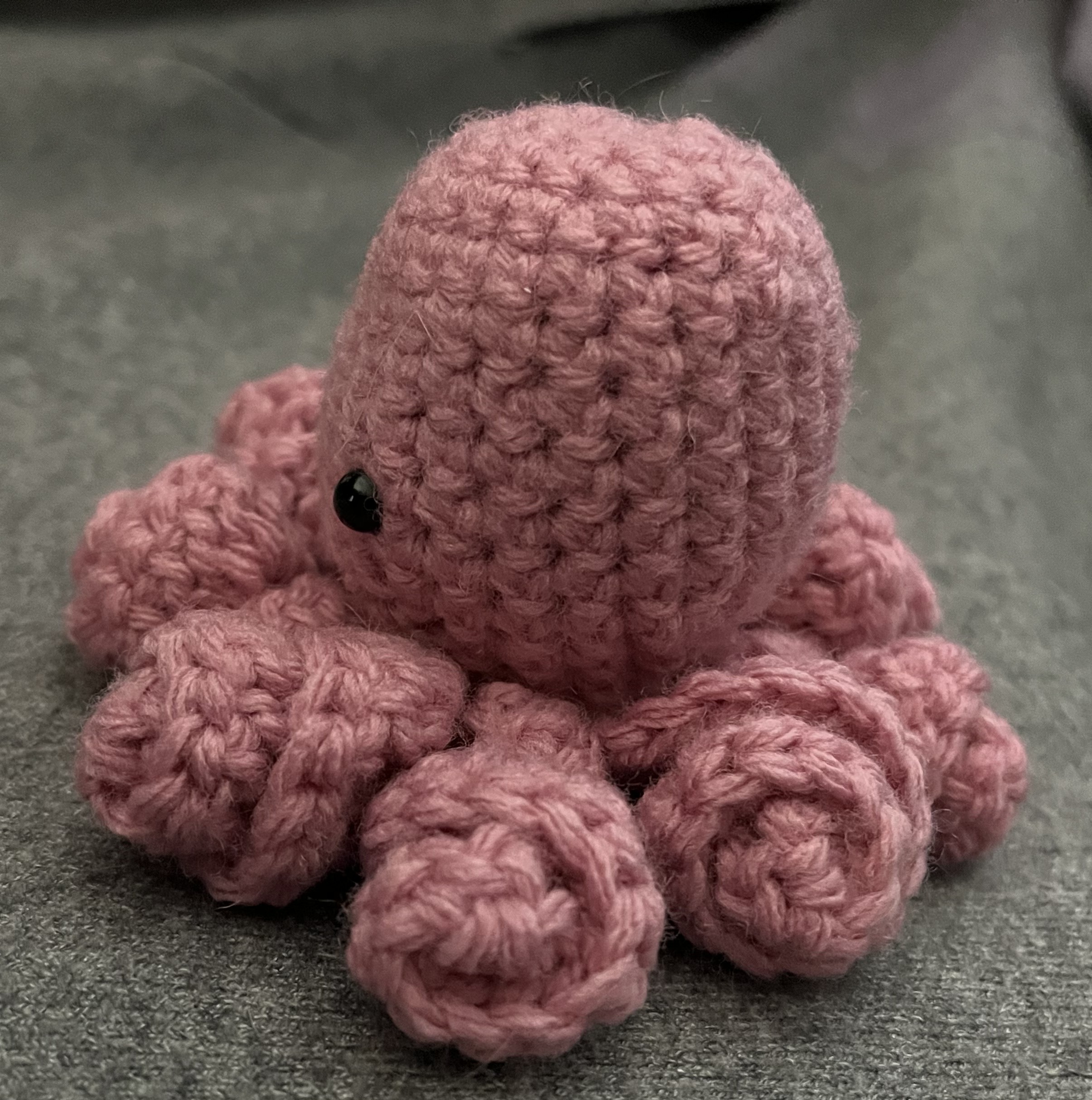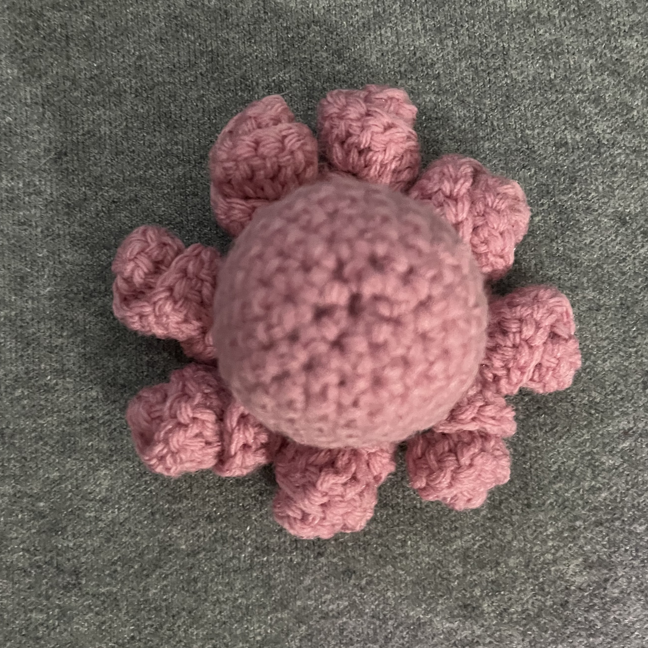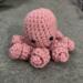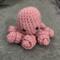 This little cephalopod is made of acrylic yarn, plastic safety eyes and body is stuffed. It sits up on it's own. Please contact for any color variation. It measures about 4 inches in diameter and 3 inches tall.