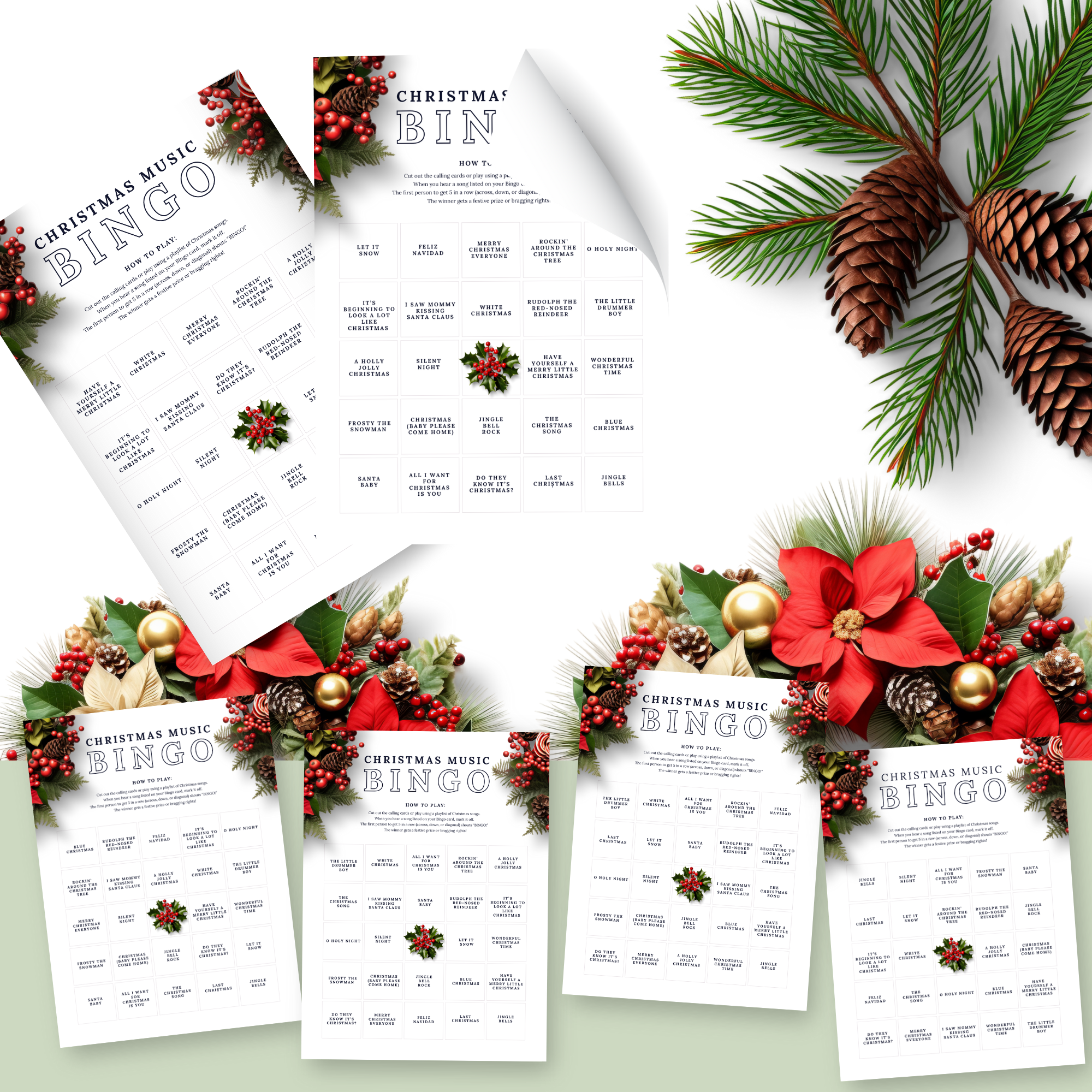 6 unique Xmas Music Bingo cards (PDF, ready to print)
