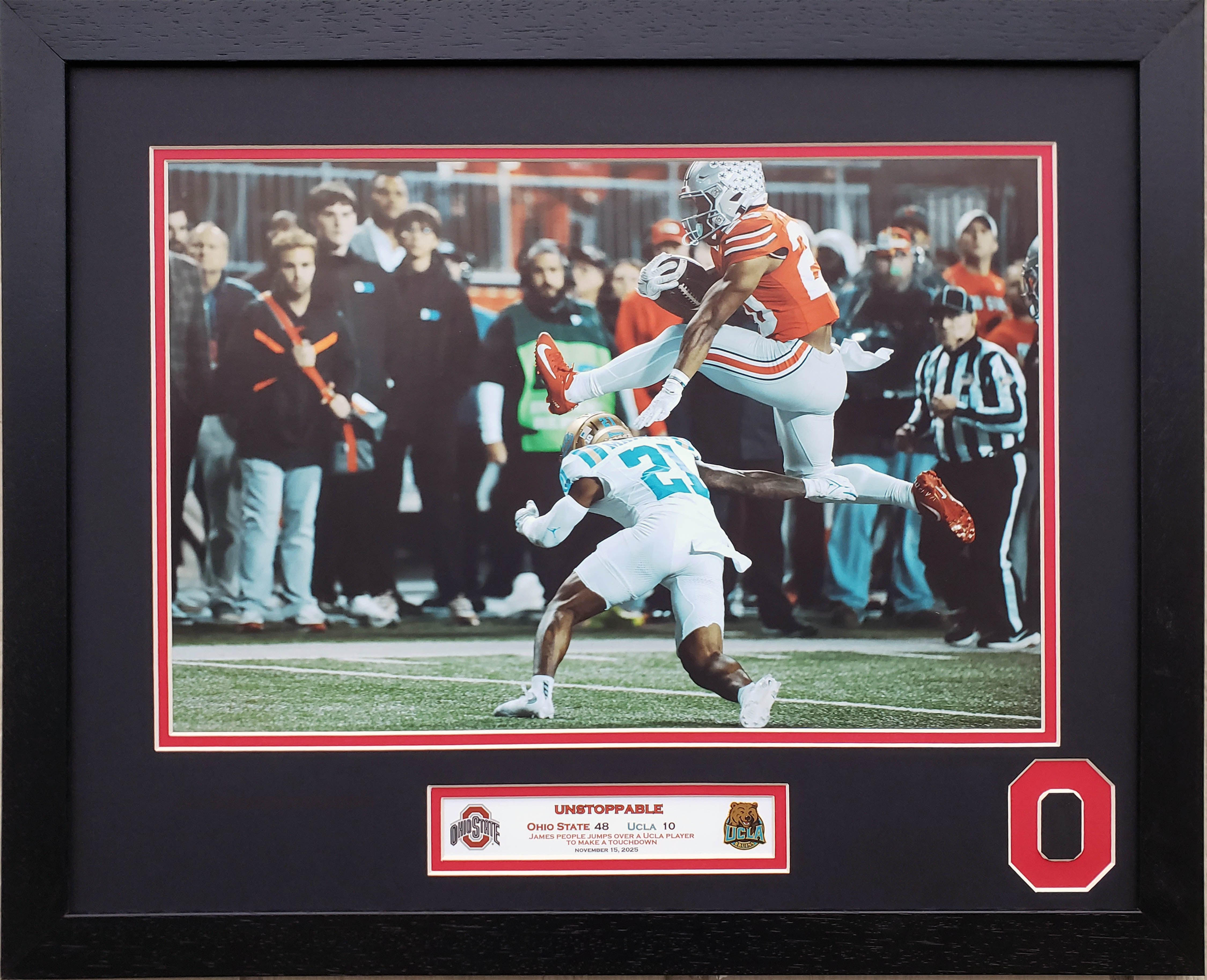Celebrate the Ohio State Buckeyes 2025 victory over UCLA with this one of a kind custom framed picture. Featuring the moment James People Hurdles over a ULCA player to score a touchdown. A truly historic play for the buckeyes. A very special gift for your very special fan.Measuring 20 x 16 inches or 24 x 30 inches and framed in durable hand crafted moulding from the species White Oak. Double matted in Cresent Select matting with logo cut directly into mat and nameplate depicting the event. Permanently dry mounted to Bainbridge foam core to ensure the print never wrinkles or bubbles even in the most severe environments. Encased in Tru Vue UV protected acrylic glass to ensure superb clarity and intact shipping. Heavy duty black craft paper dust cover or backing. Heavy duty AMS hangers with 150 pound rated braided steel wire hanger. Complimentary artwork hanger with every order for effortless installation.Handmade in Kentucky.Fast and Free Shipping.Materials Used:-Handmade wooden moulding from the species oak-AMS heavy duty wire hangers-Tru Vue UV protected acrylic glass-150 pound braided steel wire hanger-Bainbridge foamcore-Cresent Select matboard-Complimentary artwork hanger-Heavy Duty black craft paper backing-Premium drymount tissue-Fletcher Terry framers points-Scappa double sided professional grade tape-Epson premium luster photo paper 100 pound