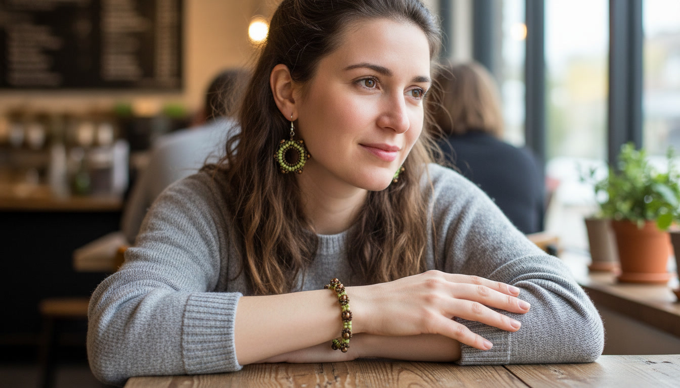 This handmade olive green jewelry set pairs a beaded bracelet with matching earrings, designed to feel earthy, balanced, and quietly distinctive. The color palette blends soft olive greens with deep bronze tones, creating a look that’s natural without being plain and detailed without feeling heavy.