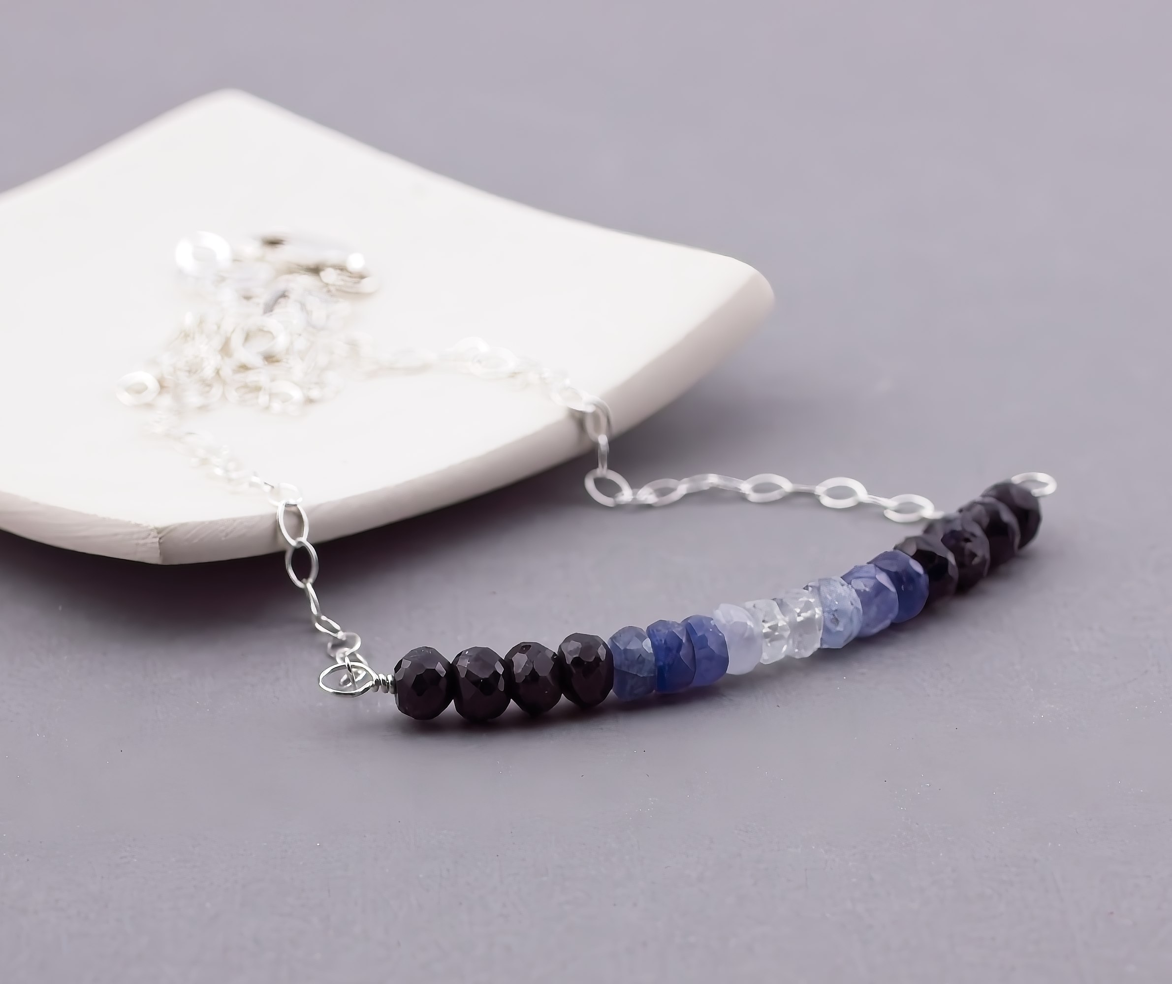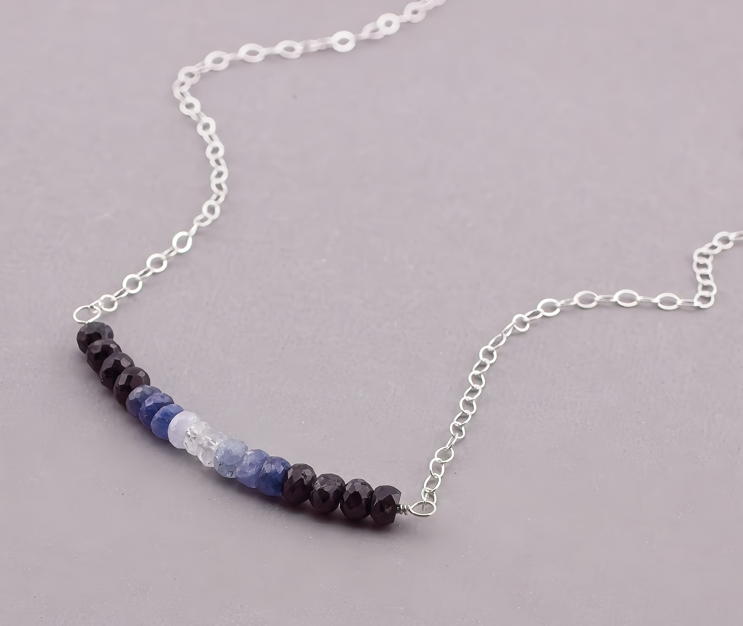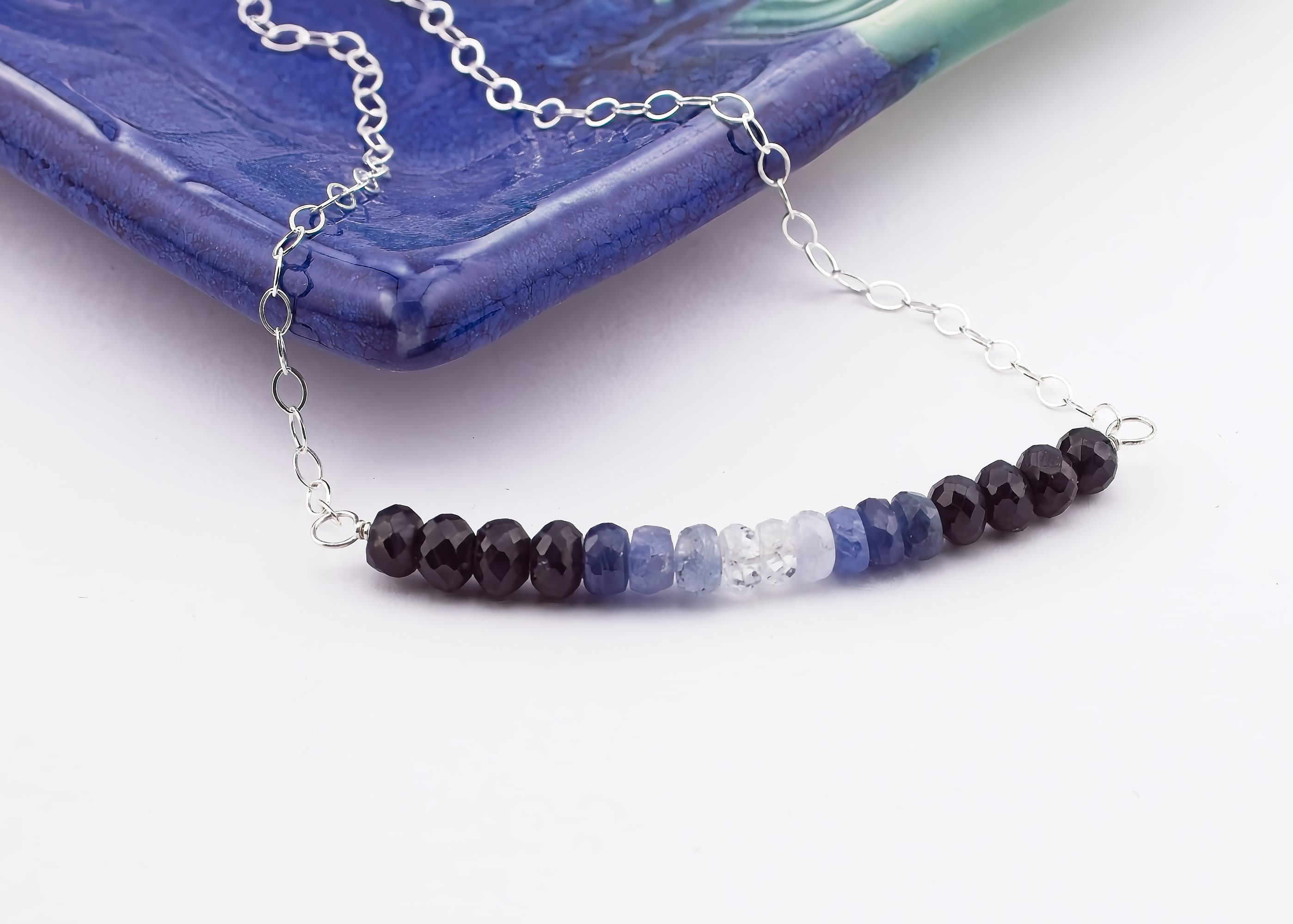 Sparkling and natural blue sapphire necklace with stunning ombre shades of dark and light blue sapphire set off by white sapphire in the middle. These are beautifully faceted beads that catch the light, strung on a gold filled or sterling silver chain. Each shaded gemstone necklace is adjustable and finished with a sturdy gold filled or sterling silver lobster clasp. The stones are 2.5-3.5mm in size.