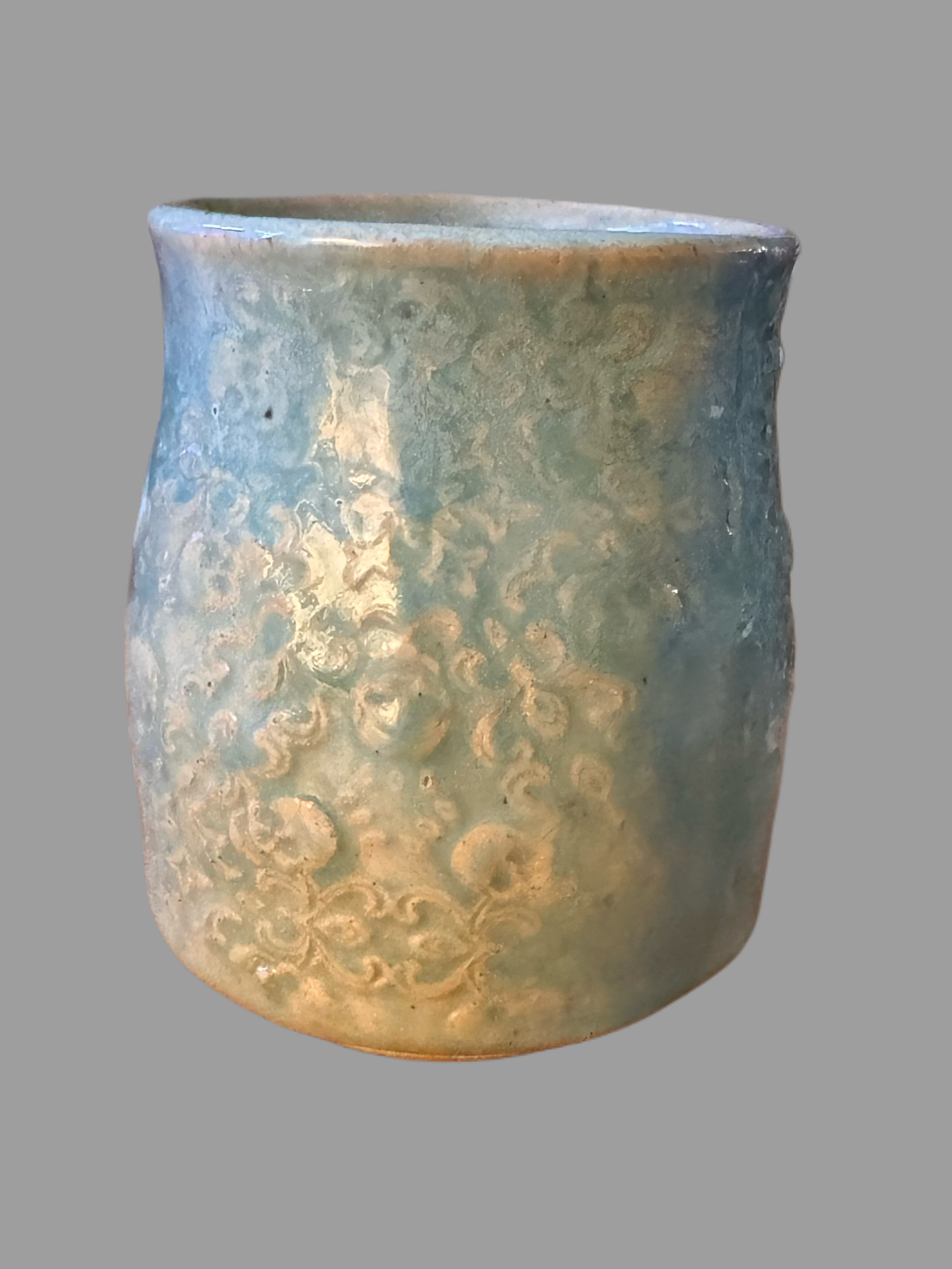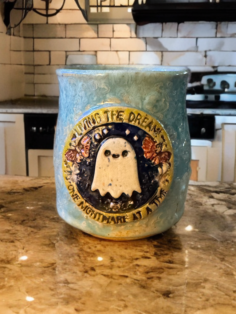 Raise a glass to the spooky side of life with this hand-built One Nightmare at a Time “Booz” Cup. Featuring a cheerful little ghost and the playful phrase “Living the Dream… One Nightmare at a Time,” this textured, sea-blue vessel is perfect for sipping your favorite adult beverage with a wink of humor. Each cup is glazed in layered blues and earthy tones, giving it a dreamy, haunted-sky look.