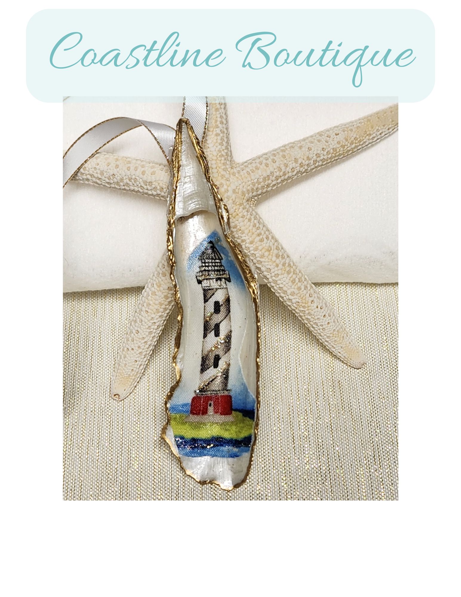 One-of-a-kind- Coastal Lighthouse Christmas - Oyster Shell Ornament