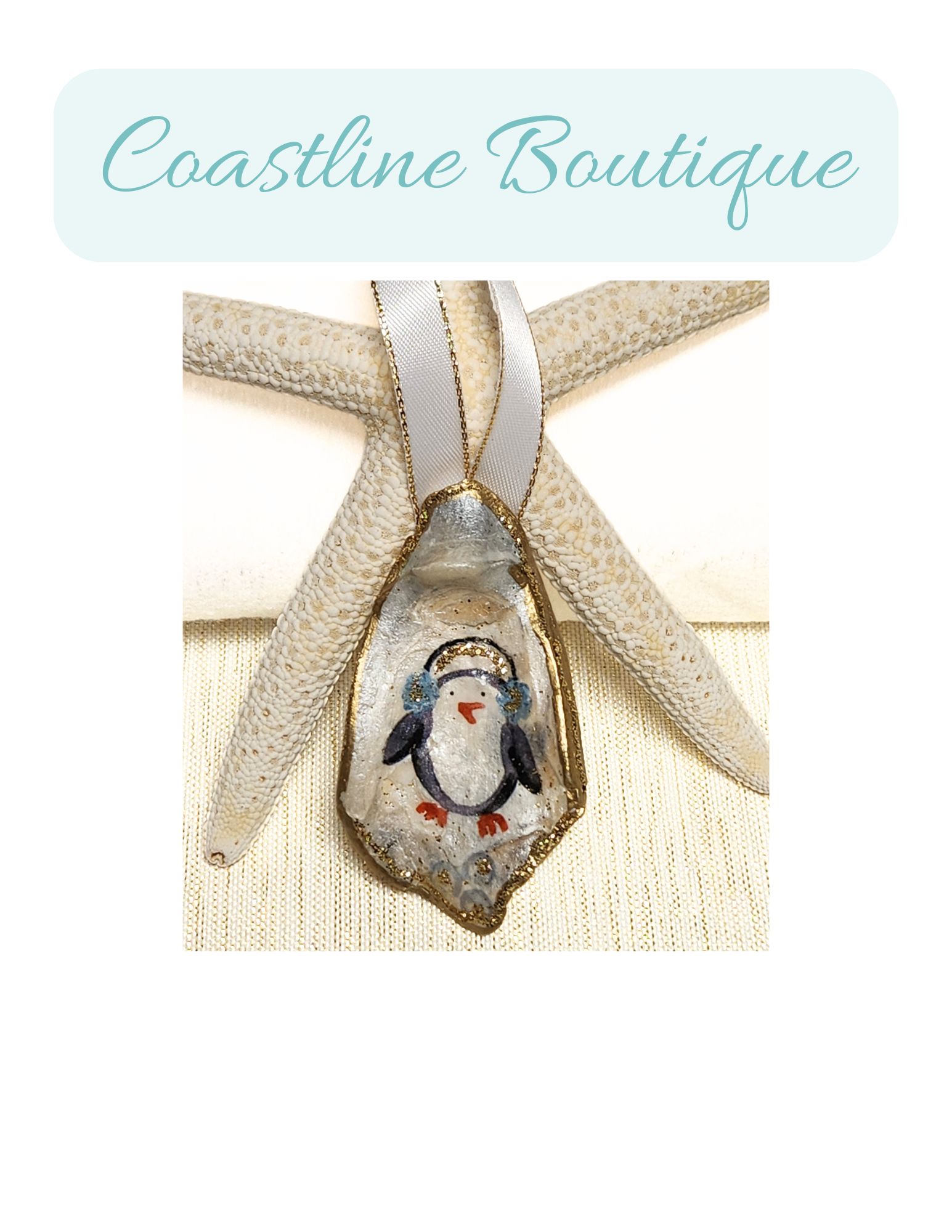 One-of-a-kind- Coastal Penquin Christmas - Small Oyster Shell Ornament