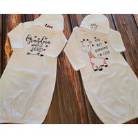 100% Brushed cotton short sleeved onesie with heat press vinyl designs and personalization. All are machine wash and dry. Do not iron directly on the vinyl. Onesie is available in hot pink, navy blue, black, white, or red. Sizes 12 month or 18 months. Just pick your color, design, and name for the perfect gift.