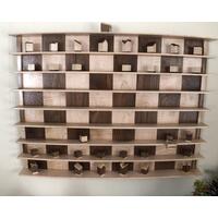 OOAK Wood wall shelf with tree pole and mini landscape diorama. Start off with an oak wood frame and shelf, a lilac wood pole for holding scarves or jewelry, miscellaneous wood scraps and pcs all intricately fit into the top frame. Then add mini buildings, waterfalls, trees, resin river with rocks, and vines to make an adorable diorama. There will never be one made just like this again- what you see on the picture is what you get. 28" wide and 24" tall.