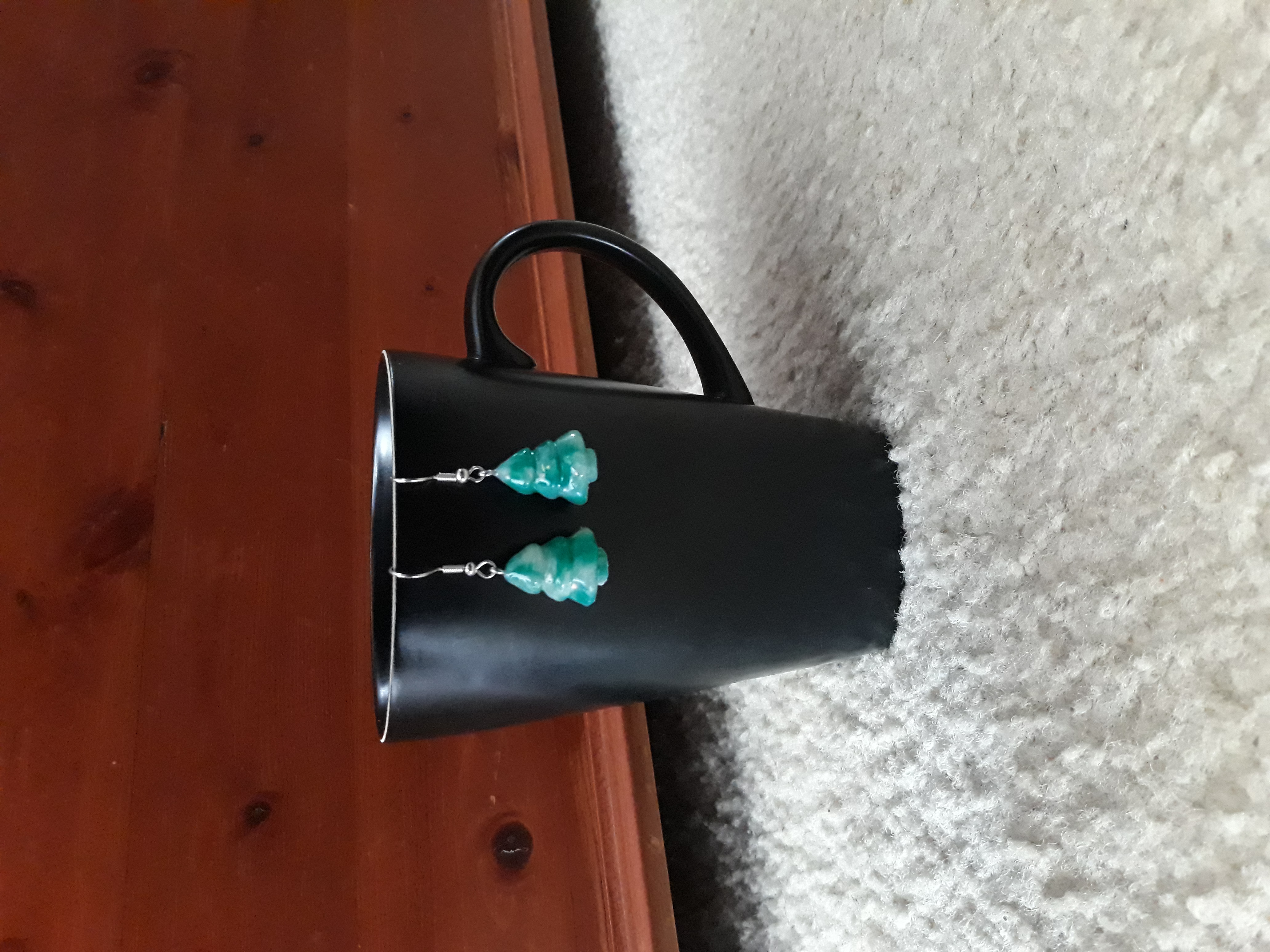 Translucent clay with opaline flecks was chopped up and mixed together, and pressed into a ball and rolled into a 3D tree shape. The baked beads were then coated with UV resin and assembled into earrings.