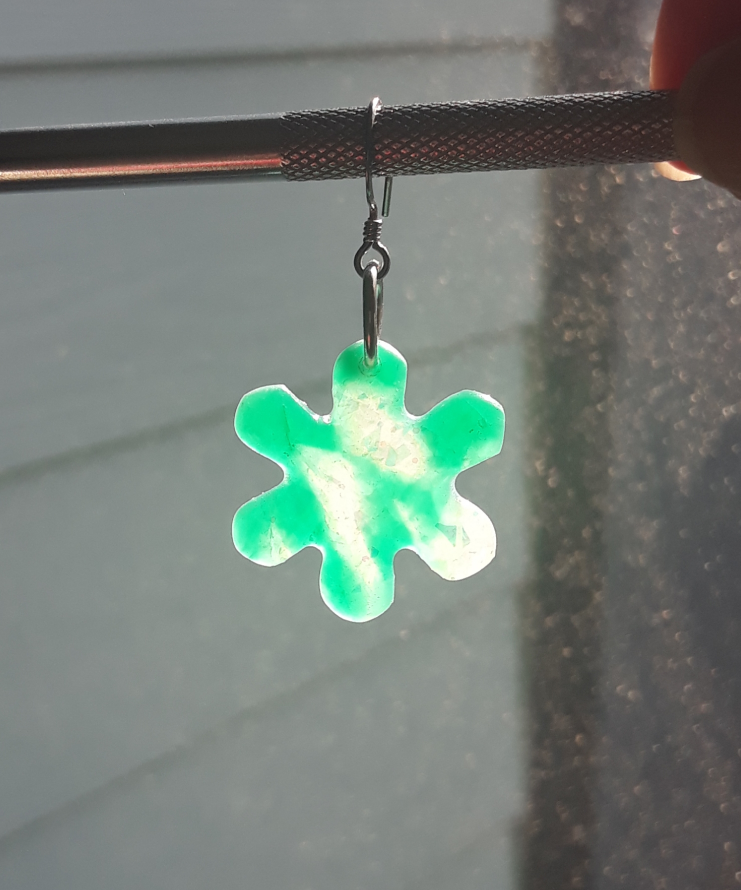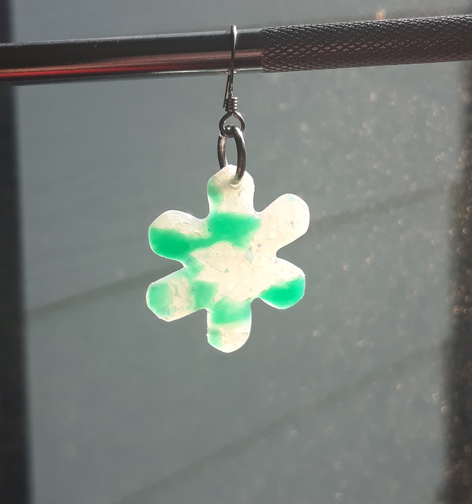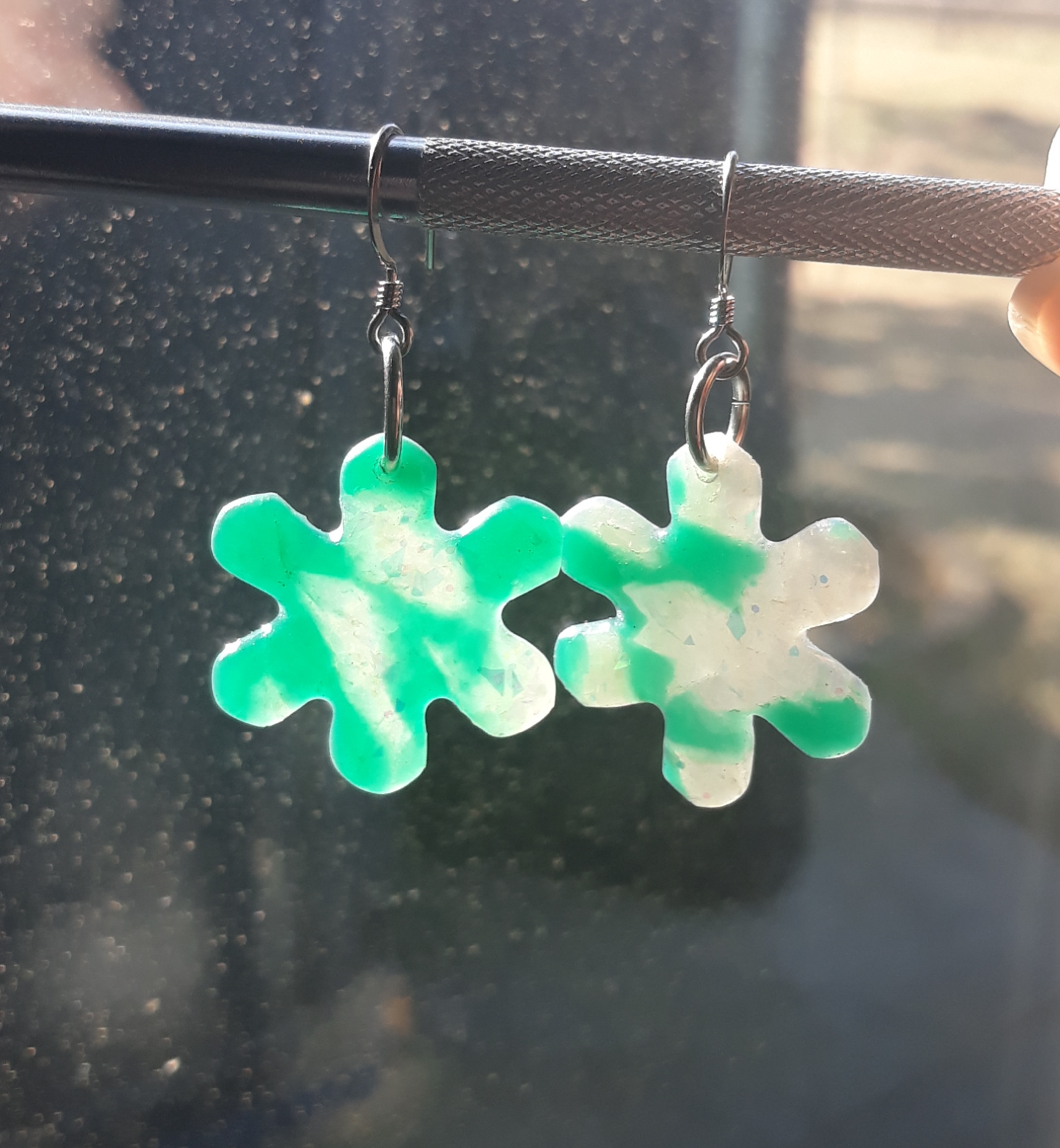 Translucent clay with opaline flecks was chopped up and mixed together, and pressed into a log. The log was then sliced, rolled, cut into shapes and baked. Pieces were then coated with UV resin and assembled into earrings.