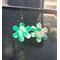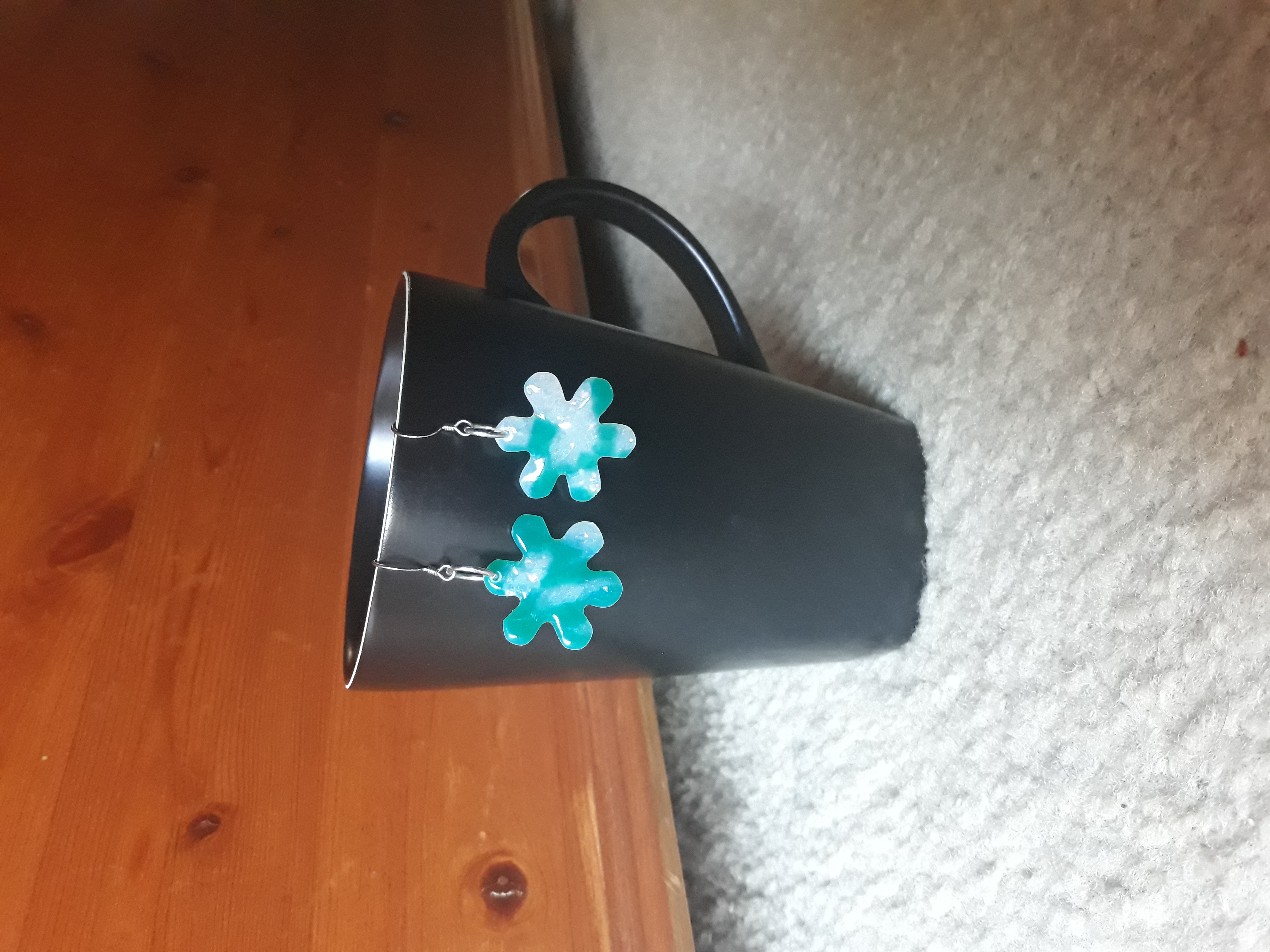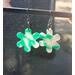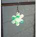 Snowflakes of sparkly opal and translucent green, hung from surgical steel french hook earrings. Seal-coated with UV resin. Overall size is 1.75 inches (45 mm). These glow in the light and are very lightweight.