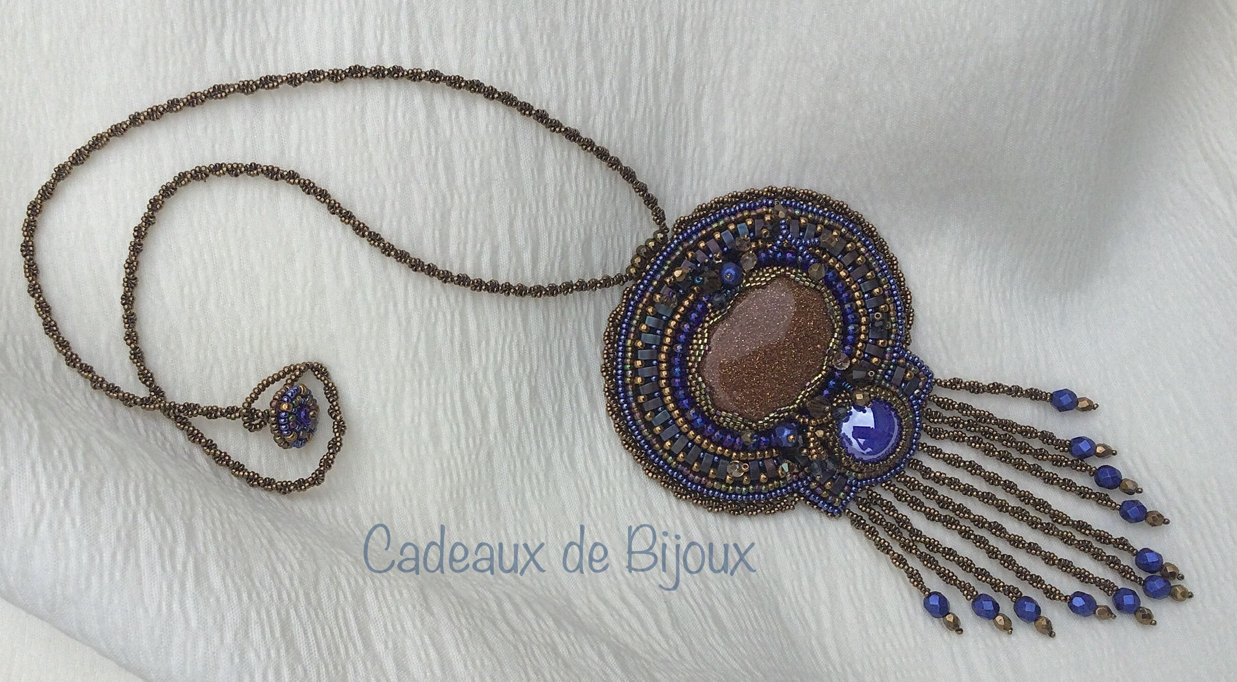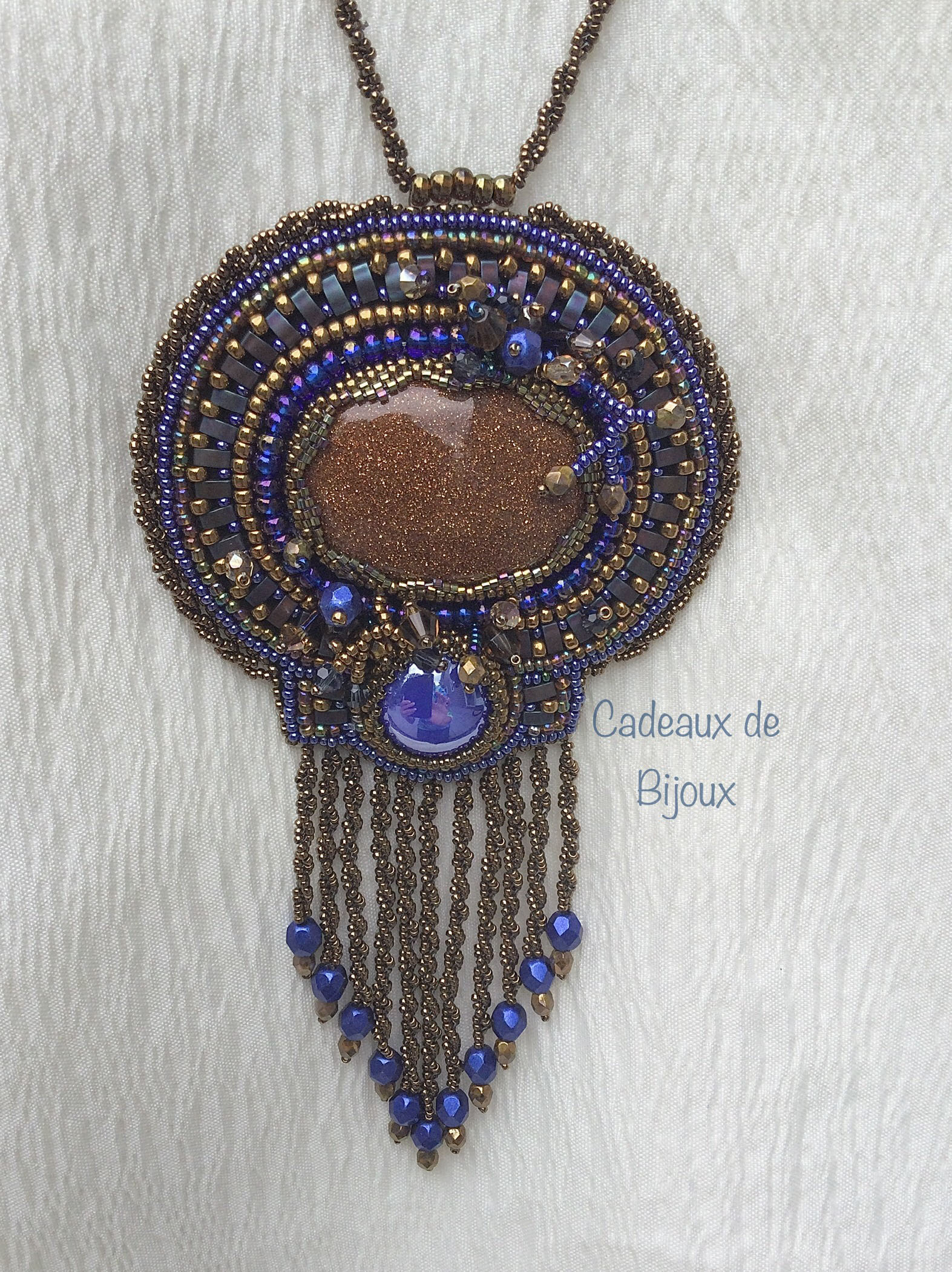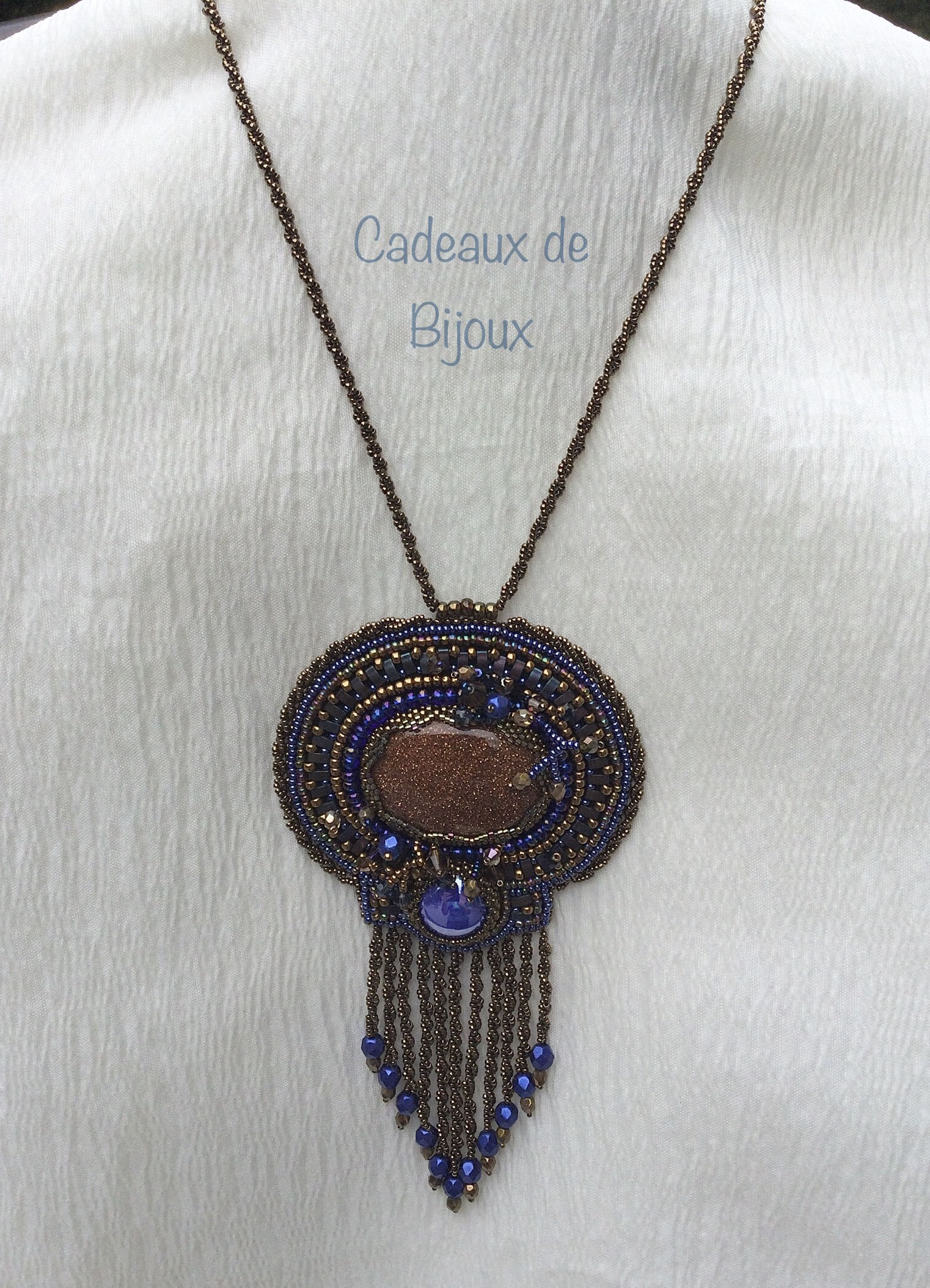 The sparkling Goldstone focal called for complimentary colors opposite on the color wheel. Surrounded by tones of bronze, topaz, cobalt and denim. Plenty of detailed craftsmanship. A striking accent to jeans and leather. Czech, Chinese and Japanese glass beads.
